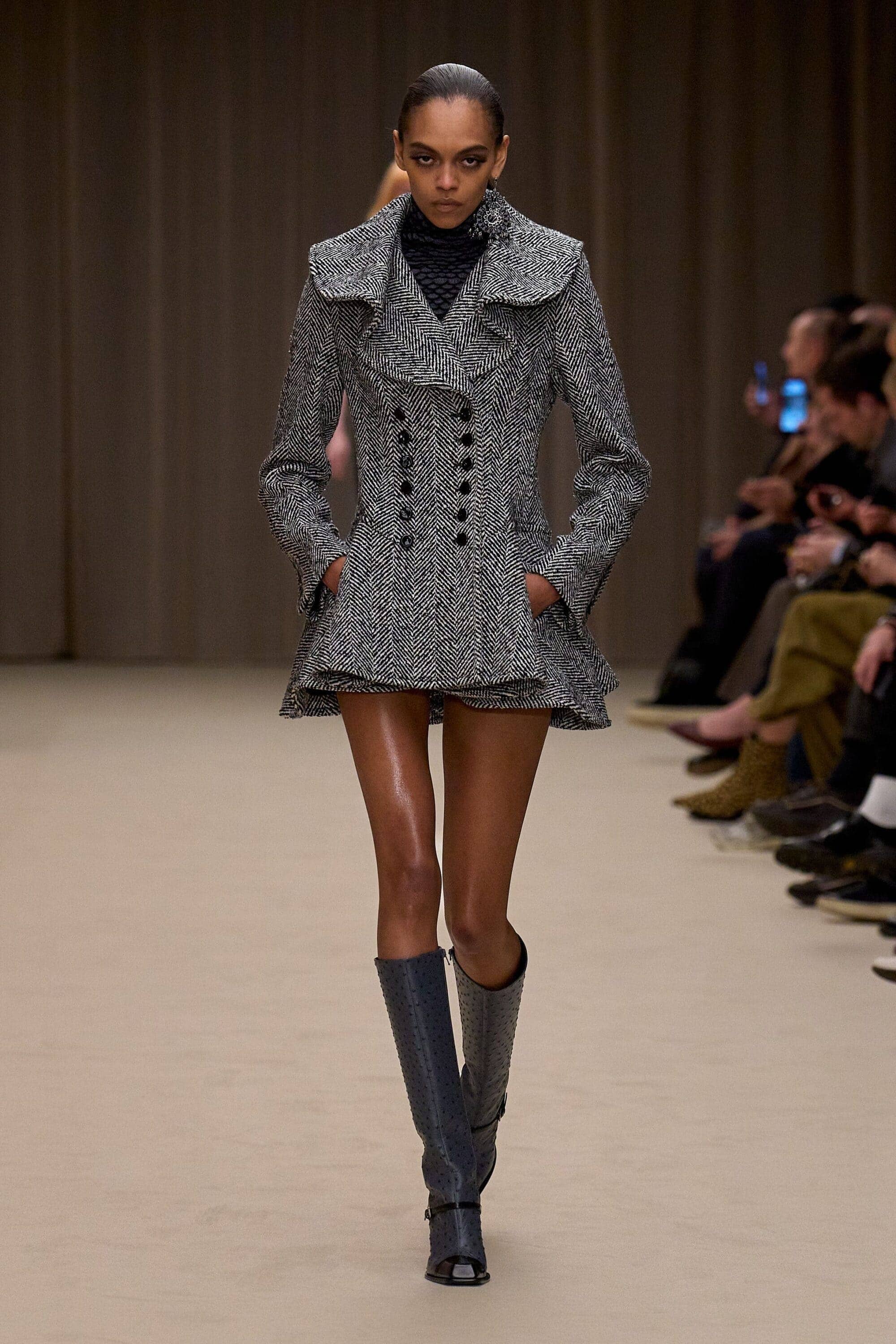 In developing his fall collection, the designer said backstage “I felt like it was really important for me that the girls looked like they dressed themselves. The styling felt personal and not like a new uniform.” This meant shrunken skirt suits that embraced the brands Savile Row heritage worn with knee-high boots, cropped fair isle cardigans and unzipped leather pants, babydoll dresses with ‘pearlescent trench coats’ thrown over, and chainmail armour reimagined as knitwear.