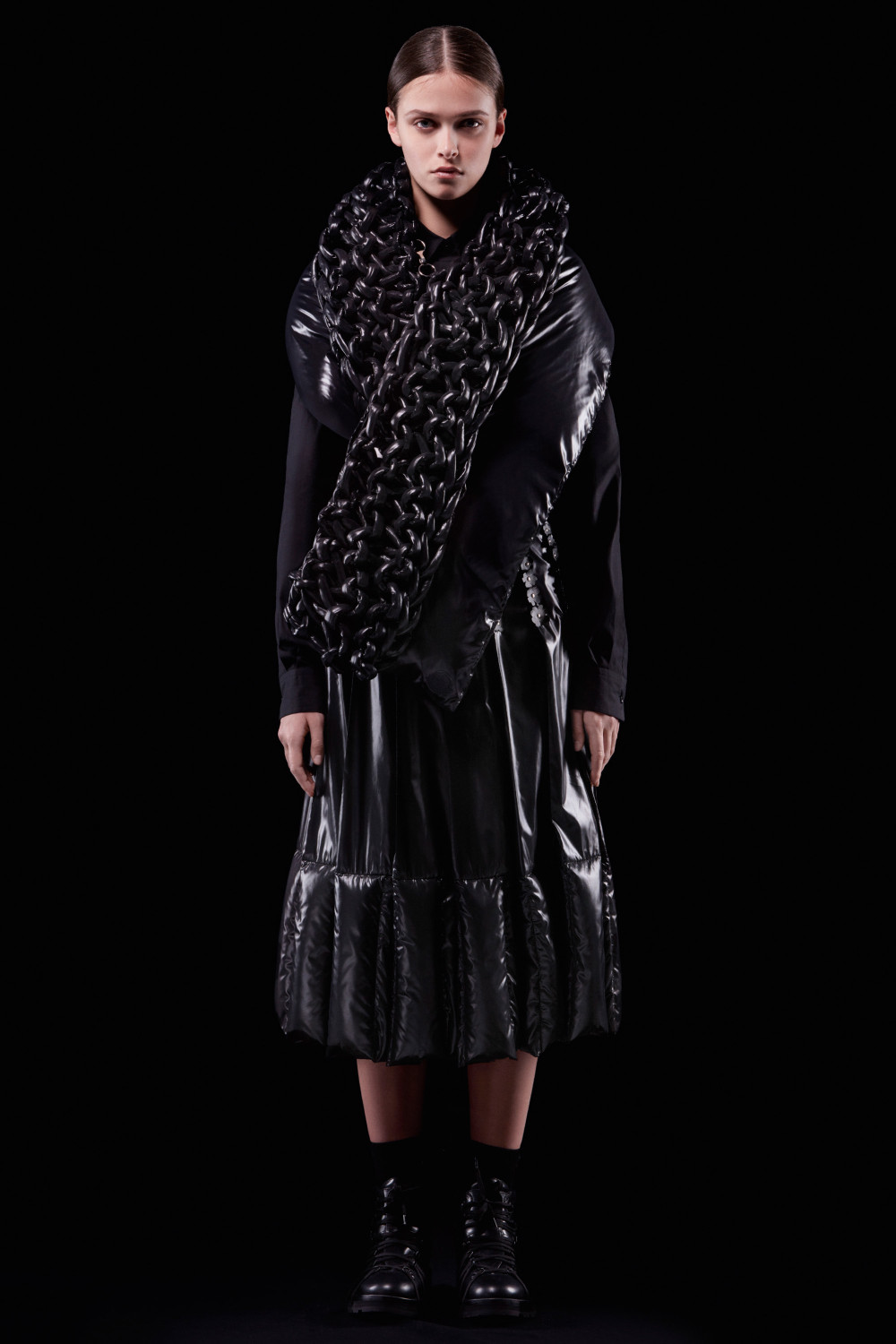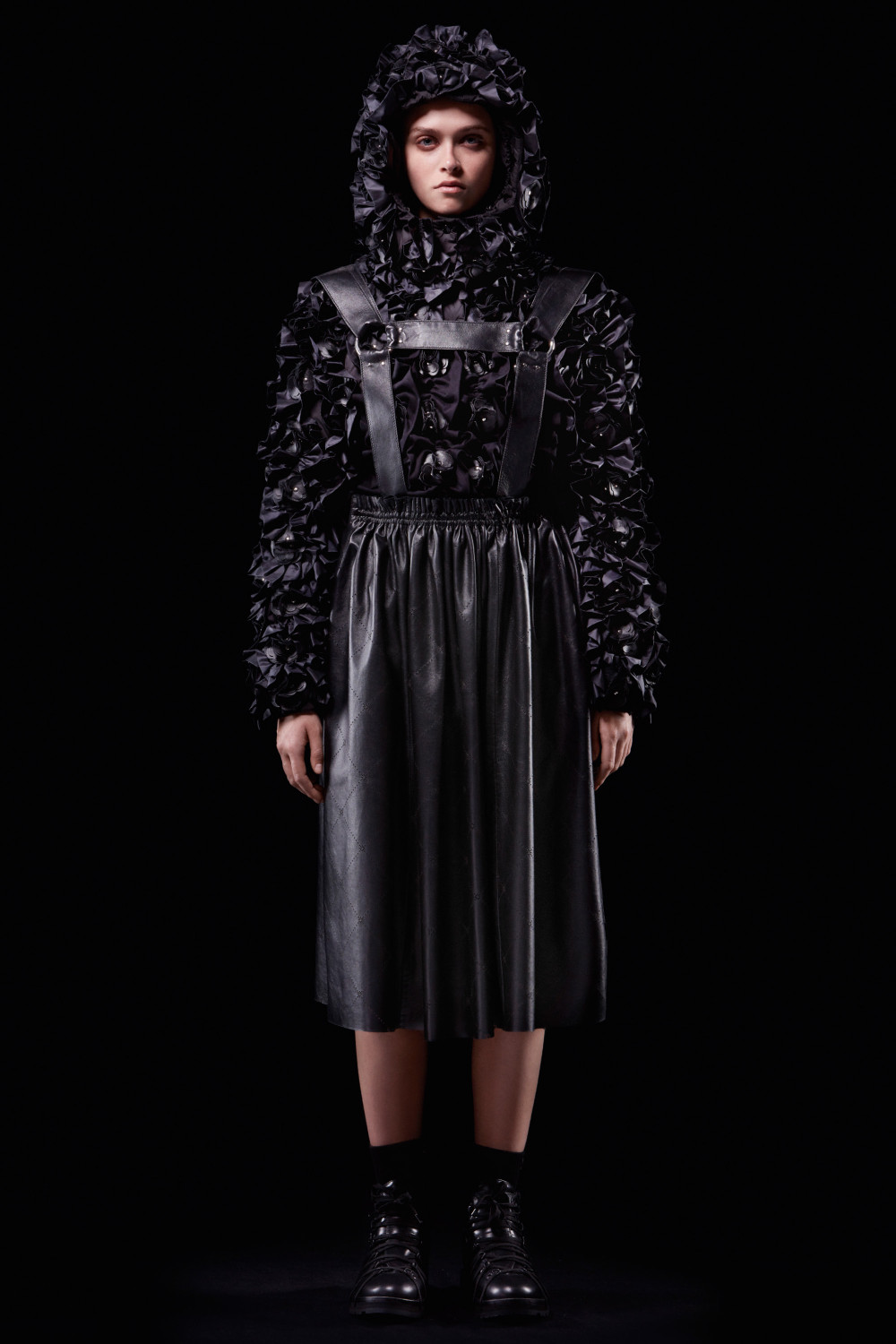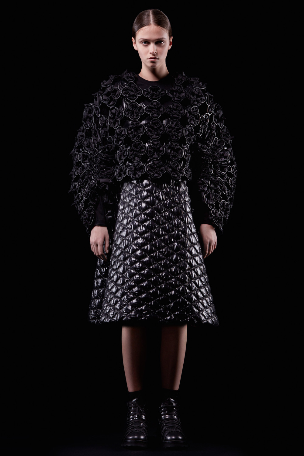 For this second chapter, Kei Ninomiya, one of COMME des GARÇONS‘s youngest sublabels, explored the concept of wearable geometry, and the collection that resulted reflects Ninomiya’s careful eye for intricacy as well as his sense of experimentalism. Working with both nylon and leather, Ninomiya applied painstaking workmanship and fabric experimentalism manipulation. The result? Items that explored both the familiar and the unique and were taken to new heights with Ninomiya’s keen use of intarsia, quilting, stitching, appliqué, and ruffling.