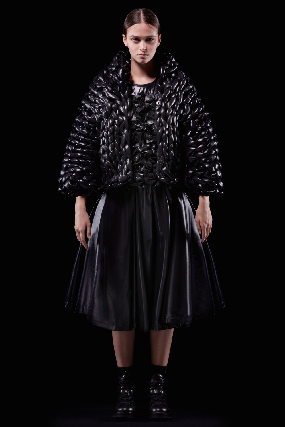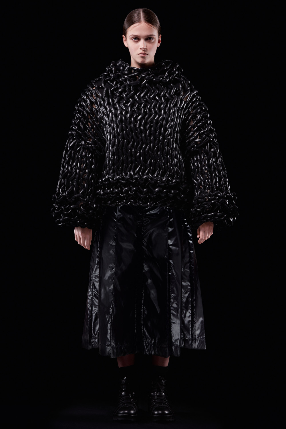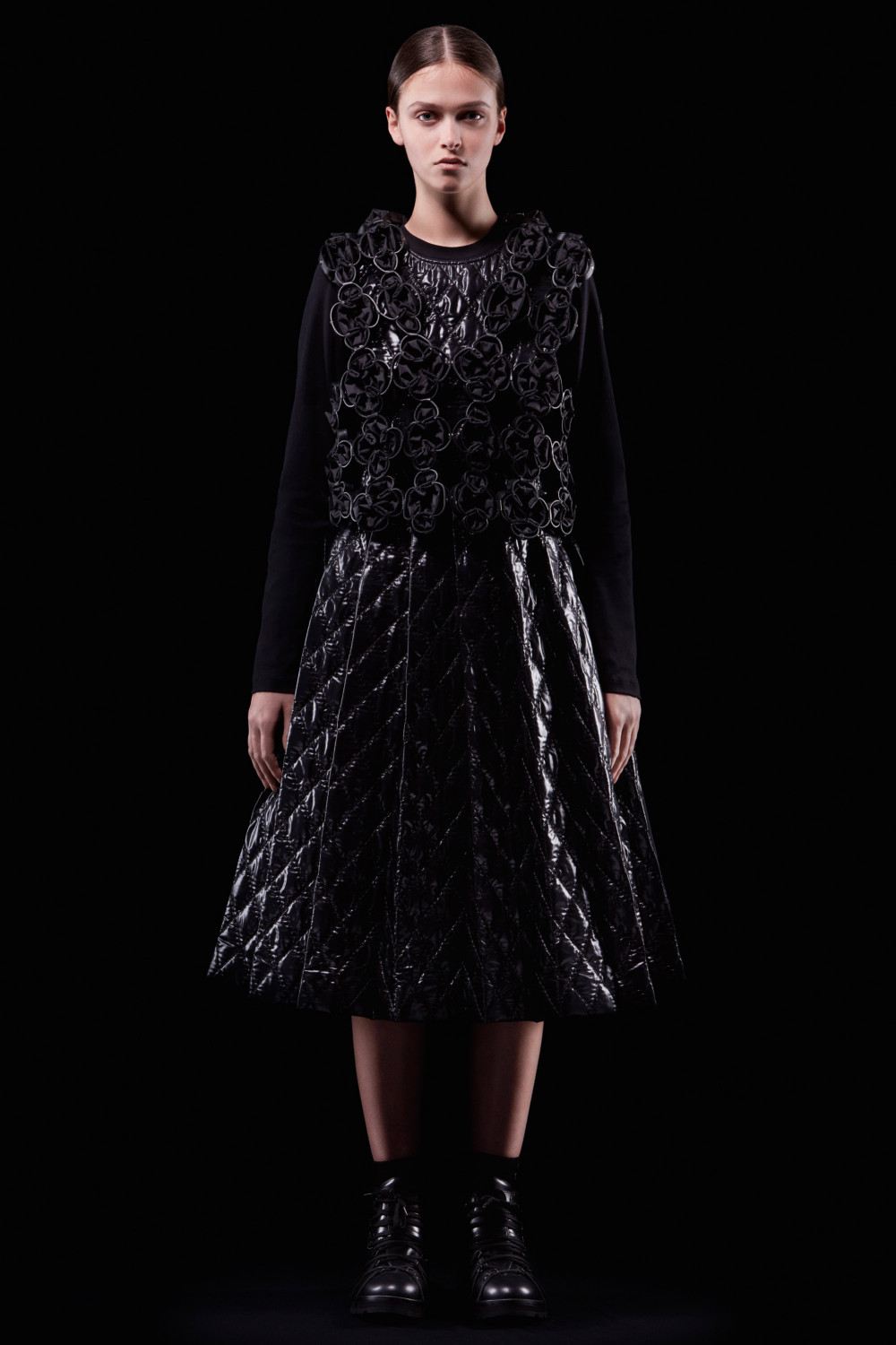 For this second chapter, Kei Ninomiya, one of COMME des GARÇONS‘s youngest sublabels, explored the concept of wearable geometry, and the collection that resulted reflects Ninomiya’s careful eye for intricacy as well as his sense of experimentalism. Working with both nylon and leather, Ninomiya applied painstaking workmanship and fabric experimentalism manipulation. The result? Items that explored both the familiar and the unique and were taken to new heights with Ninomiya’s keen use of intarsia, quilting, stitching, appliqué, and ruffling.