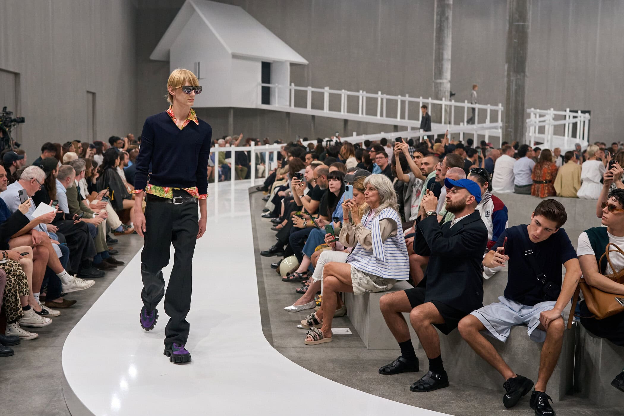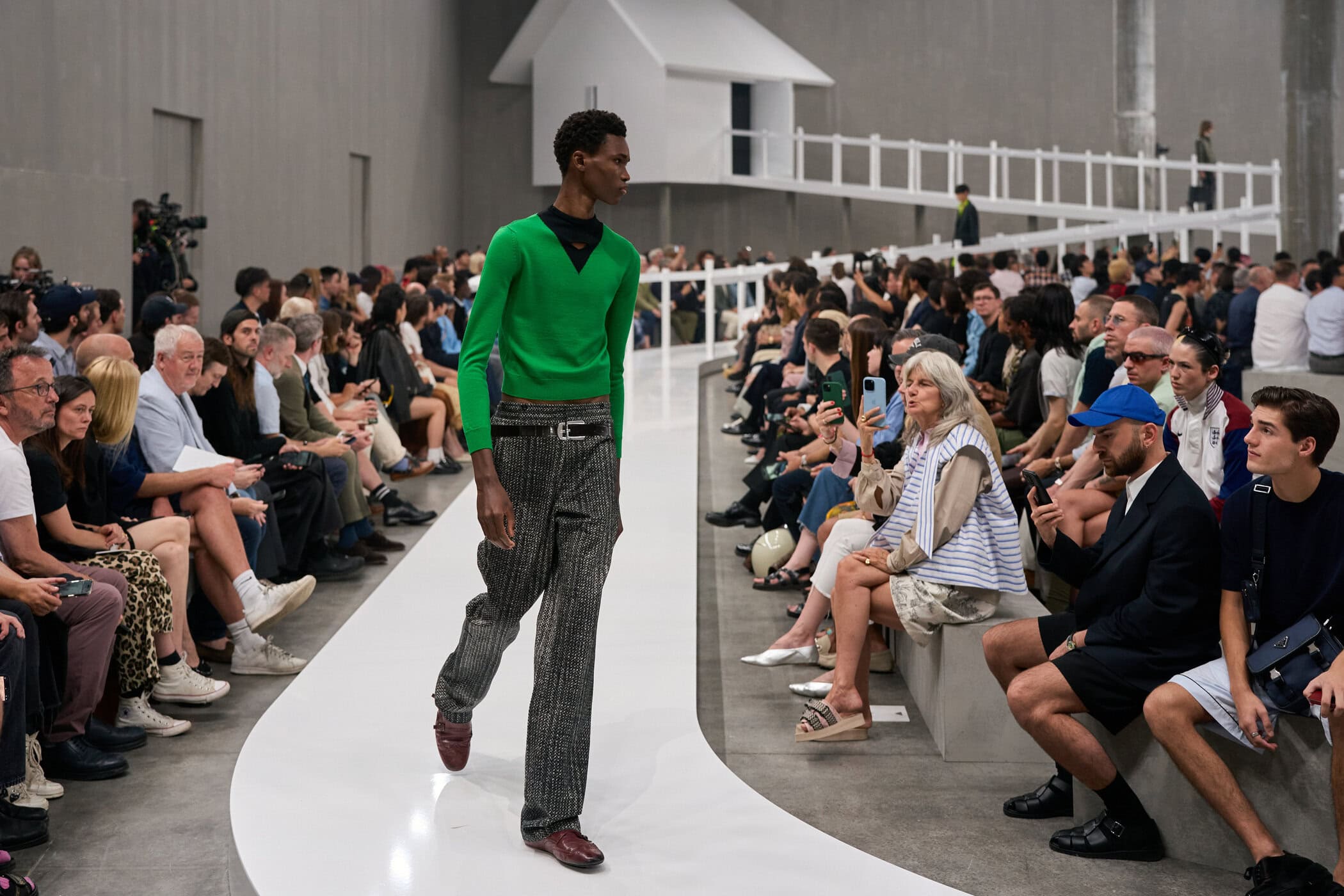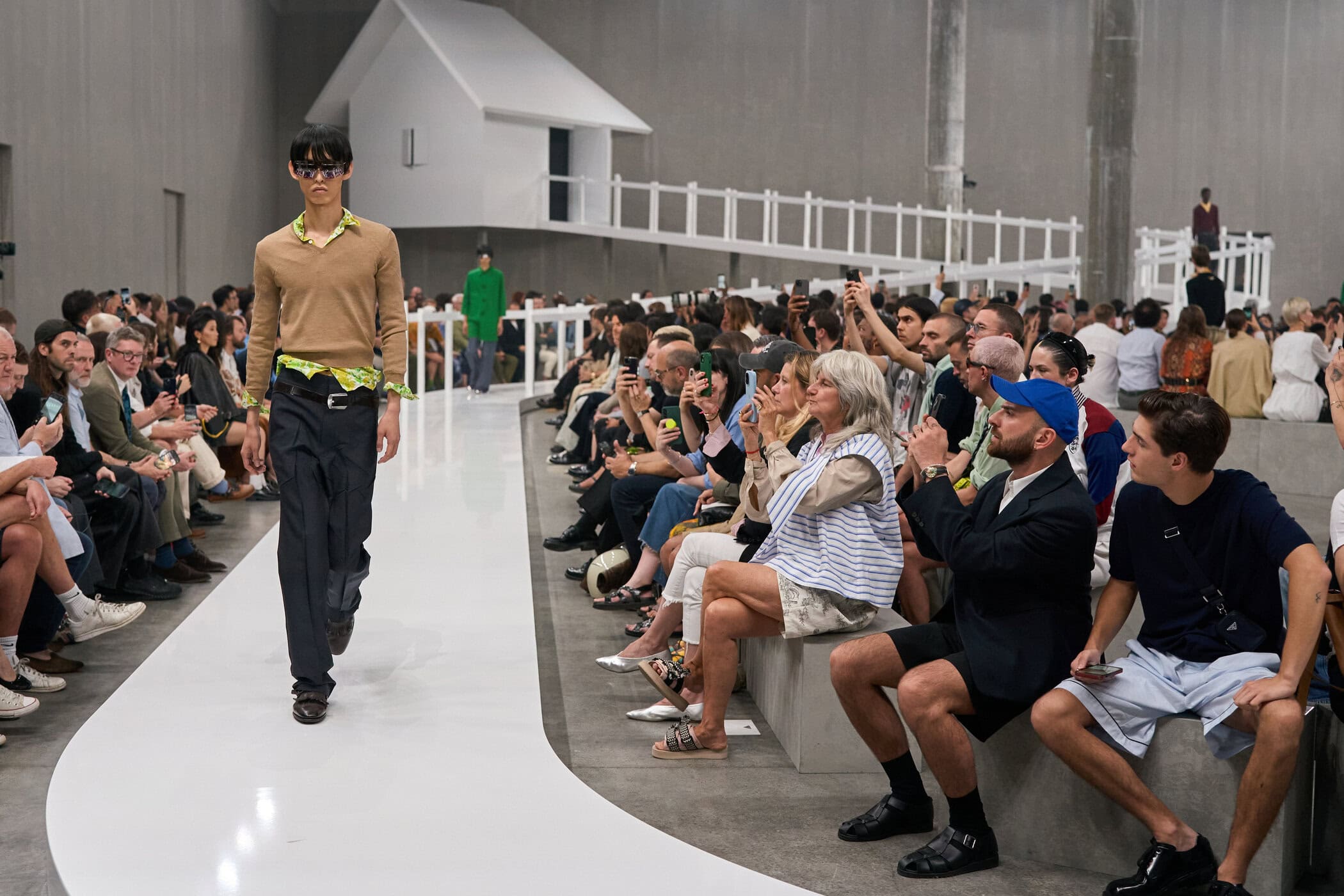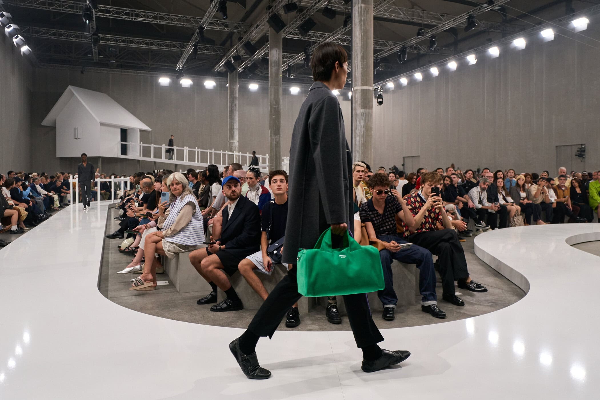 Discover the immersive atmosphere and striking staging of Prada‘s Spring 2025 men’s fashion show at Milan Men’s Fashion Week, creating an unforgettable mood this June.