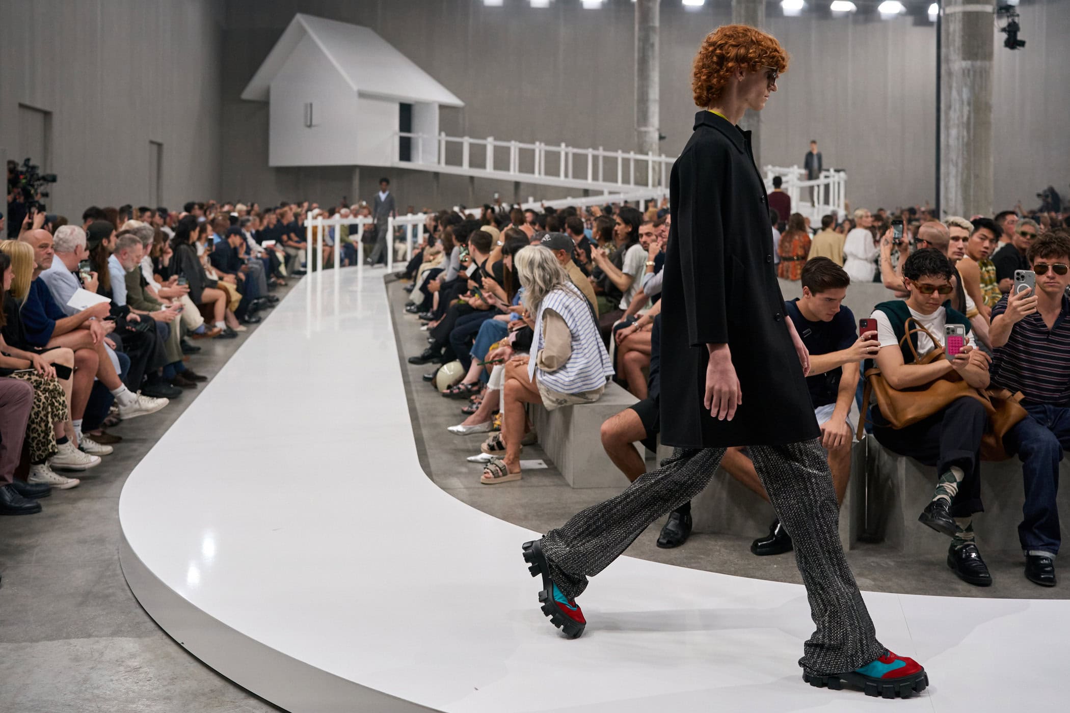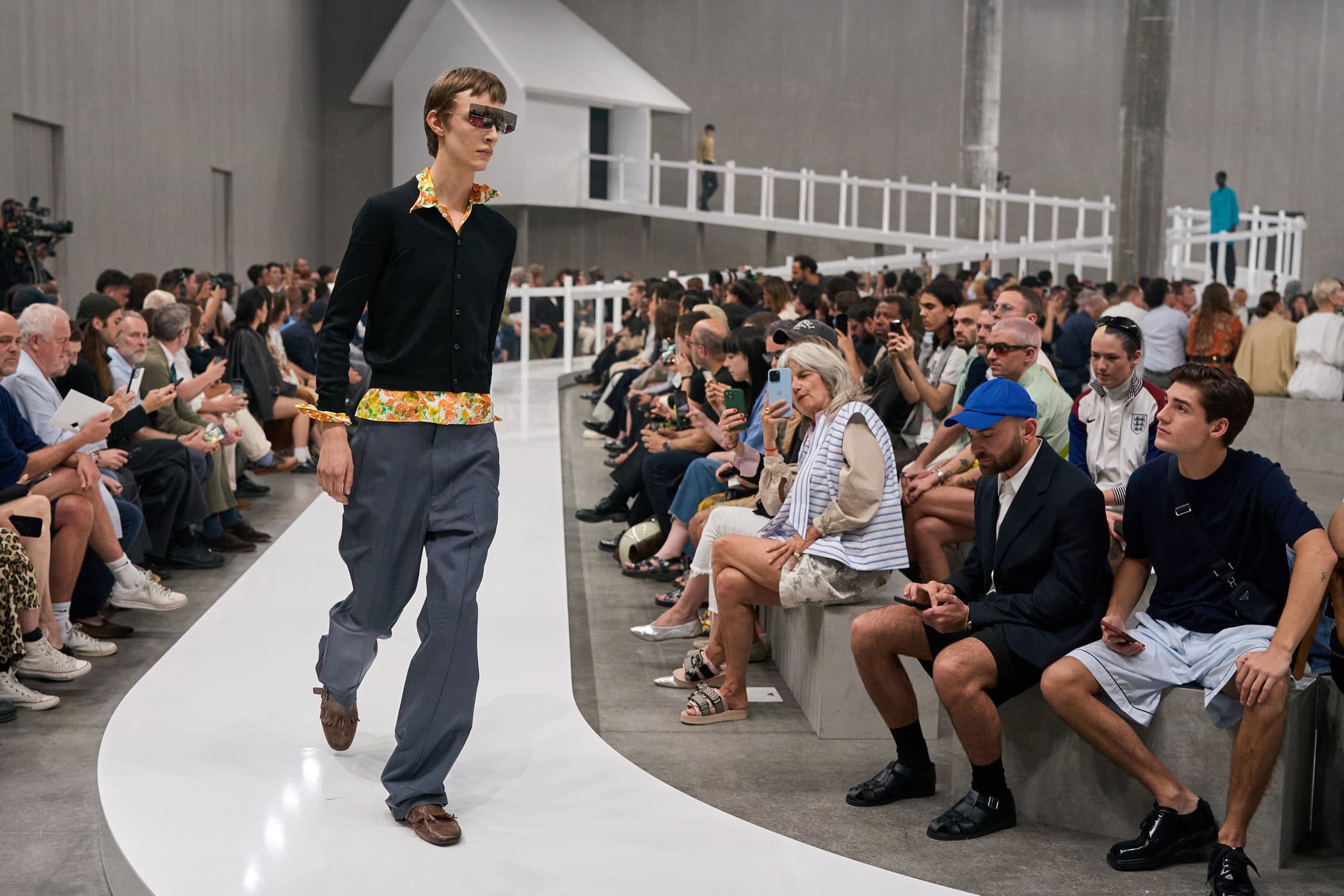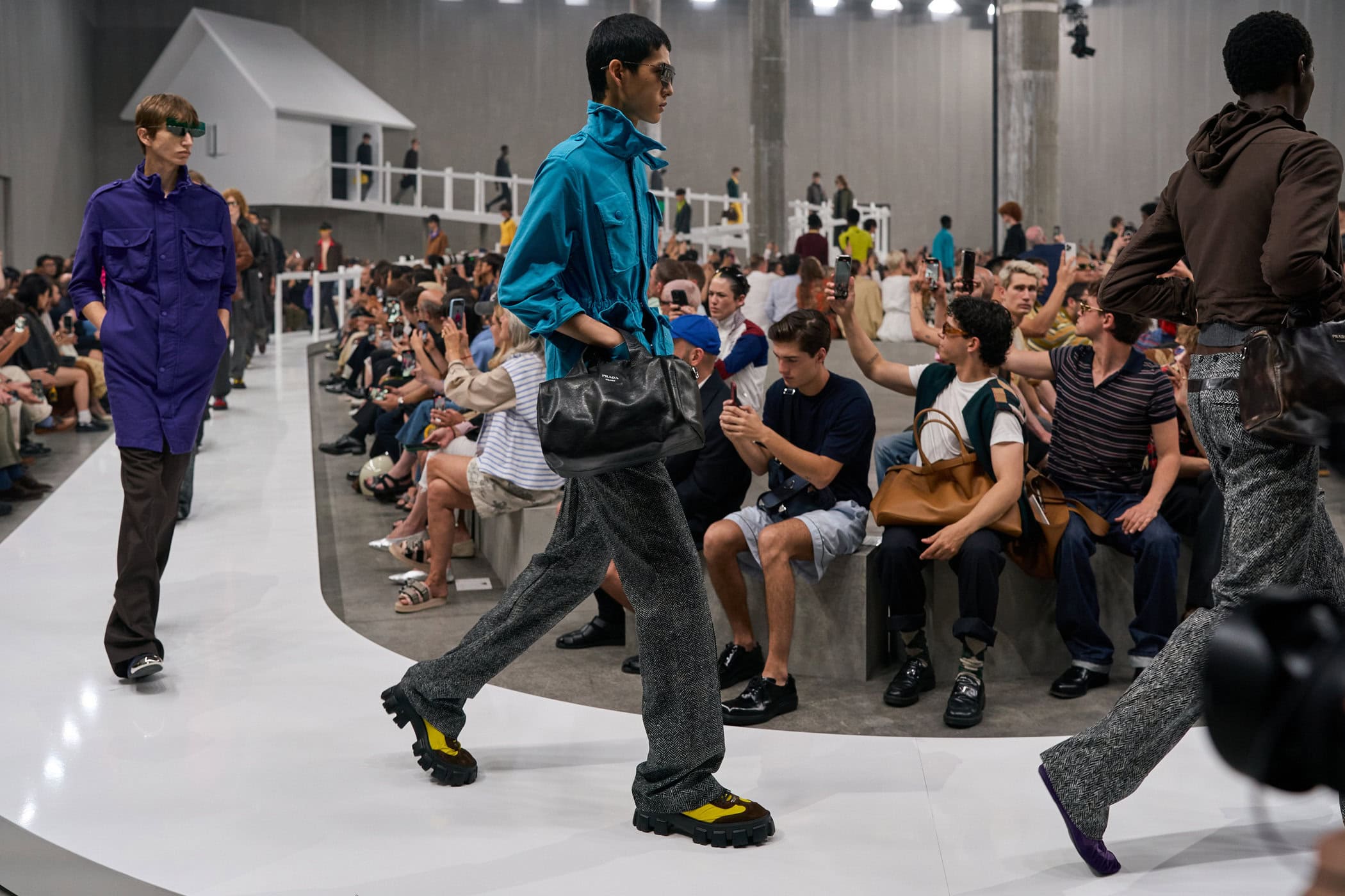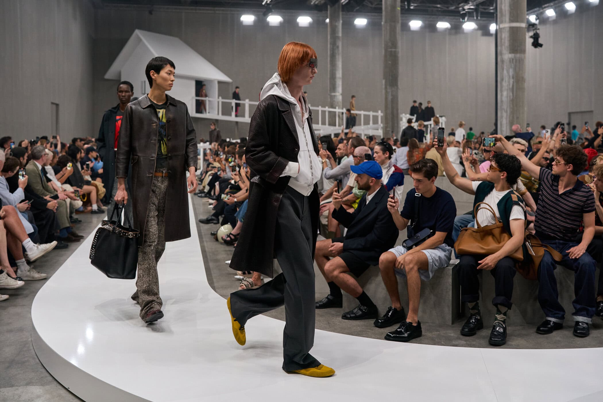 Discover the immersive atmosphere and striking staging of Prada‘s Spring 2025 men’s fashion show at Milan Men’s Fashion Week, creating an unforgettable mood this June.