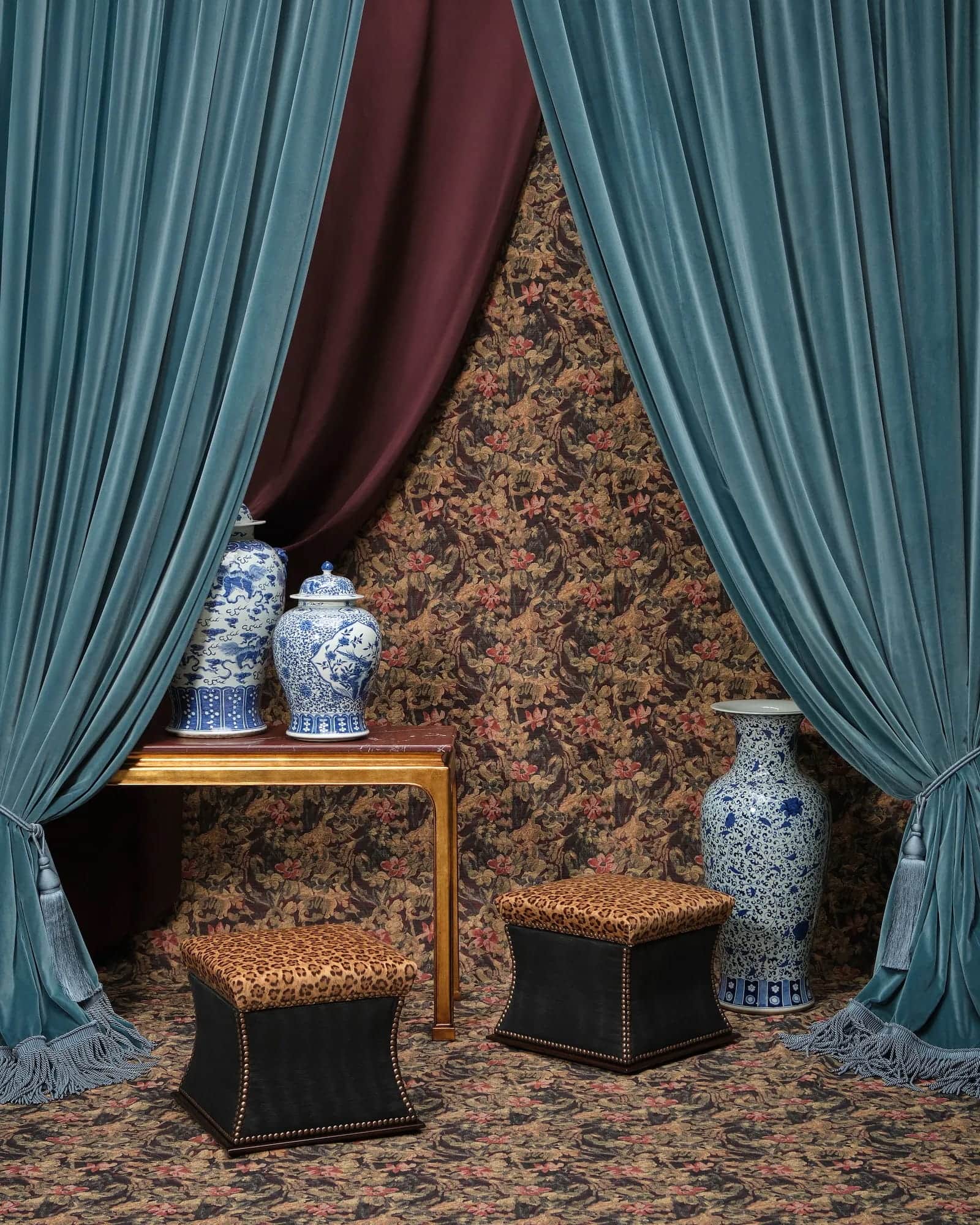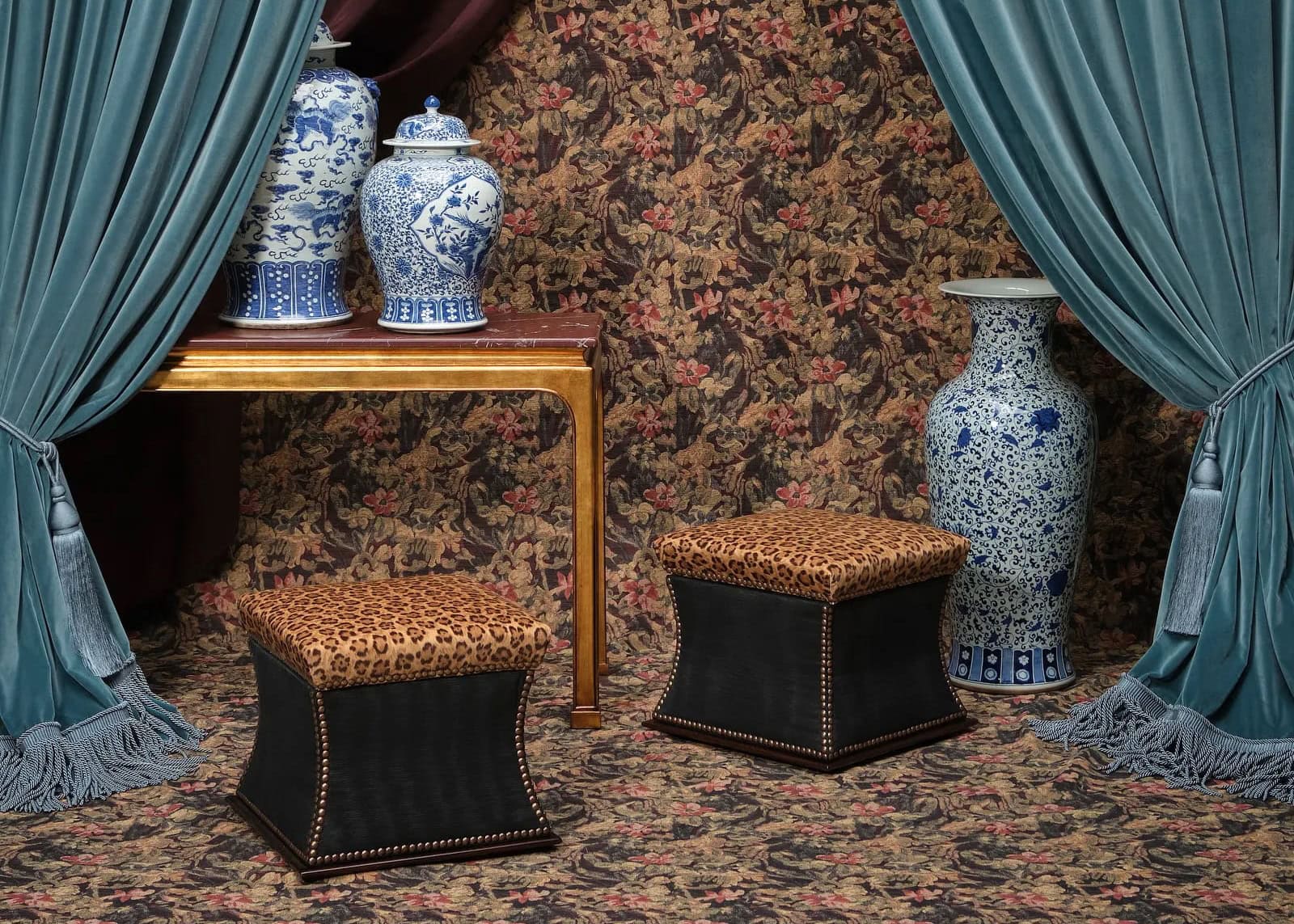Saddlebrook draws on the atmosphere of a heritage country estate, combining oak paneling, rich textiles, and layered patterns including florals, plaids, and leopard motifs. Furniture silhouettes balance historical references with contemporary refinement, from mahogany dining tables to four-poster beds crafted with traditional techniques. The collection emphasizes warmth and intimacy, positioning the home as a space for gathering and continuity.