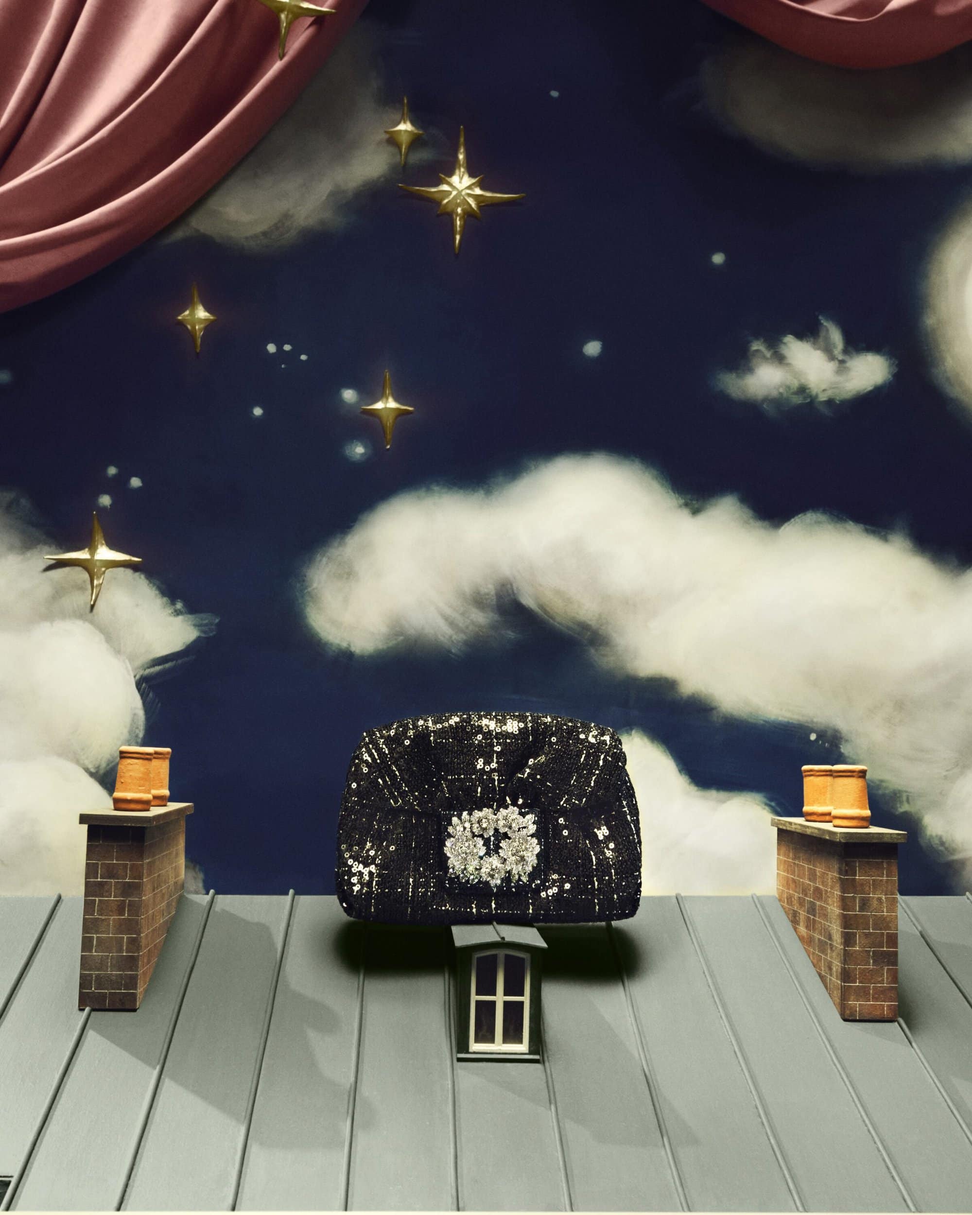 Each image feels like a scene from a festive dream. The camera moves through courtyards, balconies, and rooftops of the maison as though wandering through a cinematic snow globe. The Belle Vivier and I Love Vivier pumps shimmer beneath lamplight, their crystal buckles reflecting the warm glow of imagined holiday evenings. The iconic Jewel Heels, Efflorescence stilettos, and rosette-embellished bags appear suspended between realism and reverie — gifts awaiting discovery in a world where every window is aglow and every reflection glitters back a little bit of Parisian magic.