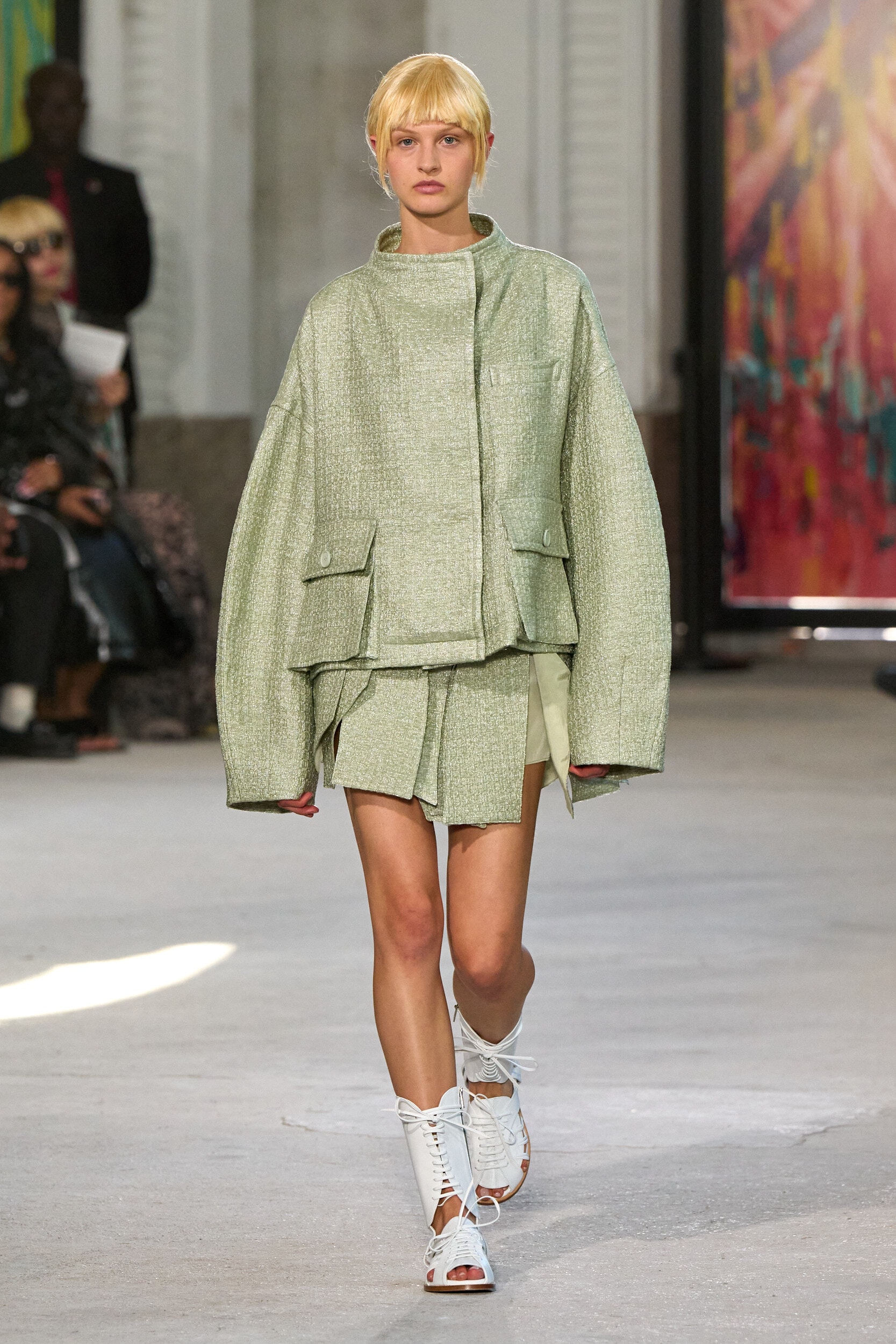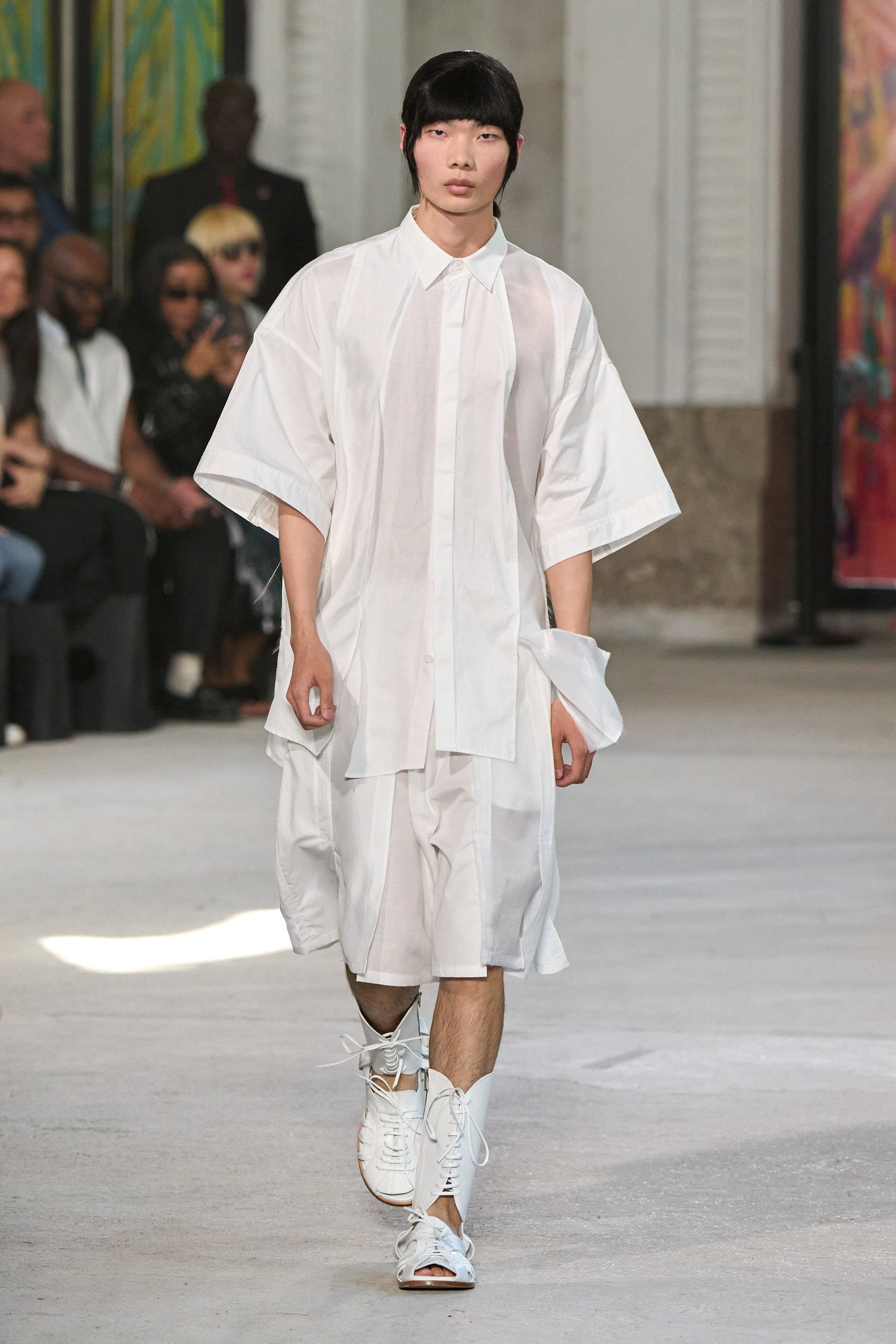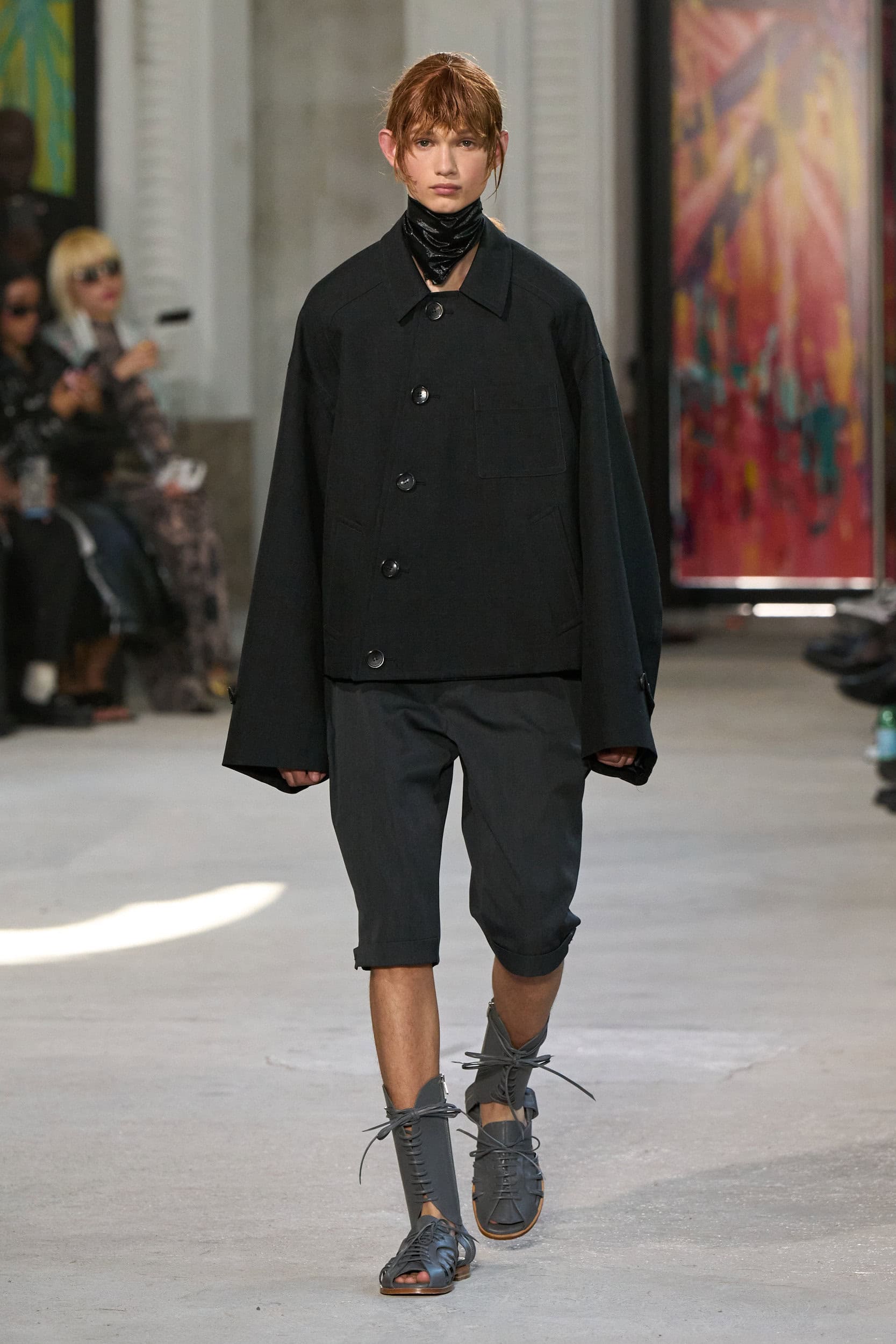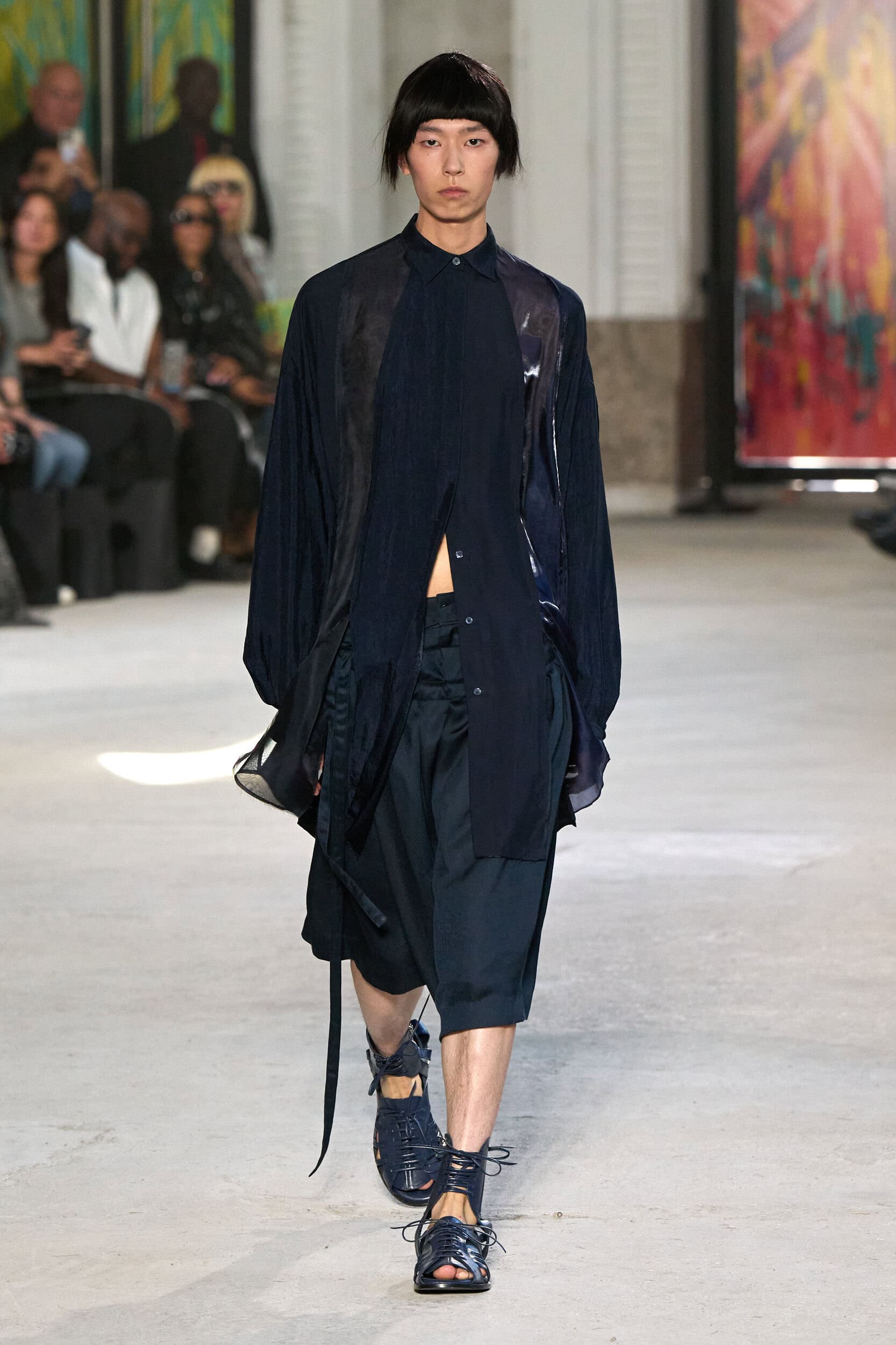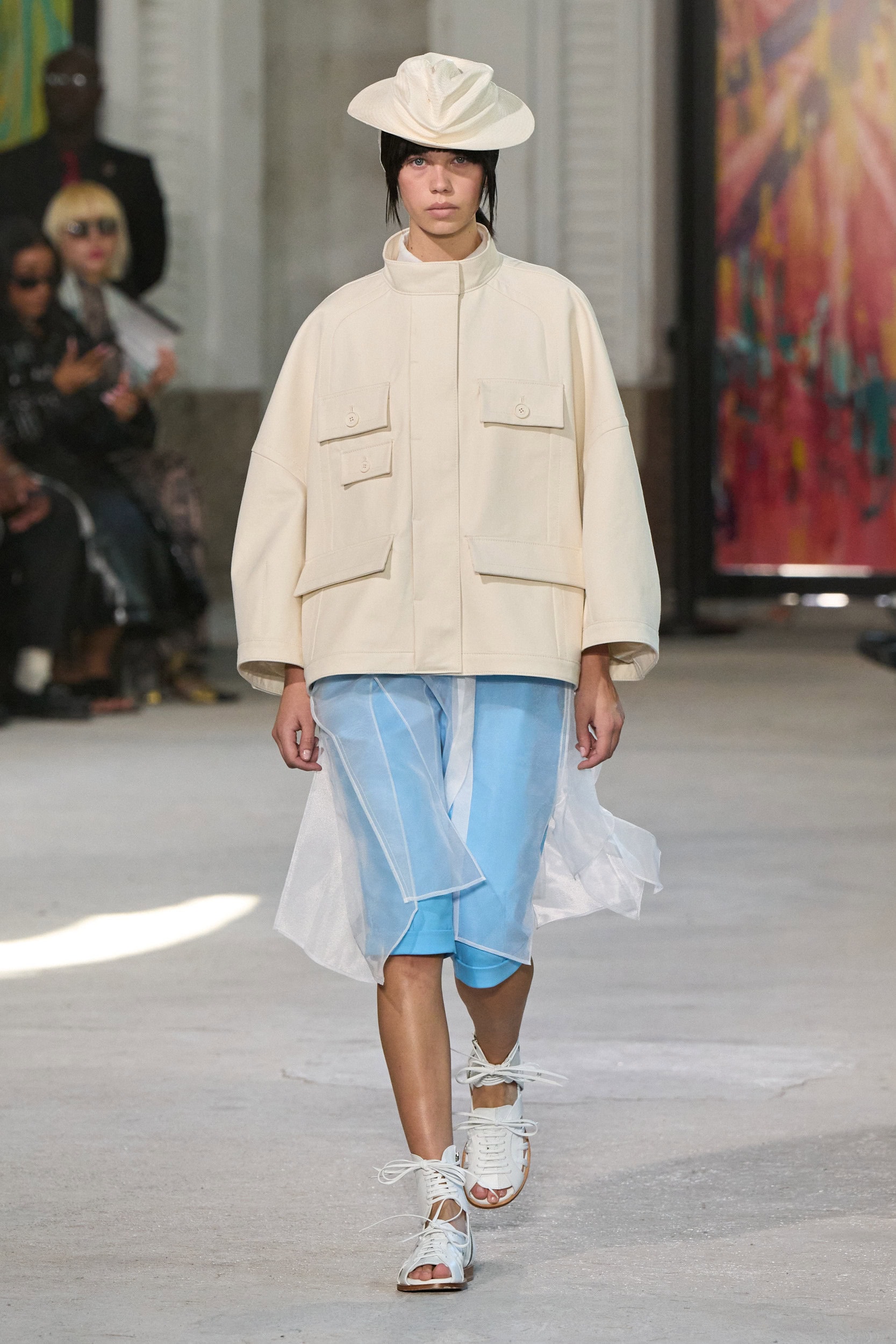 The runway showcased high-collar windbreakers, oversized blazers, workman’s jackets, blousons with asymmetrical necklines, and wide-cropped trousers or tailored shorts – blending East-meets-West influences that Song enjoys playing with. Cut from lightweight fabrics like silk, organza, or mesh, the pieces felt breezy and generous.