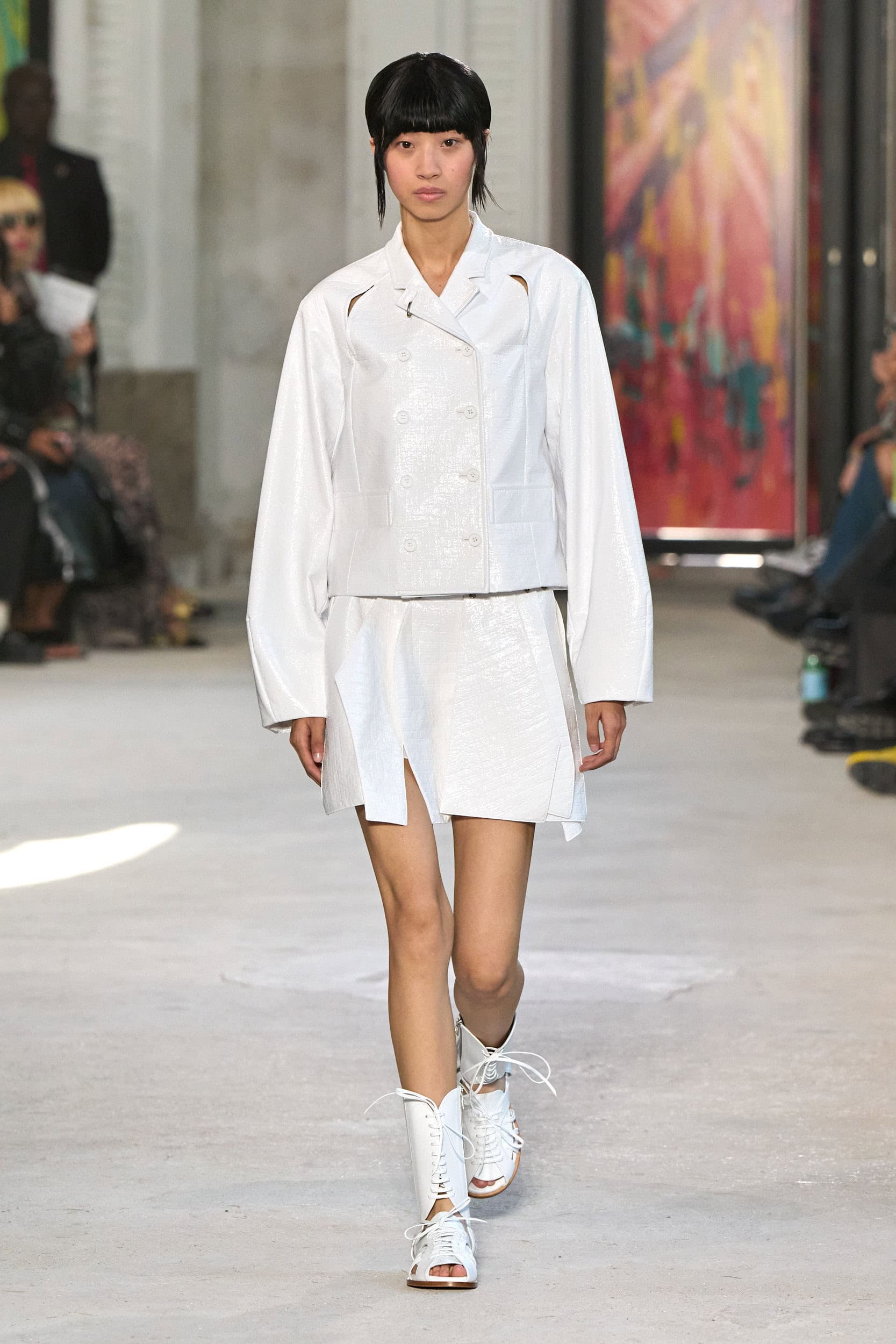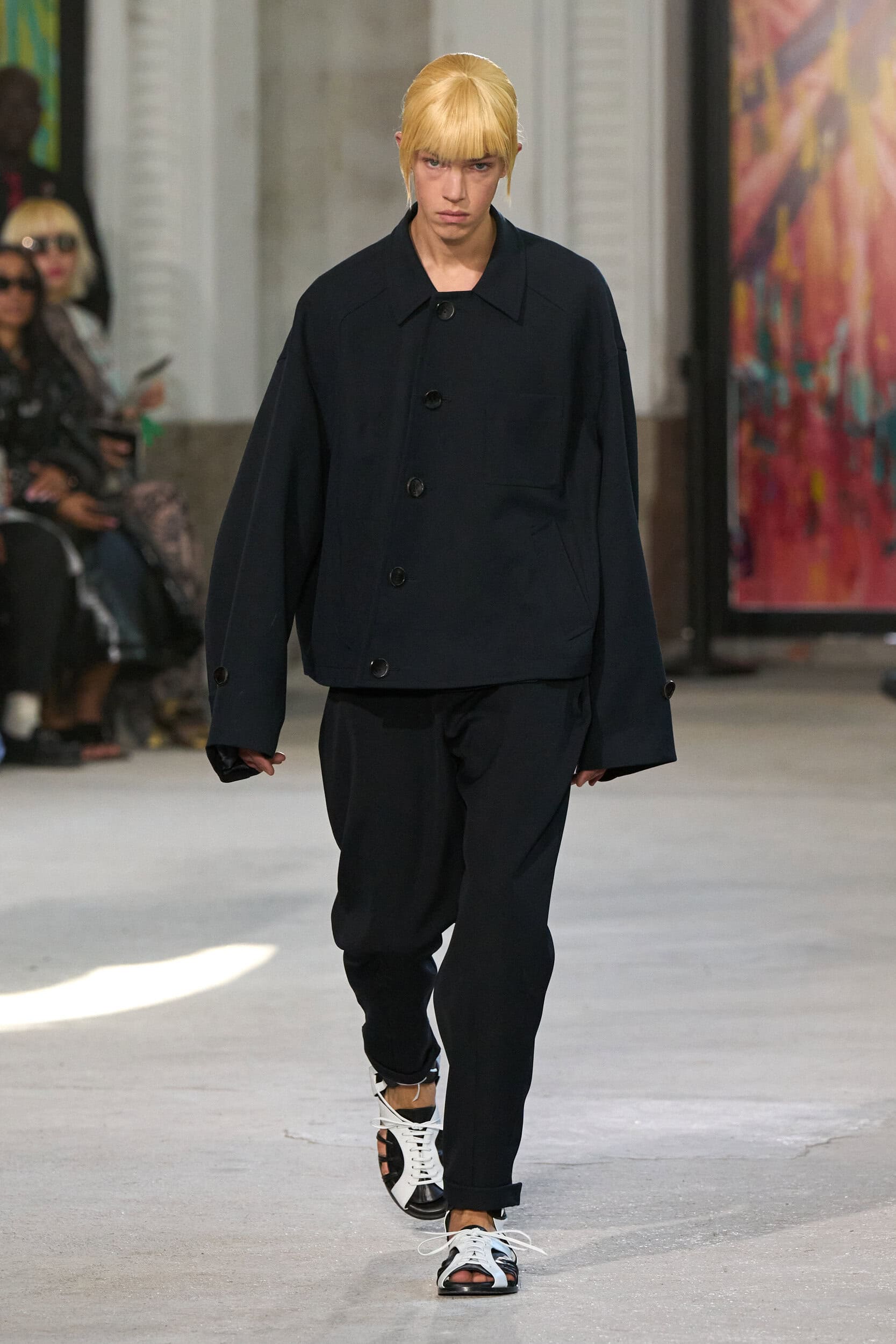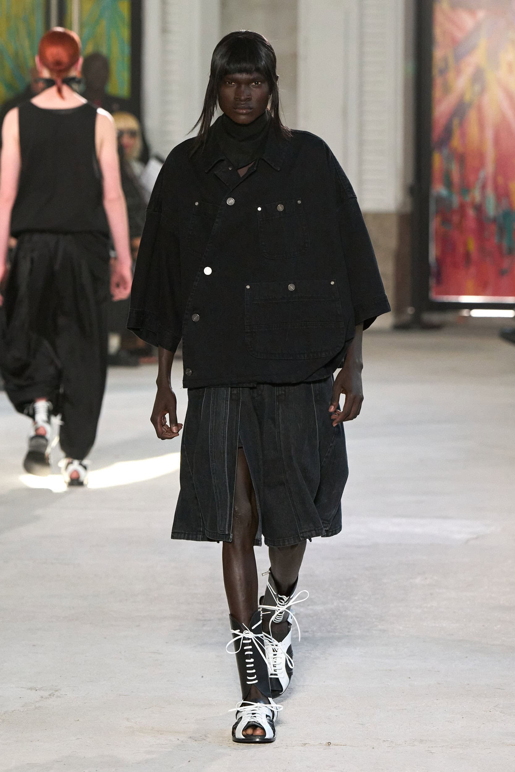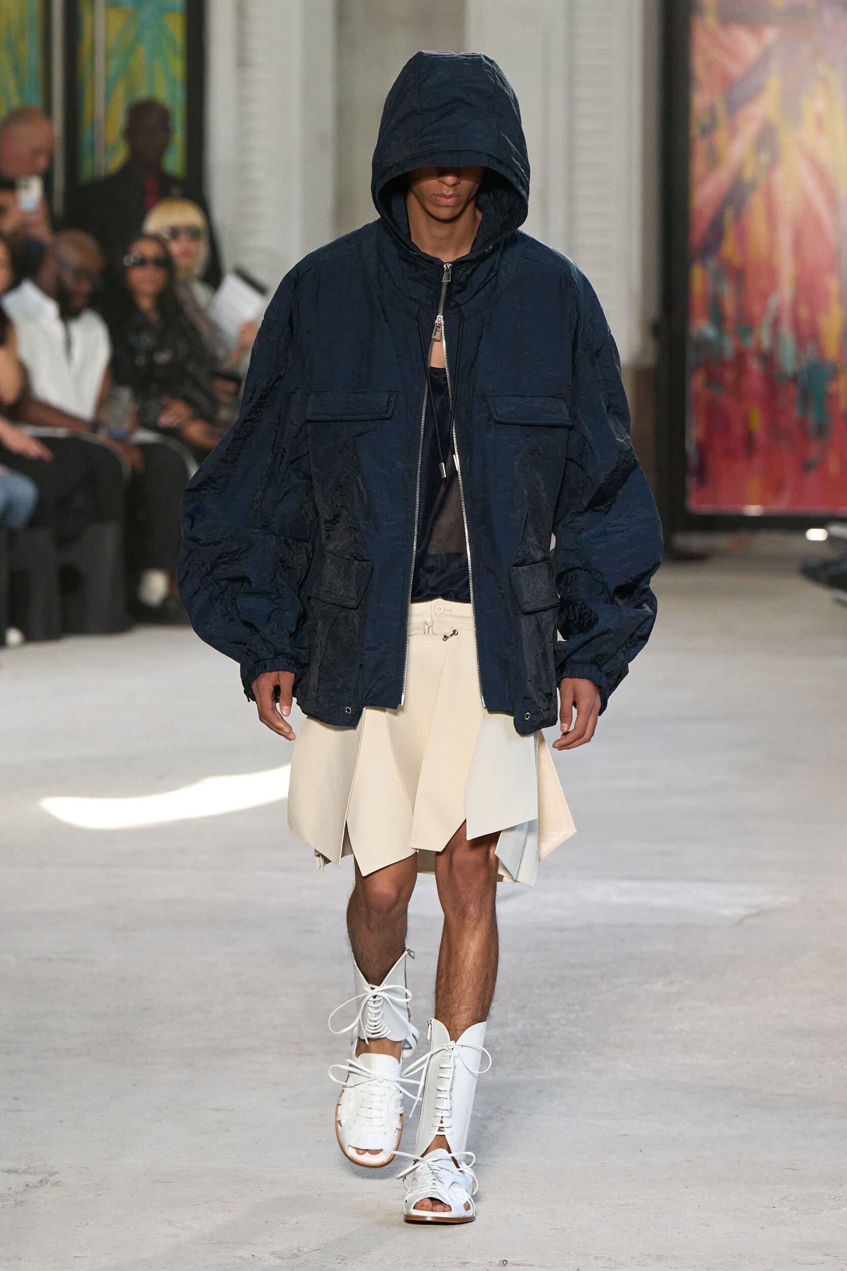 The runway showcased high-collar windbreakers, oversized blazers, workman’s jackets, blousons with asymmetrical necklines, and wide-cropped trousers or tailored shorts – blending East-meets-West influences that Song enjoys playing with. Cut from lightweight fabrics like silk, organza, or mesh, the pieces felt breezy and generous.