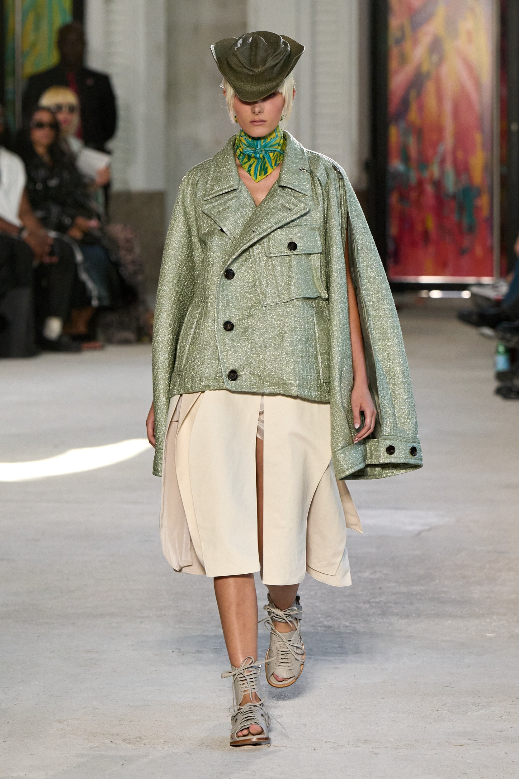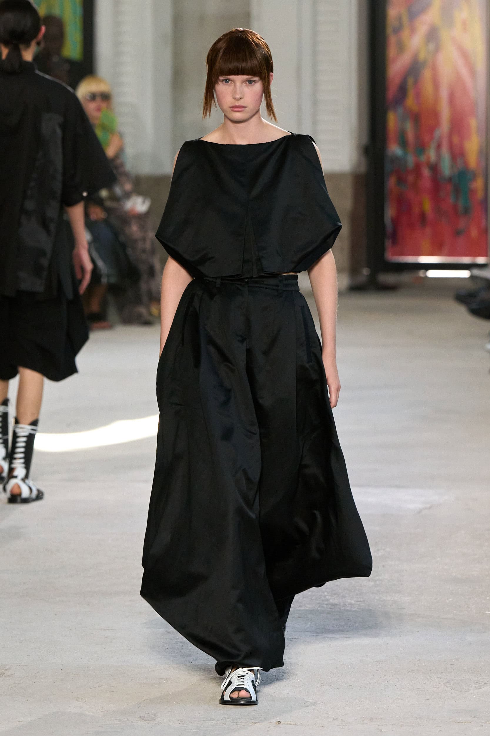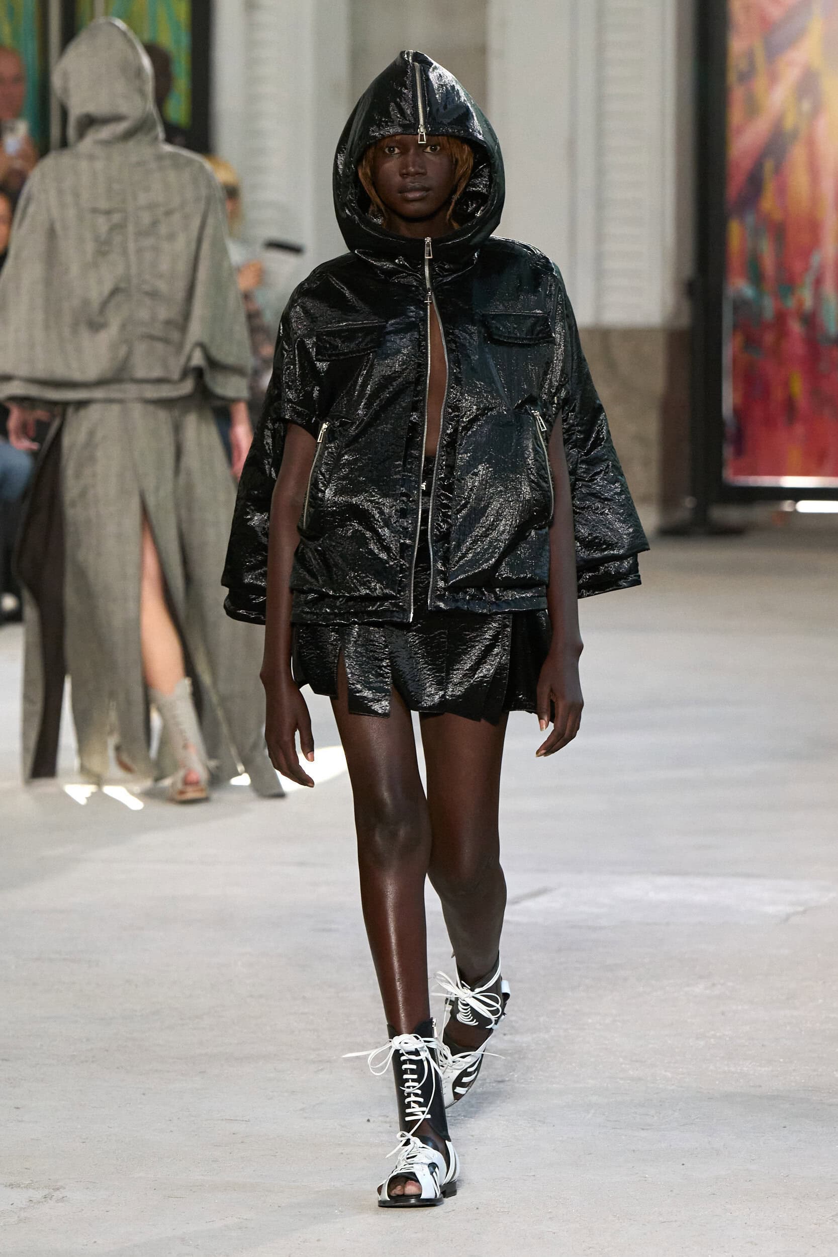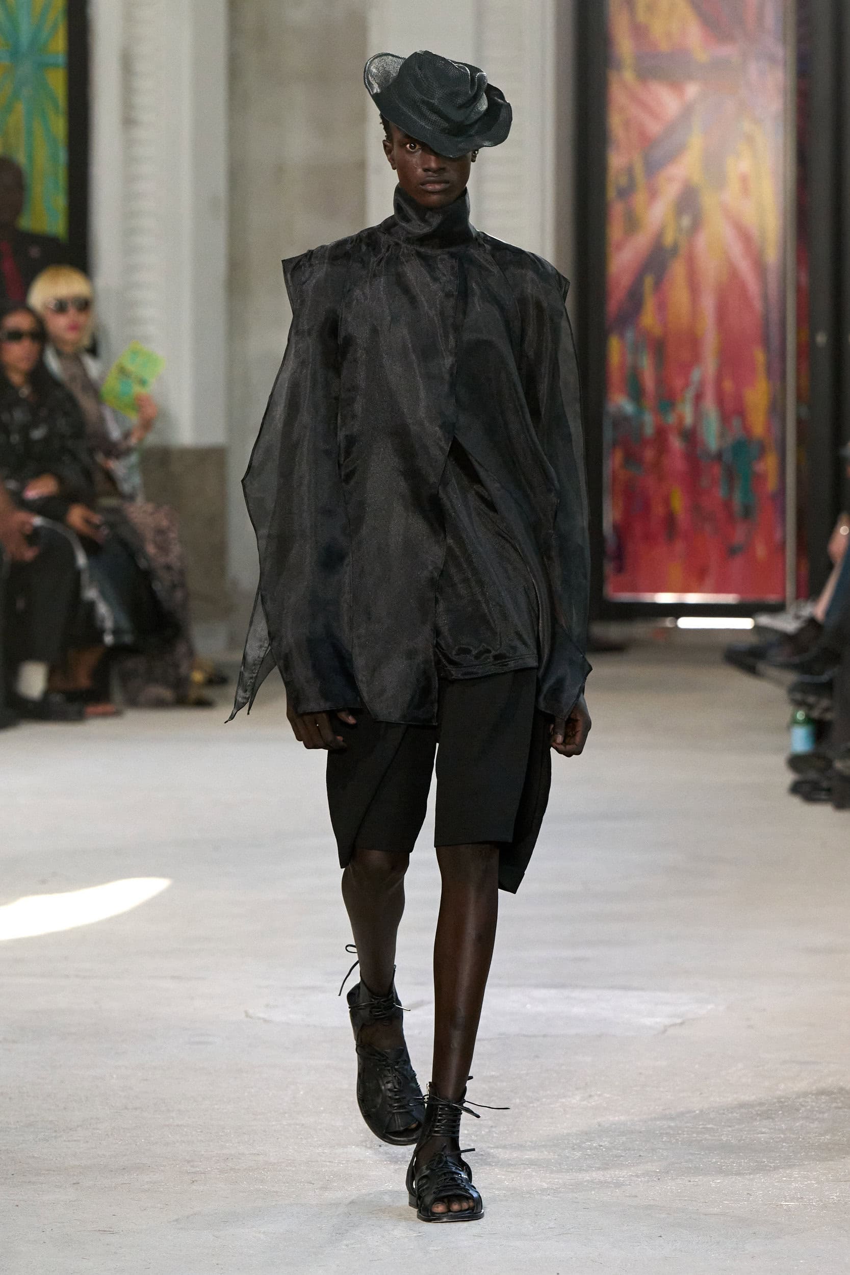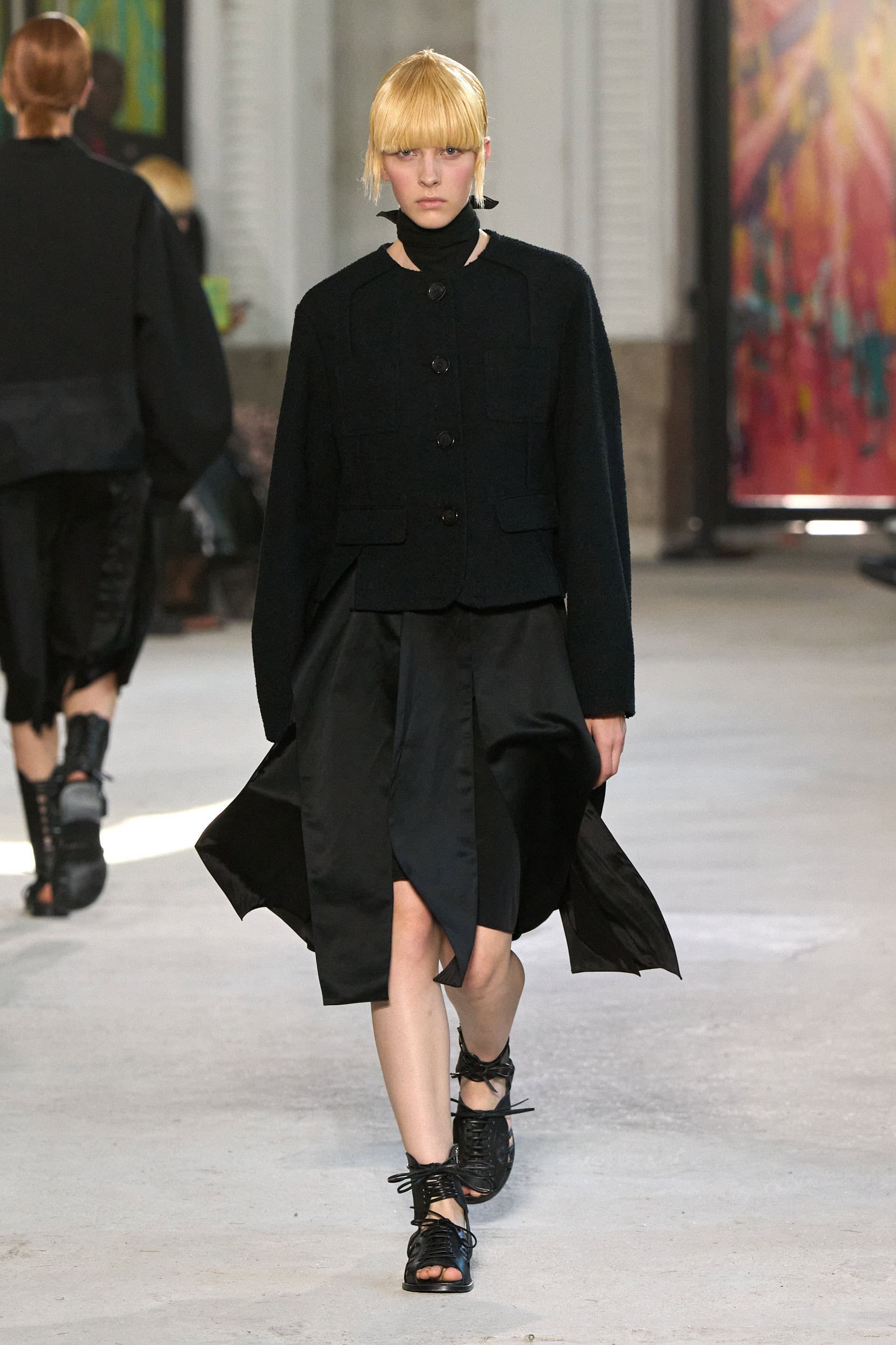 The runway showcased high-collar windbreakers, oversized blazers, workman’s jackets, blousons with asymmetrical necklines, and wide-cropped trousers or tailored shorts – blending East-meets-West influences that Song enjoys playing with. Cut from lightweight fabrics like silk, organza, or mesh, the pieces felt breezy and generous.