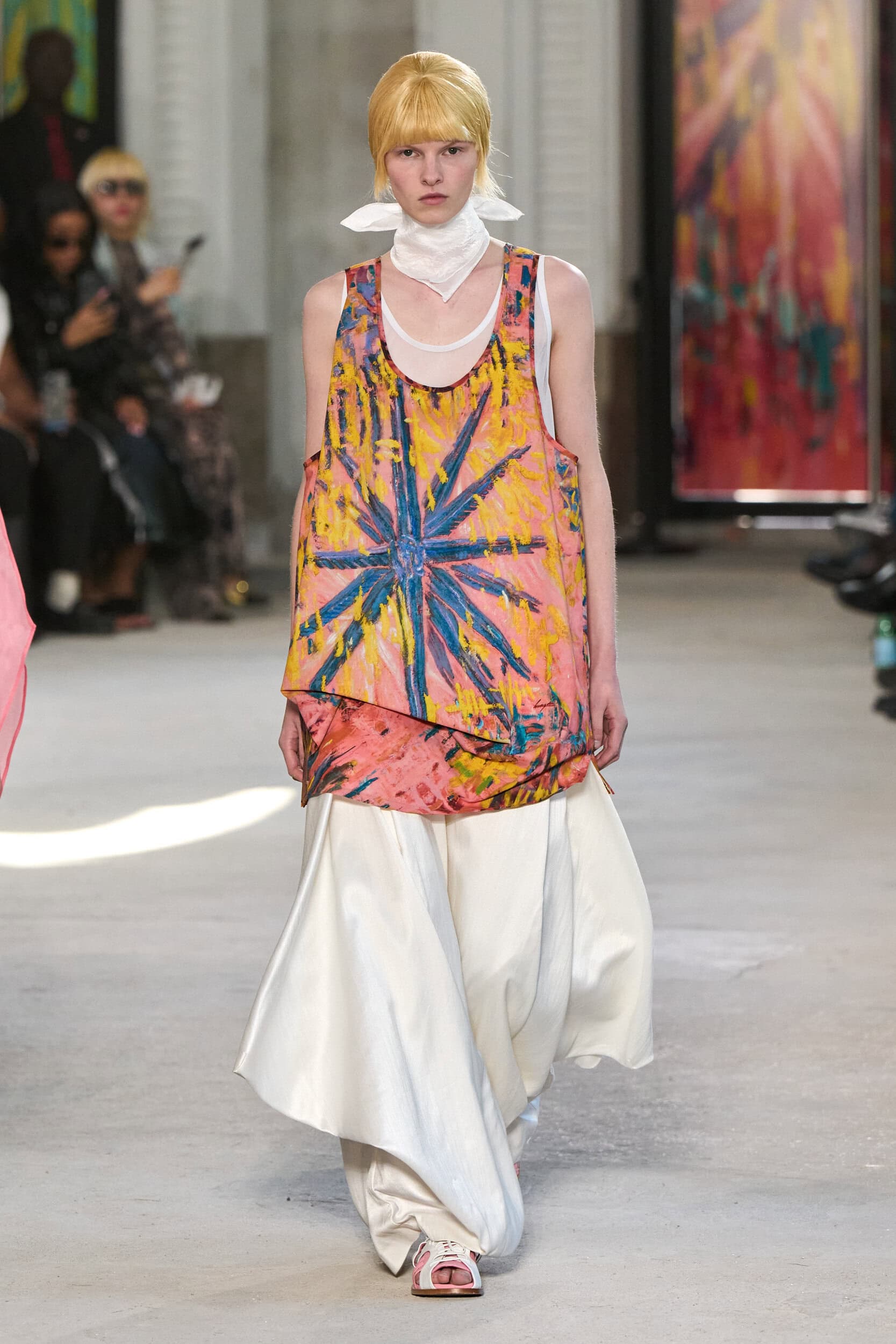 The use of watercolors resulted in an array of pale pinks and blues, softening the brand’s typical blacks and greys. Brightly colored prints based on oil paintings were also incorporated into the collection.