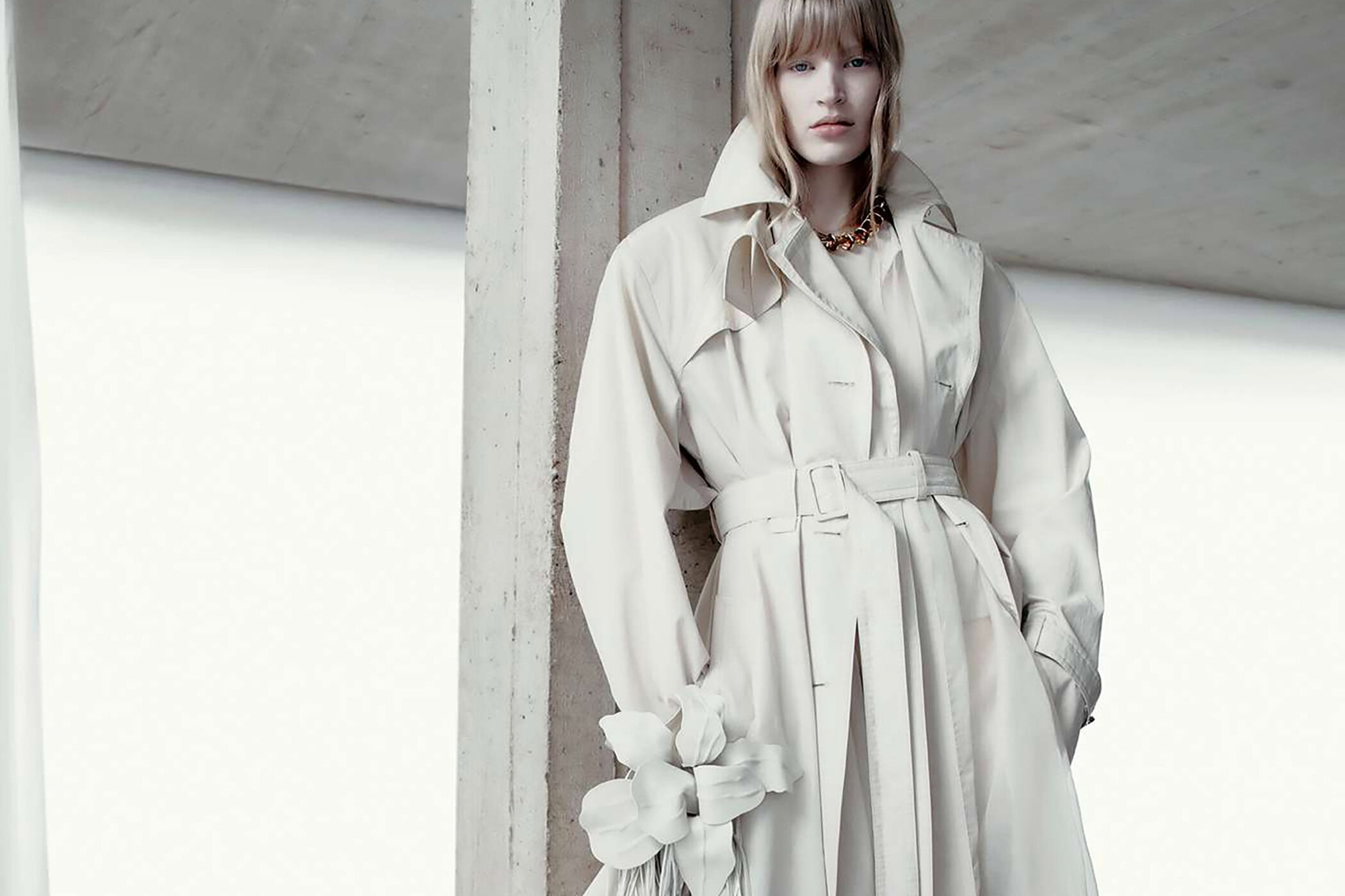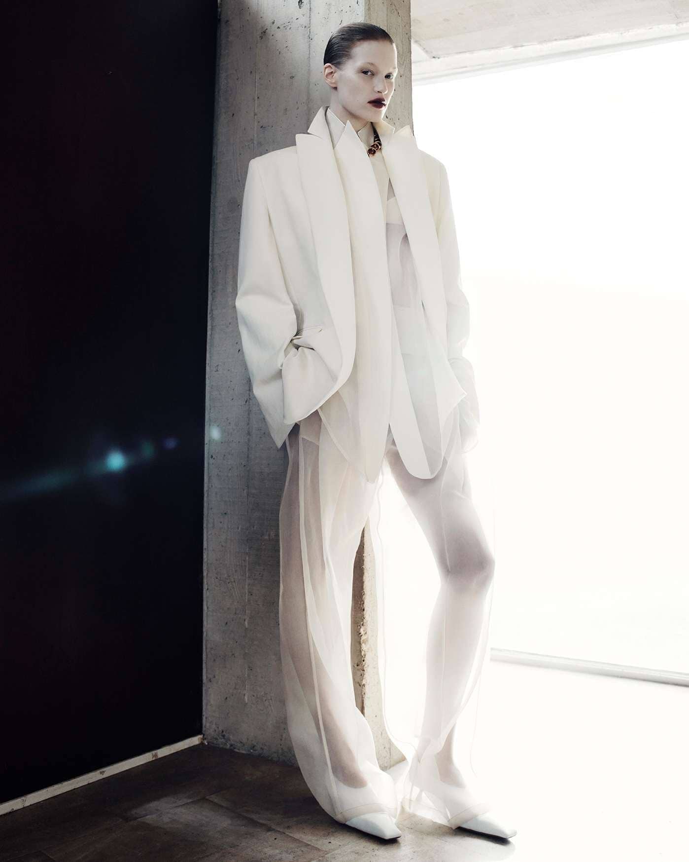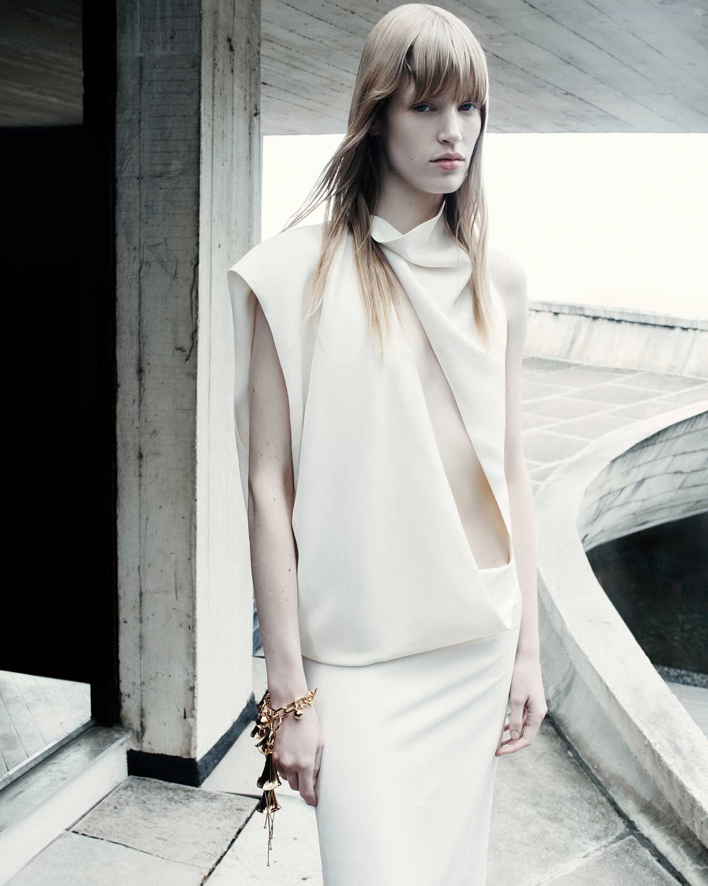 Visually, the architecture sets the tone. Concrete planes, sharp angles, and uncompromising scale echo the collection’s own precision, while the Sportmax woman moves through the space with deliberate ease. She is not dwarfed by structure nor softened by it; instead, she measures herself against it. Galiegue’s imagery captures moments of transition—mid-step, mid-turn, mid-thought—reinforcing the campaign’s preoccupation with accelerated time and constant adjustment. There’s a rhythmic tension here, where stillness and motion coexist, and the body becomes a unit of measurement within the built environment.