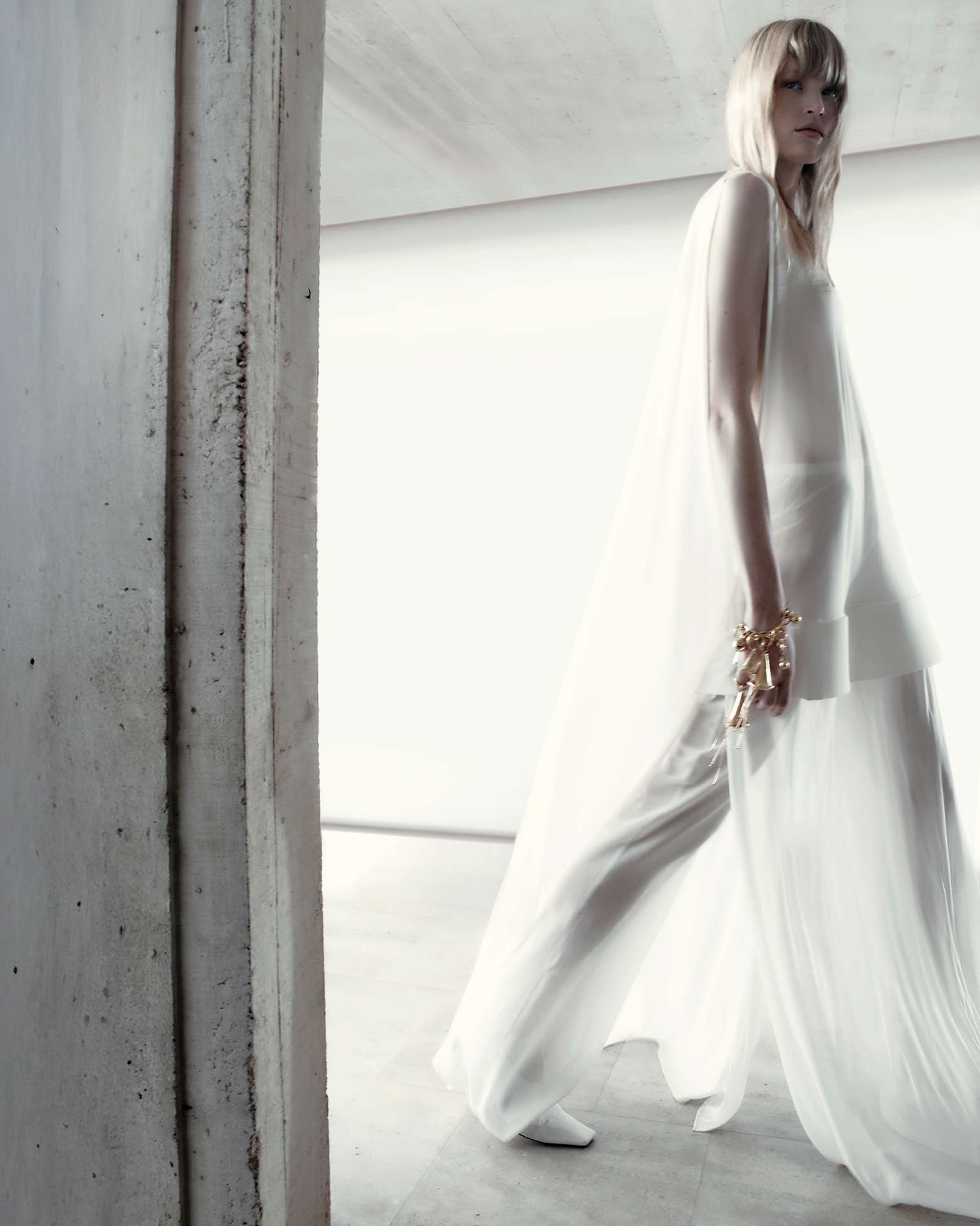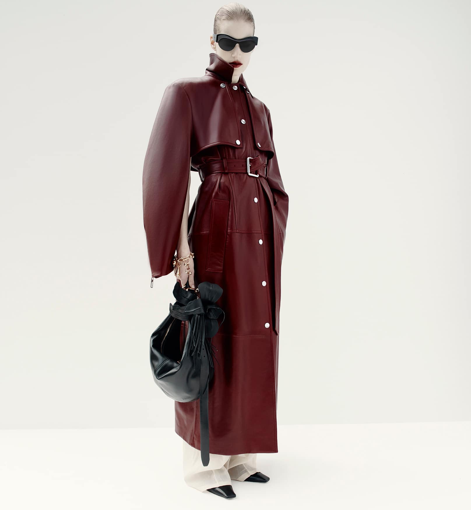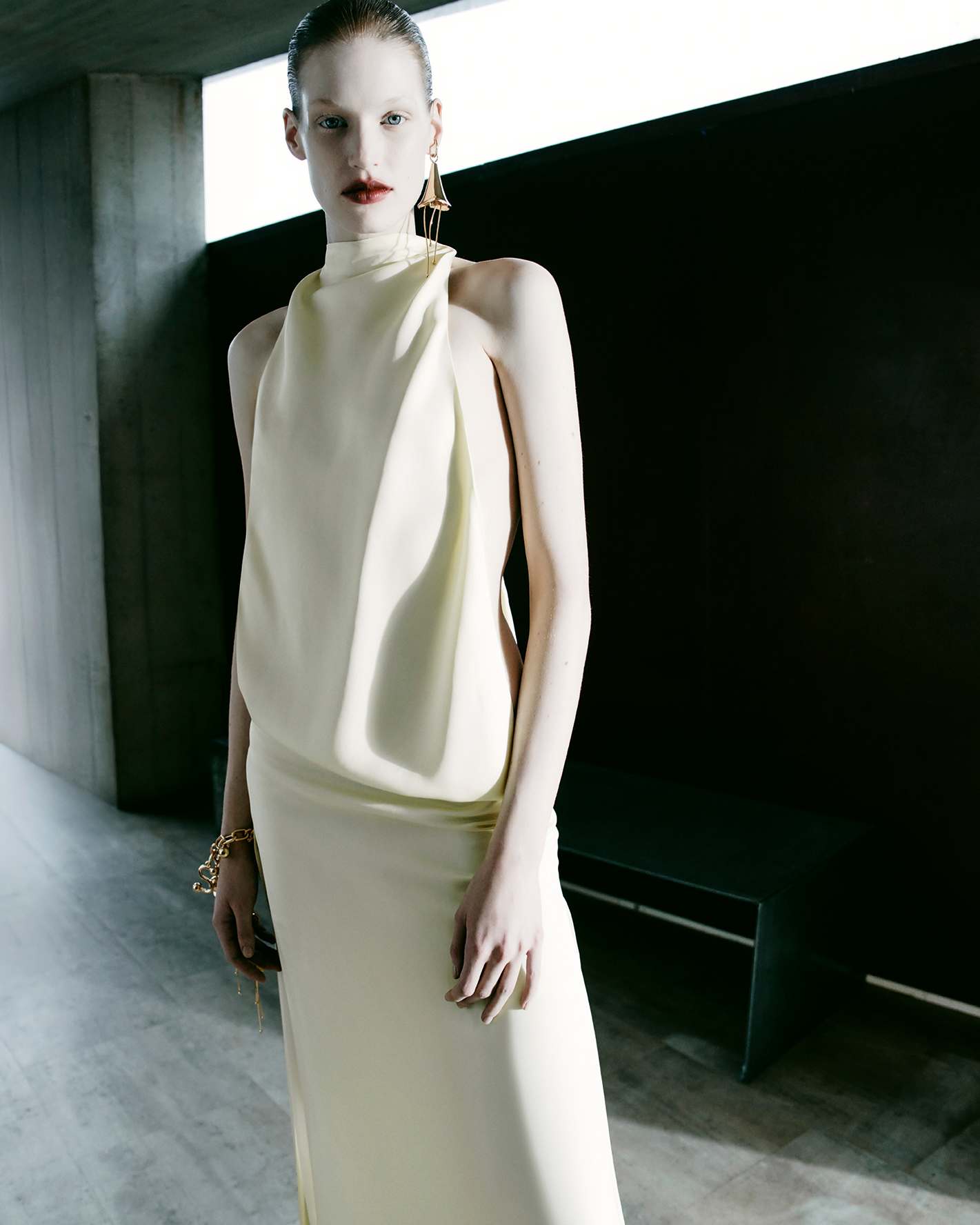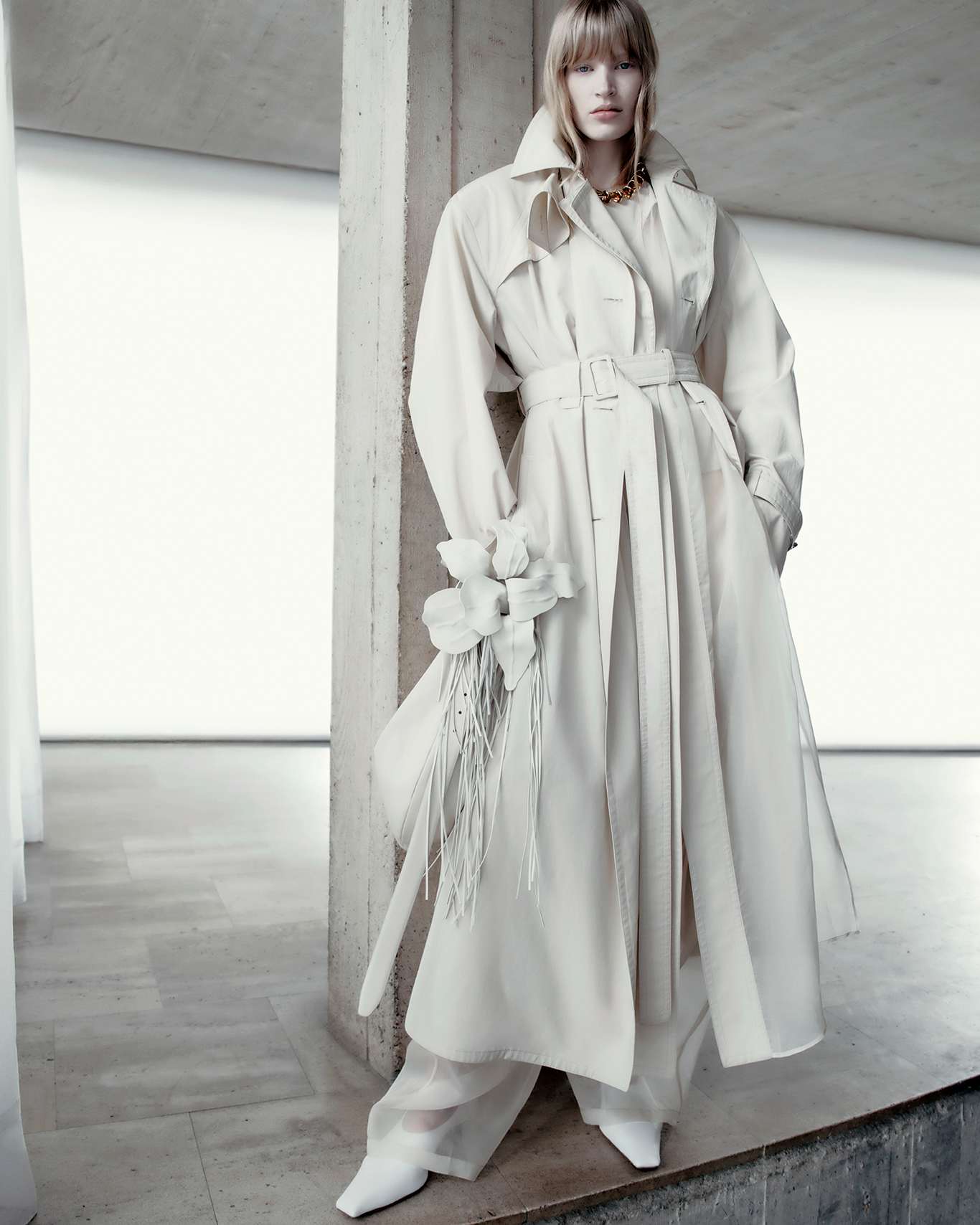Visually, the architecture sets the tone. Concrete planes, sharp angles, and uncompromising scale echo the collection’s own precision, while the Sportmax woman moves through the space with deliberate ease. She is not dwarfed by structure nor softened by it; instead, she measures herself against it. Galiegue’s imagery captures moments of transition—mid-step, mid-turn, mid-thought—reinforcing the campaign’s preoccupation with accelerated time and constant adjustment. There’s a rhythmic tension here, where stillness and motion coexist, and the body becomes a unit of measurement within the built environment.