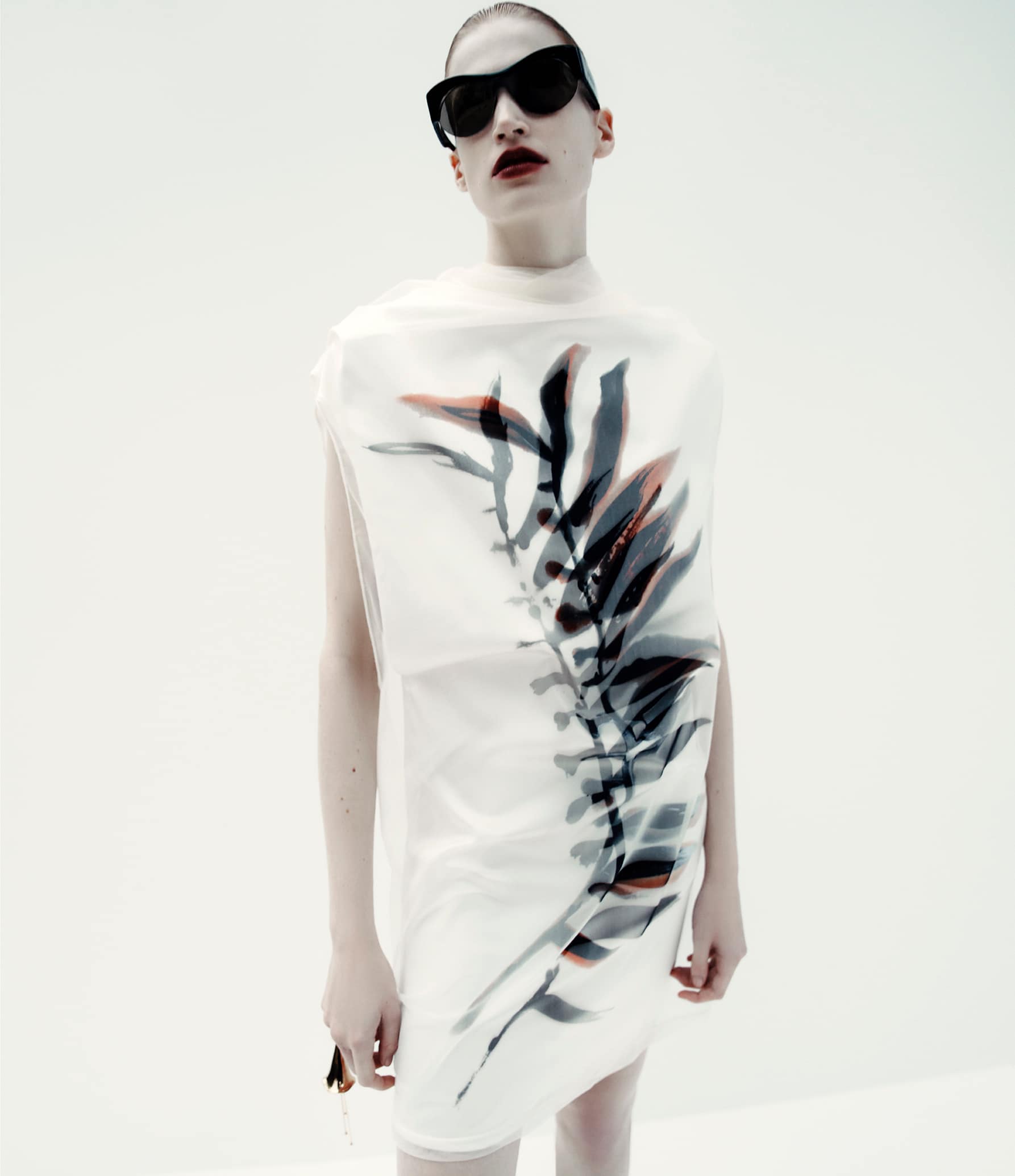 The clothes mirror this dialogue between structure and fluidity. Layering plays a central role, both conceptually and visually. Sheer surfaces overlap, prints collide, and architectural cuts interact dynamically with the body, revealing garments that seem to shift identity as they move. Botanical motifs—derived from cosmetic pigments—float across translucent fabrics, creating optical effects that blur boundaries between surface and depth, dream and function. It’s a sophisticated sleight of hand: softness without sentimentality, fantasy without escape.