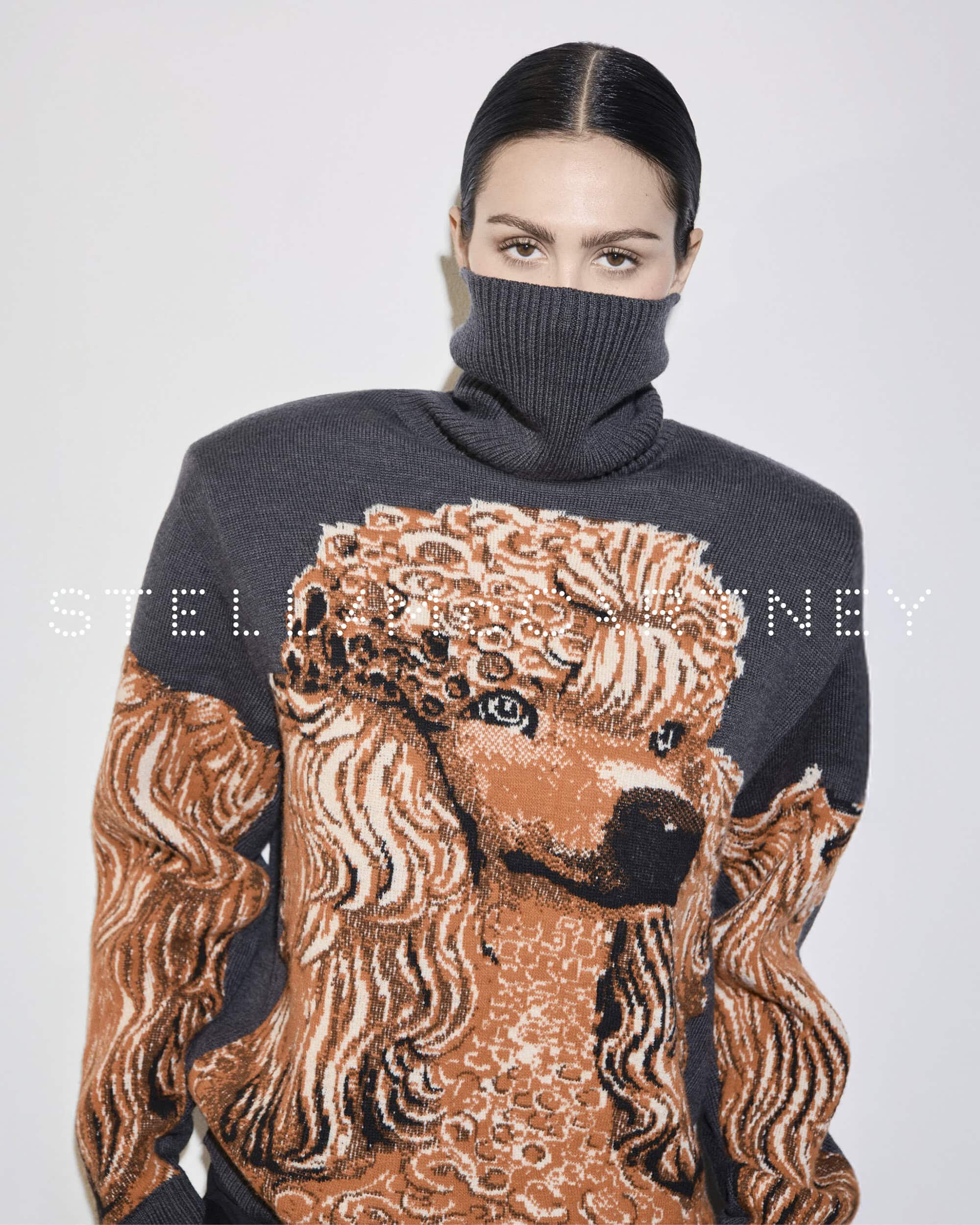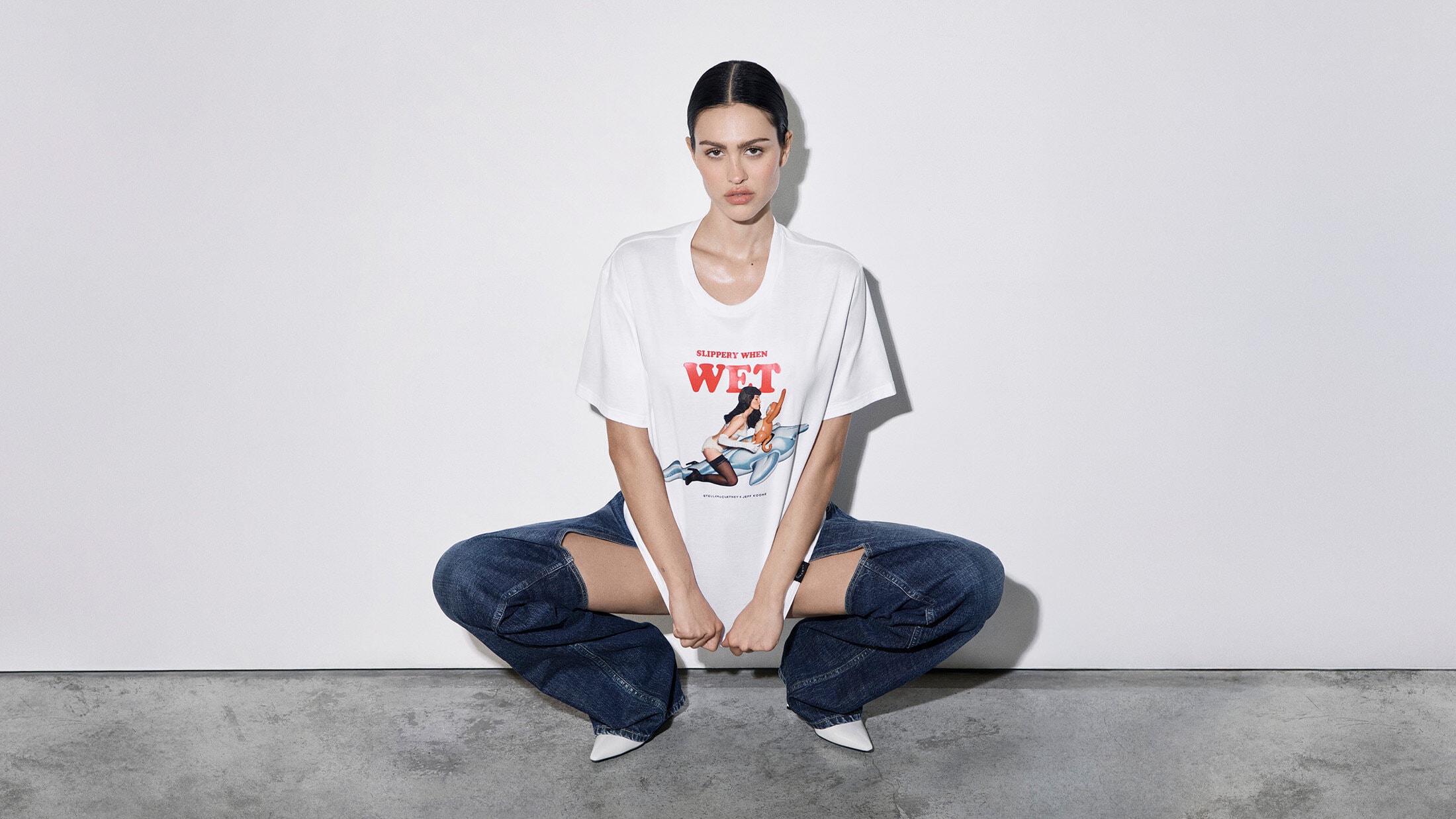 Amelia Gray fronts the campaign, wearing an organic cotton T-shirt first previewed on McCartney’s Winter 2025 runway. The graphic piece fuses Koons’ Untitled (Girl with Dolphin and Monkey) with a vintage slogan from McCartney’s 2001 debut—“Slippery When Wet.” The capsule also introduces a cheeky new “Doggy Style” message alongside two Koons dog sculptures—illustrated iterations of a Poodle and Yorkshire Terriers—personally chosen by McCartney from the artist’s provocative Made in Heaven series.