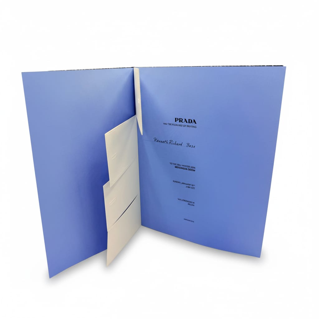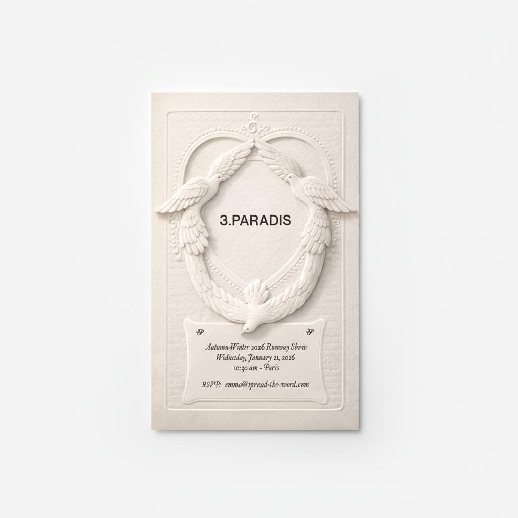 At Prada, a tactile clue awaited in the form of embossed paper sculpted to mimic the sharp fold of a men’s dress shirt cuff. This detail would reappear on the runway as a pronounced styling motif, offering a subtle throughline from invite to collection. The object’s restraint was telling—it whispered of formality, order, and the quiet tension between old-world tailoring and contemporary codes.