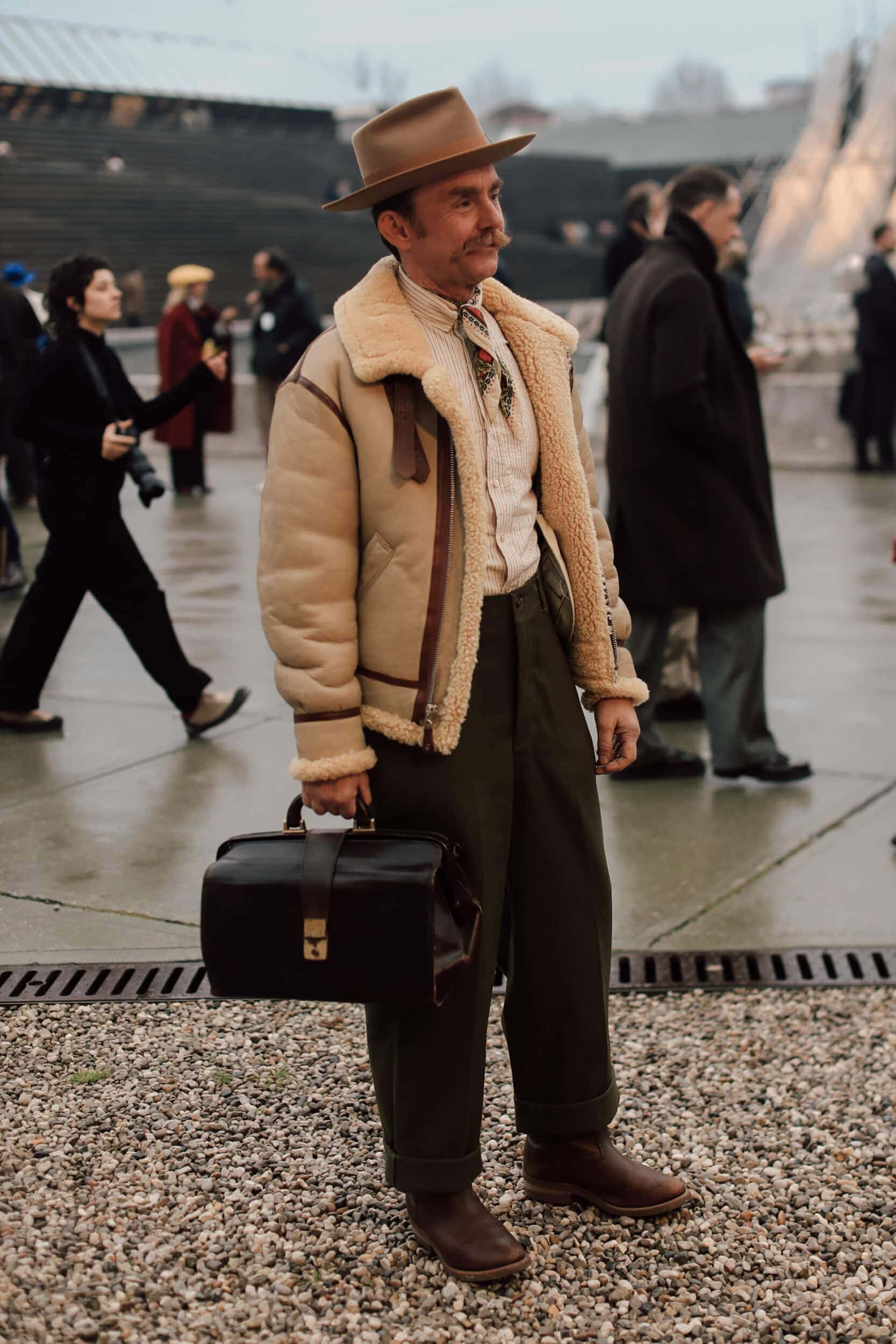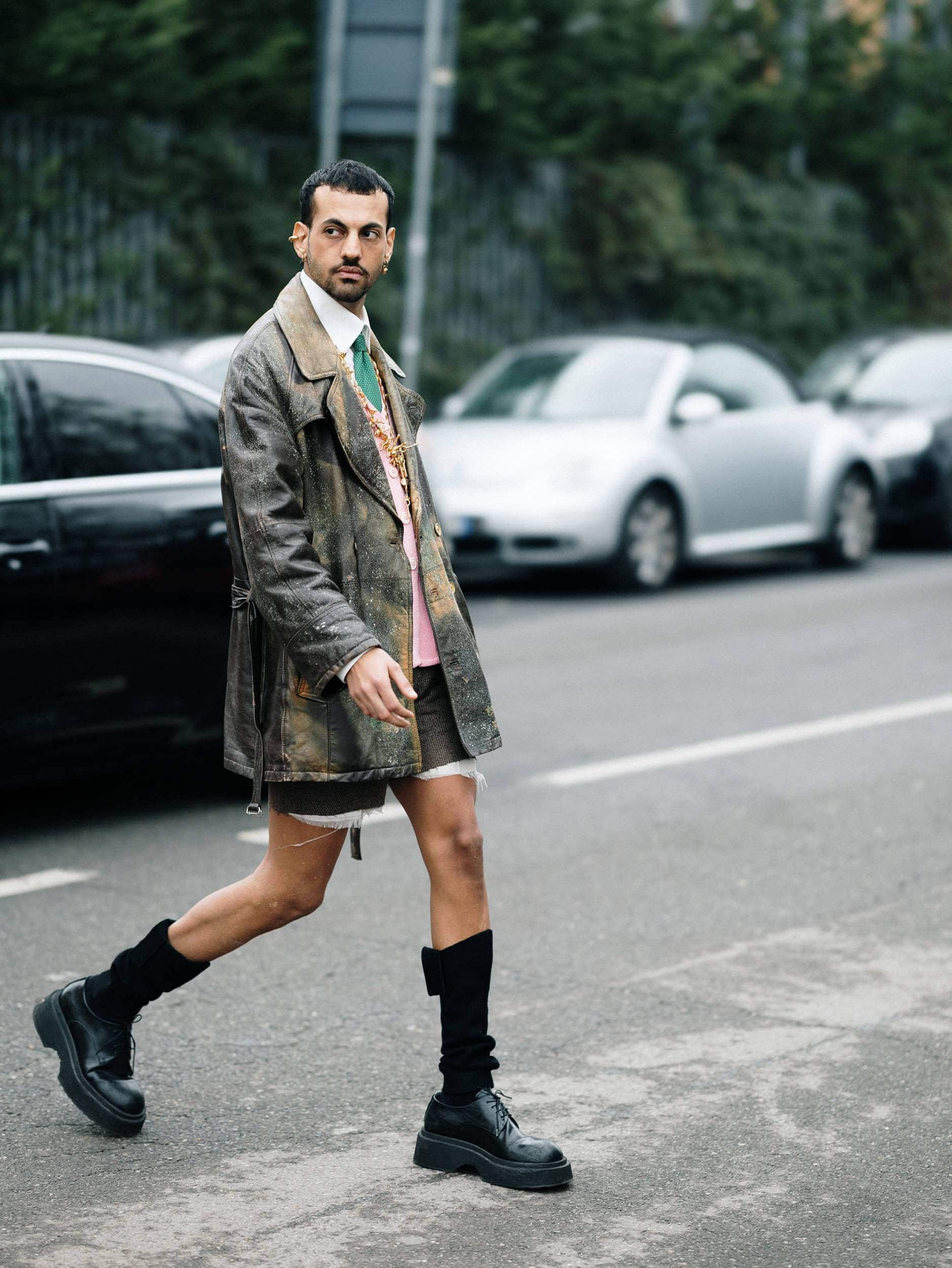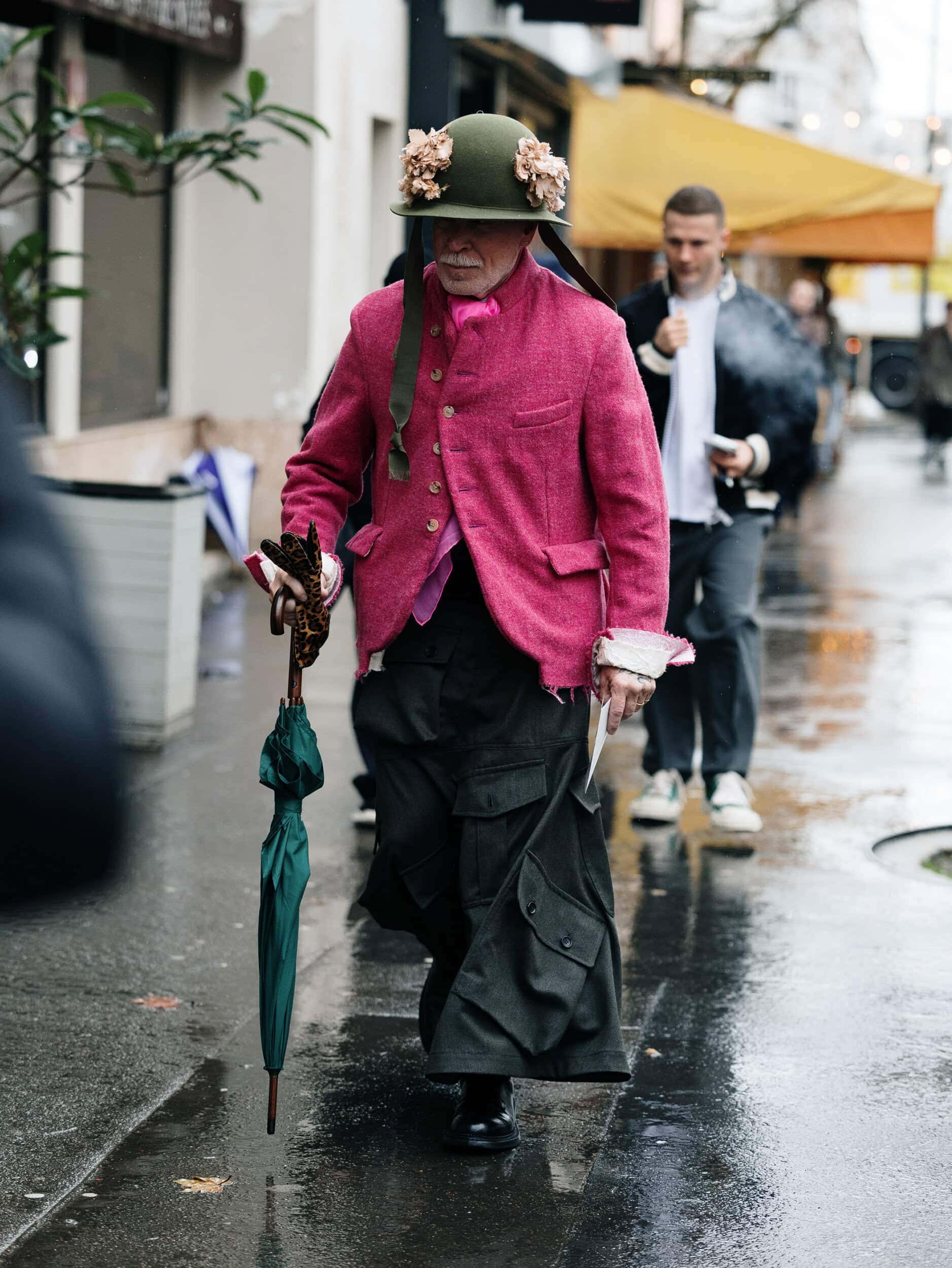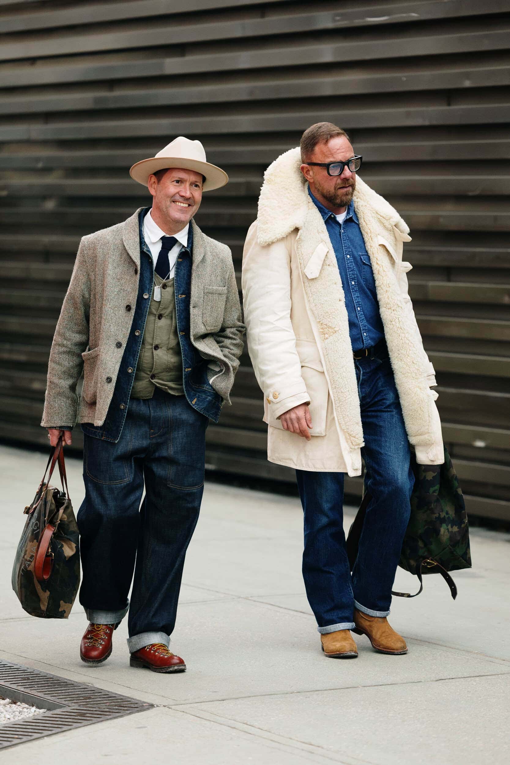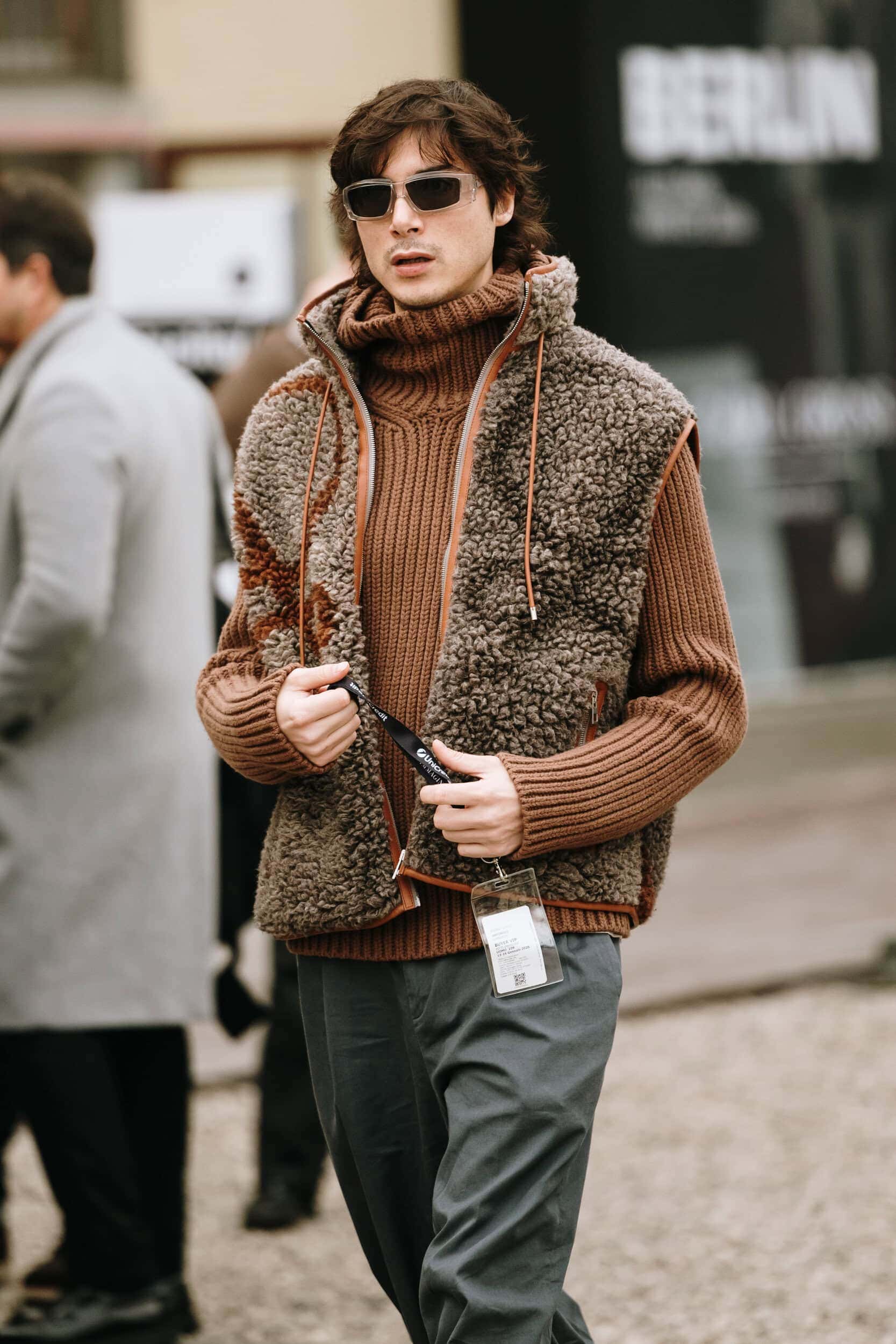 Men’s Fall 2026 Fashion Week street style felt like a modern frontier, blending rugged influence with refined restraint. Western cues surfaced in fur-trimmed coats, worn leathers, and cowboy boots, while militant elements—military greens, utility jumpsuits, and structured layers—added edge. Suits and classic workwear softened through fluid tailoring and feminine nuance, balanced by thoughtful details like stacked rings and charm-adorned bags. The result was a sharply curated streetscape where strength met sensitivity, and menswear felt both expressive and intentional.