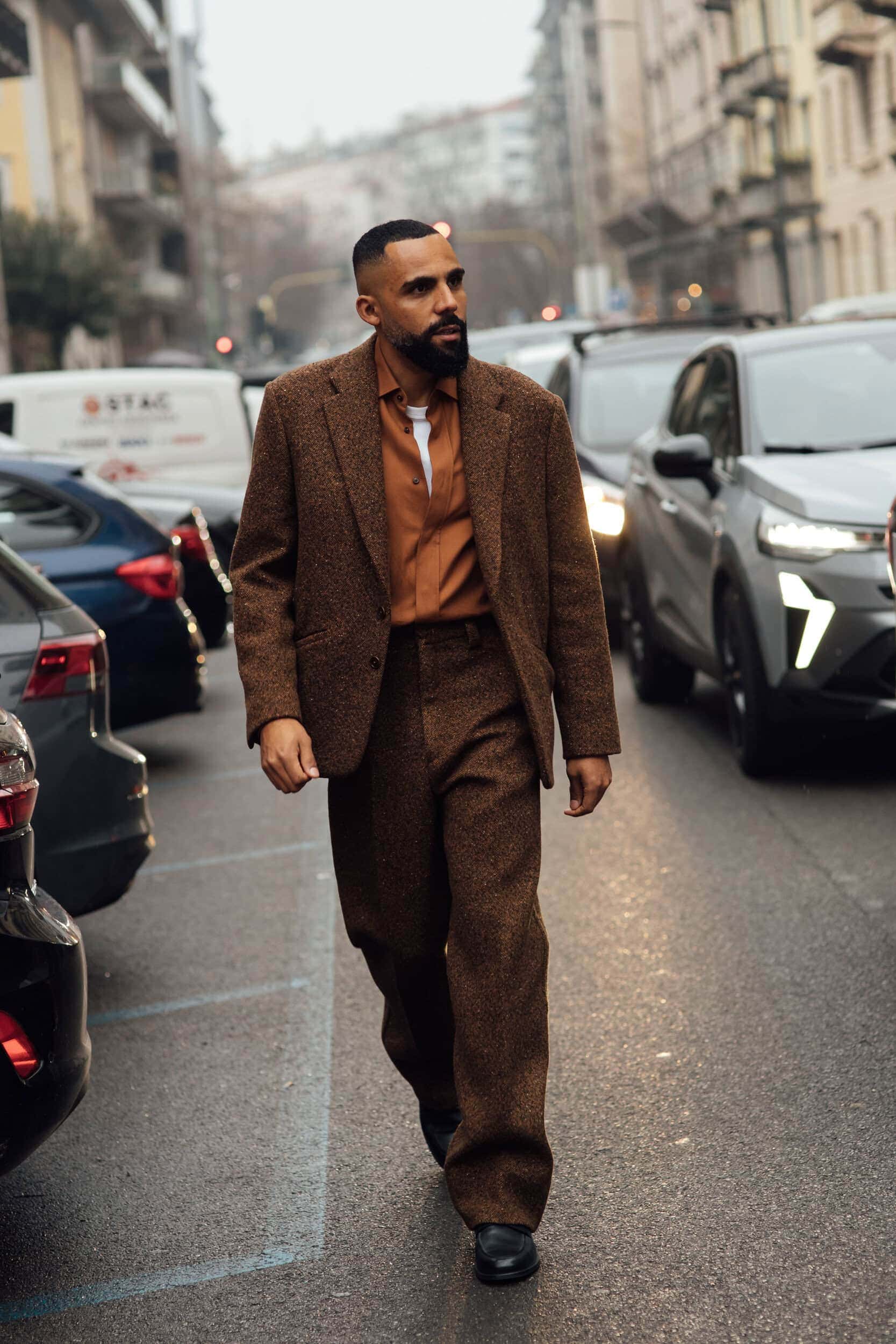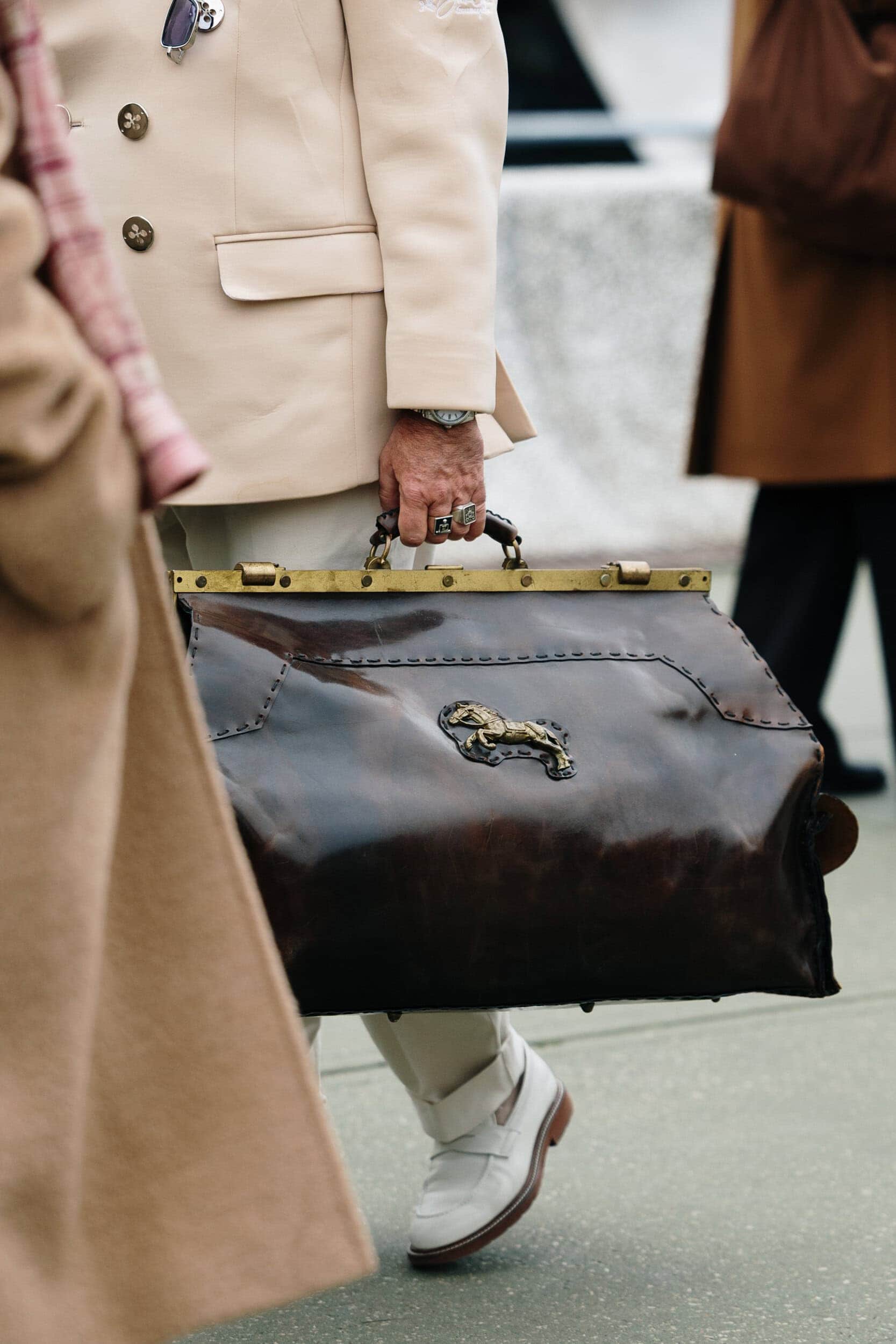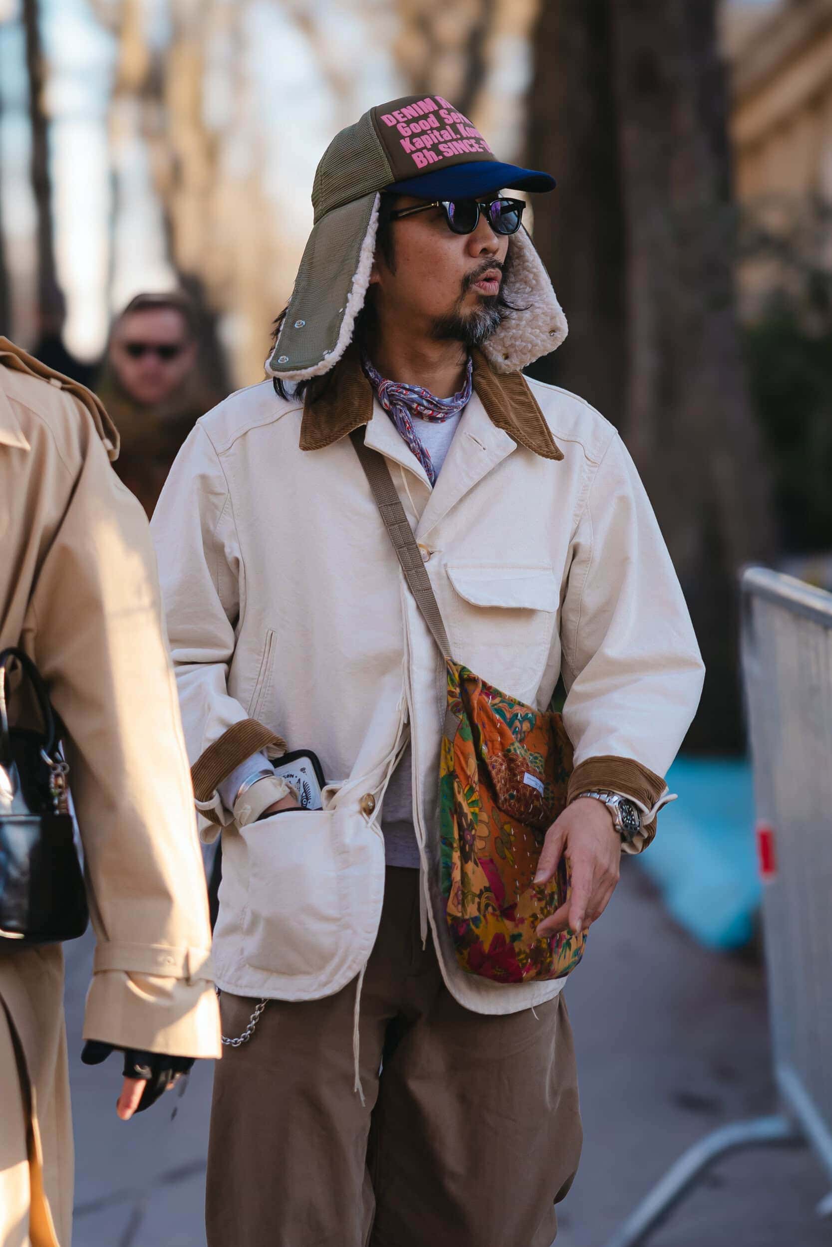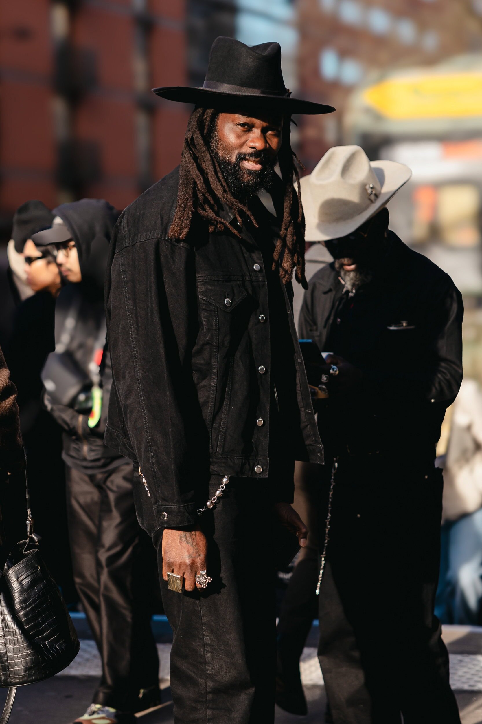 Men’s Fall 2026 Fashion Week street style felt like a modern frontier, blending rugged influence with refined restraint. Western cues surfaced in fur-trimmed coats, worn leathers, and cowboy boots, while militant elements—military greens, utility jumpsuits, and structured layers—added edge. Suits and classic workwear softened through fluid tailoring and feminine nuance, balanced by thoughtful details like stacked rings and charm-adorned bags. The result was a sharply curated streetscape where strength met sensitivity, and menswear felt both expressive and intentional.