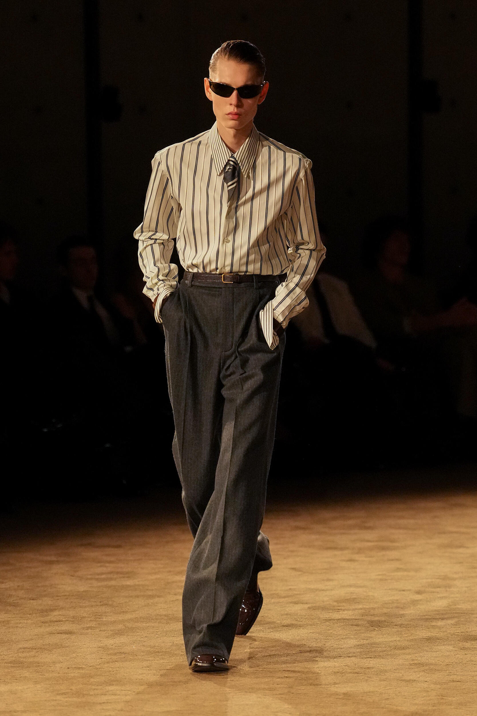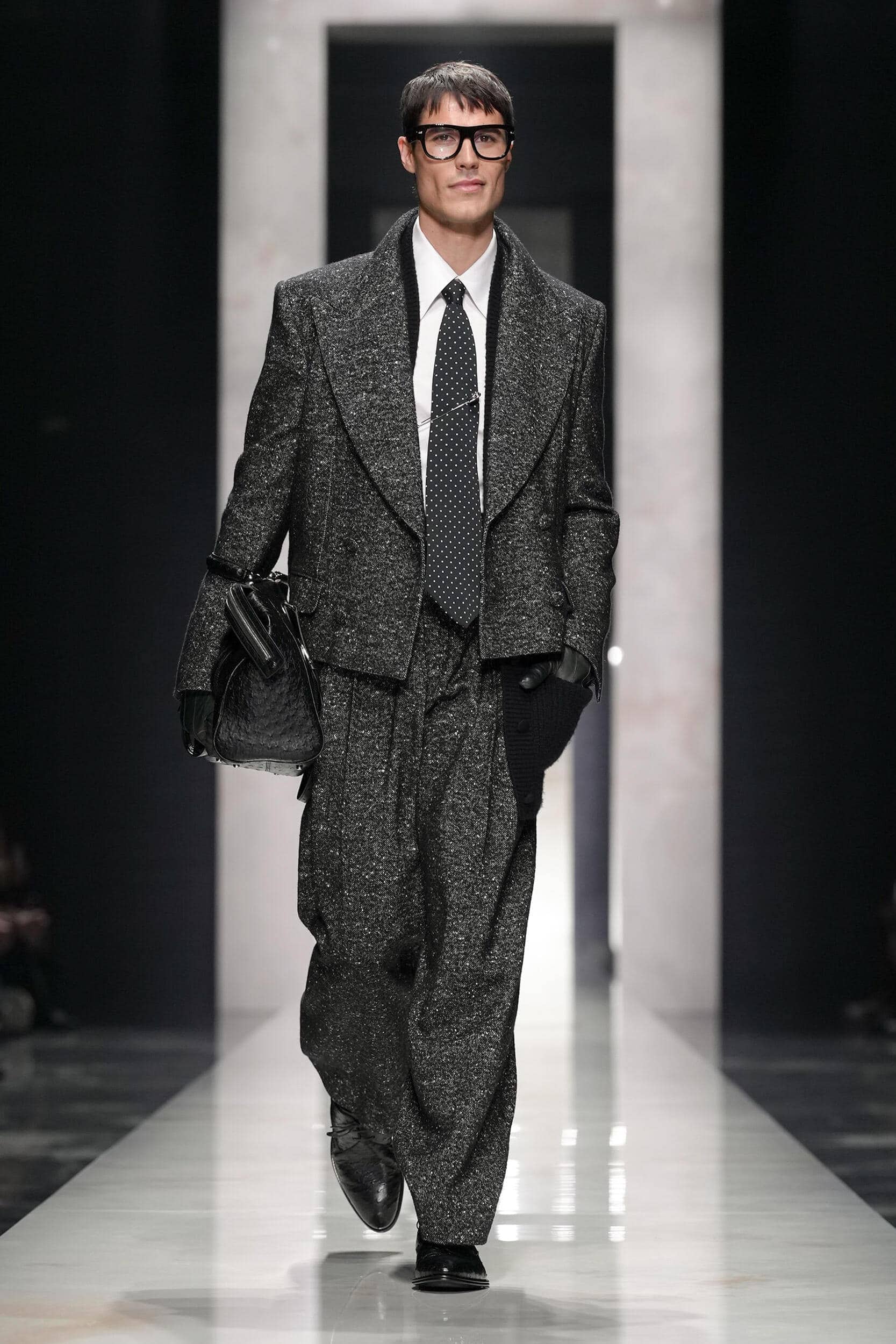 Menswear has always built its foundations on the benefits of a good suit, but this season the classic two (and three) piece tailored staple didn’t just re-emerge at Dolce and Gabbana, Zegna, Saint Laurent and Giorgio Armani, it reasserted itself with a dominance not seen since the streetwear takeover of the 2010s. The softening of the silhouette that has defined recent years appears to be over, and in its place, brands from Prada to Louis Vuitton presented clean lines and sharper shoulders with a whiff of Gordon Gekko about them, all rendered in the grey-on-grey palette of corporate uniformity. Accessories also followed suit with a more businesslike approach to bags and small leather goods, signalling that the era of dressing for escapism is being replaced by dressing for the reality of the world outside the runway.