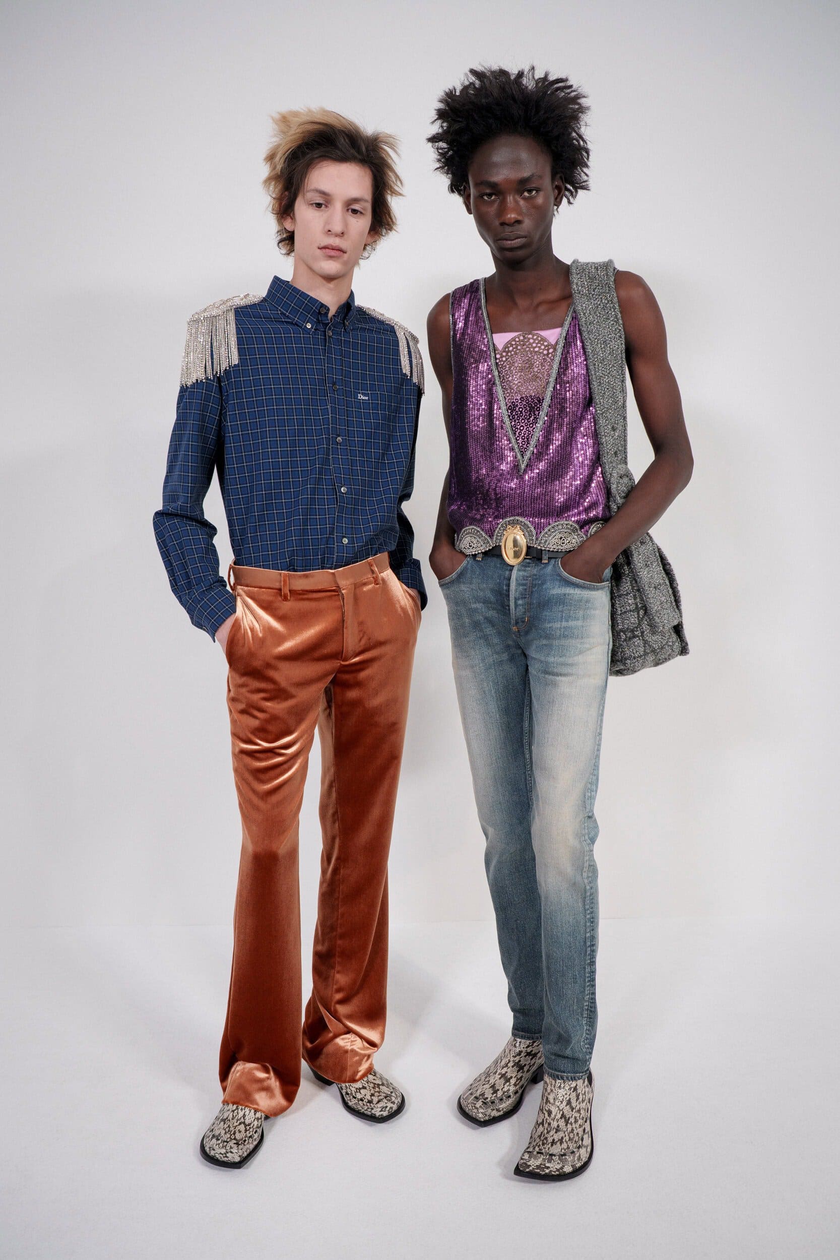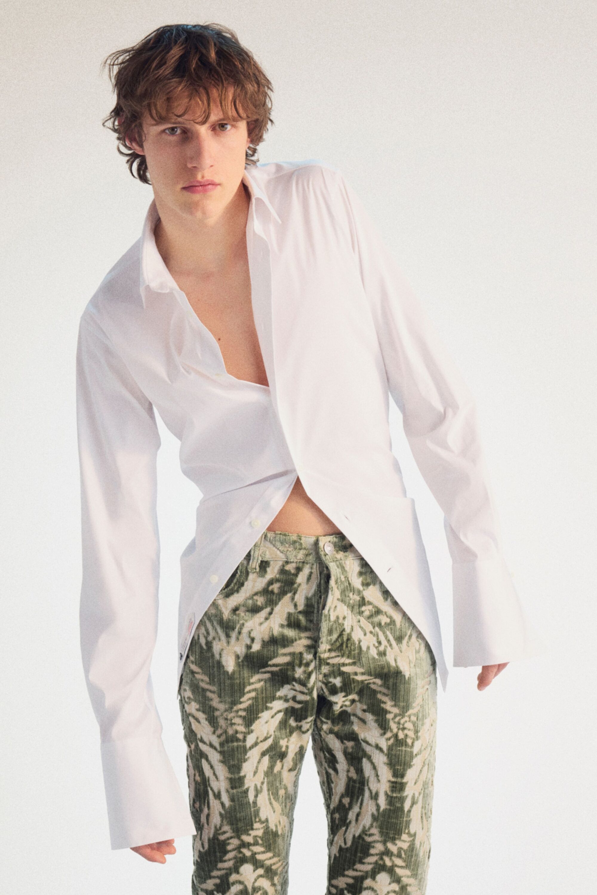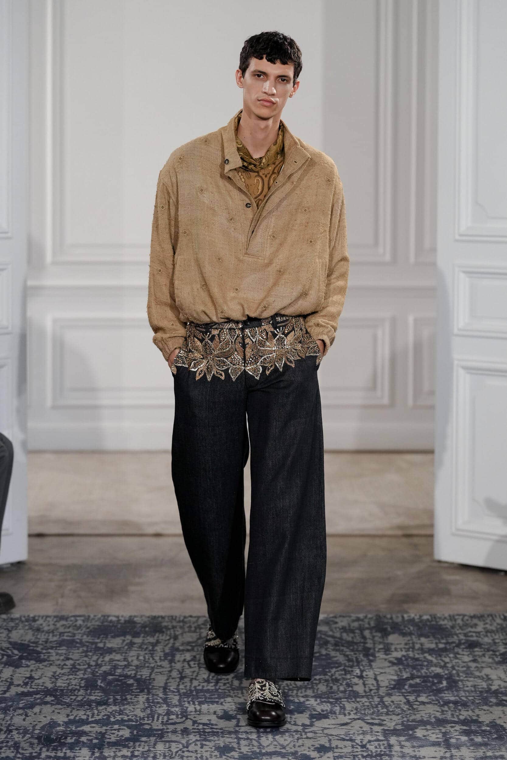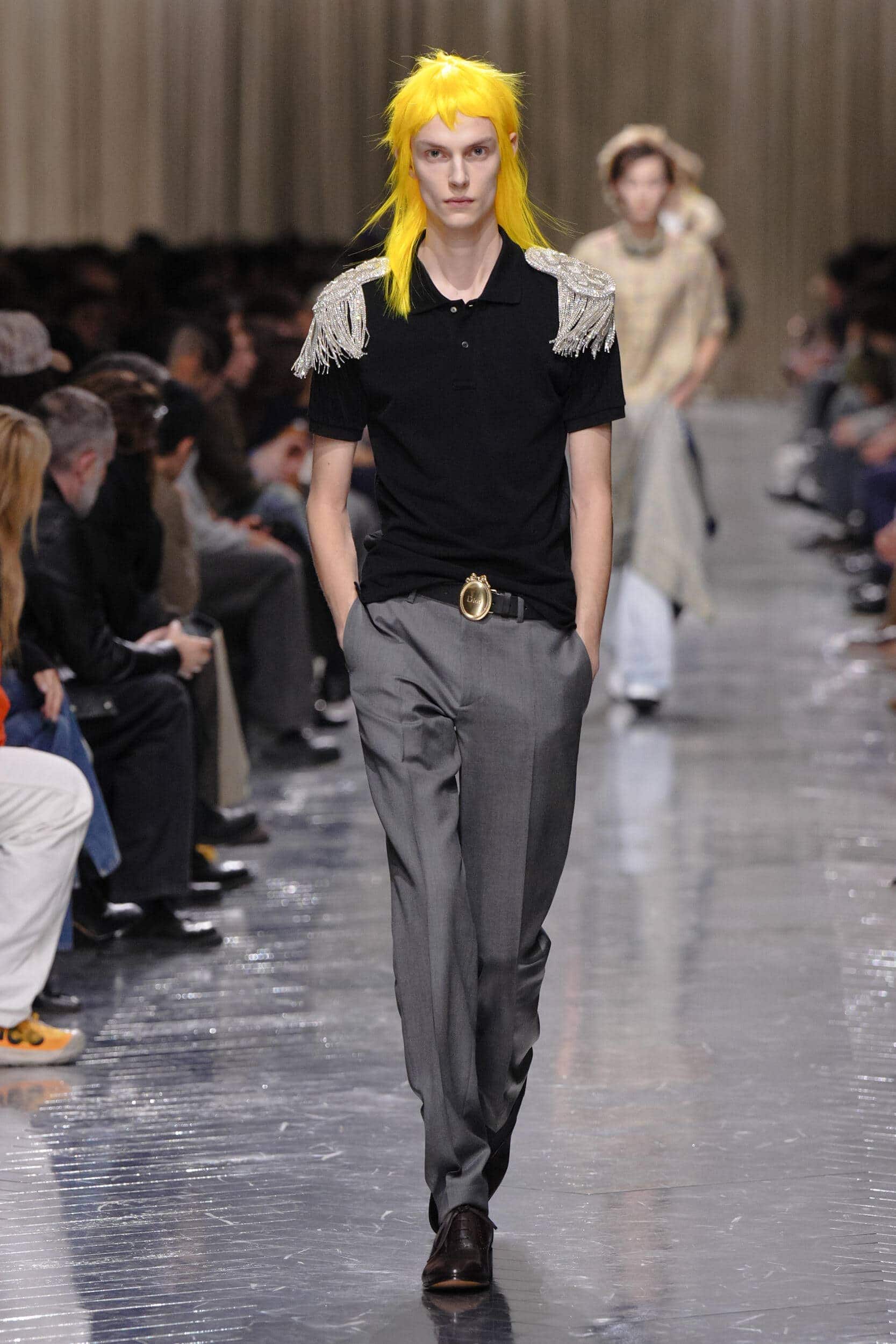 The blouse and tunic-style silhouette also featured prominently across the shows of Hed Mayner, Qasimi, and Rowen Rose. While at Jonathan Anderson’s sophomore collection for Dior Men, the couturier Paul Poiret was the starting point for a highly stylised collection of embellished tanks, metallic jacquard capes, and 3D floral embroidered bomber jackets. Dialling up the drama and offering an alternative trajectory for unconventional dressing.