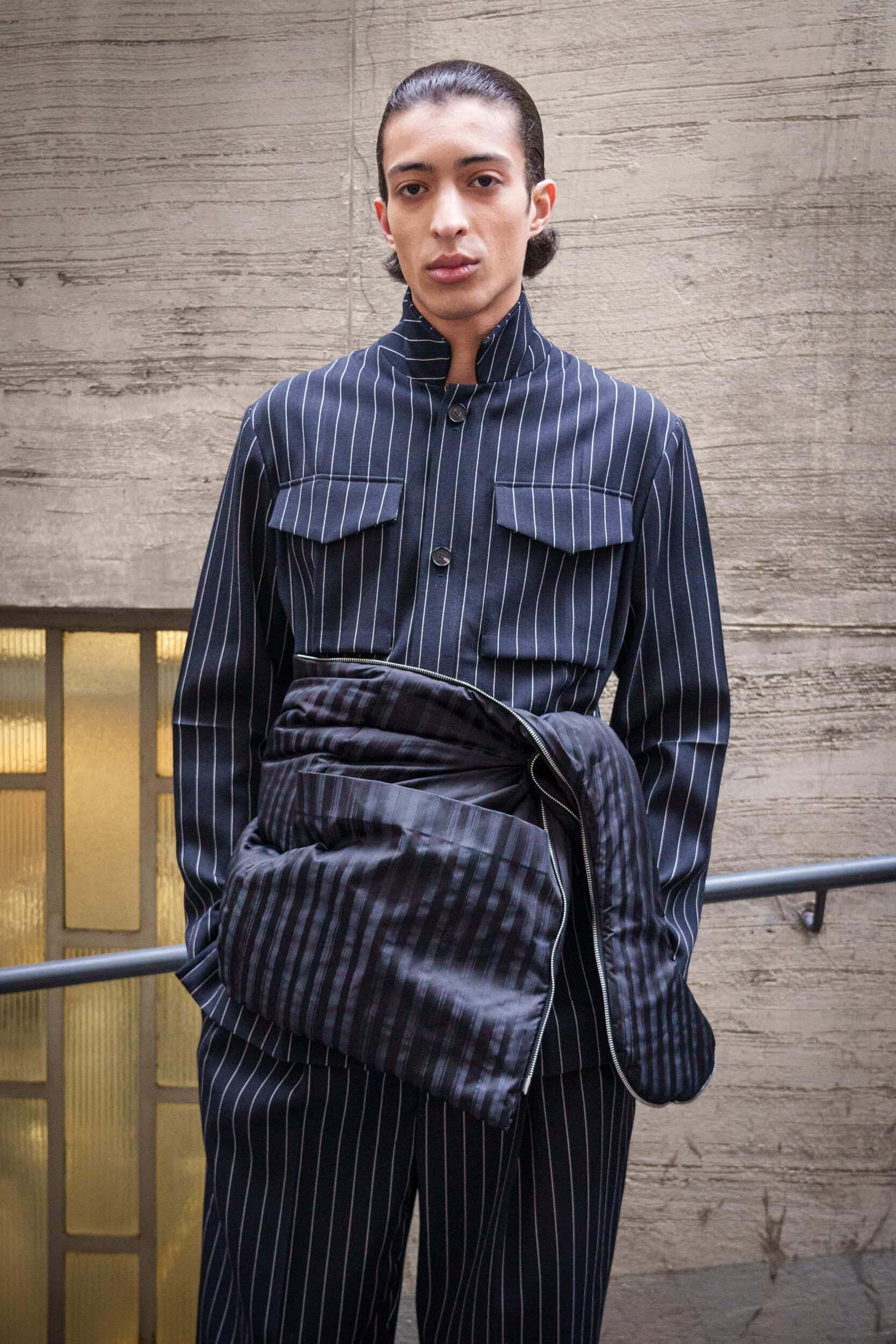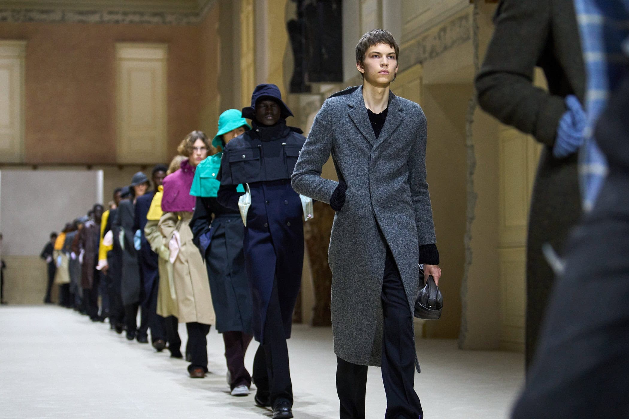 Buying for longevity has long been the calling of luxury menswear. A favourite T-shirt, the ultimate utility jacket, the custom-tailored suit bought, not as seasonal endeavours, but as long-term investments. Understanding this premise now, more than ever, due to consumers questioning what constitutes true value when it comes to their luxury purchases, designers took to deconstructing their collections and rebooting them with functionality at the forefront, not as an afterthought. Prada developed multi-coloured capelets to be worn over the already high-performance trench coat, with hats conveniently secured – or stowed – to the back of macs and blazers. At Dries Van Noten and Pronounce waistbands were spliced and constructed with drawstrings for adjustable comfort. Fur trims and linings were also used at Sacai and Soshiotsuki inside peacoats and Harrington jackets as a natural form of insulation. And Kiko Kostadinov proffered precision, folding and draping his jackets and tunics across the body in clean lines to provide multiple ways to wear, as well as conceal.