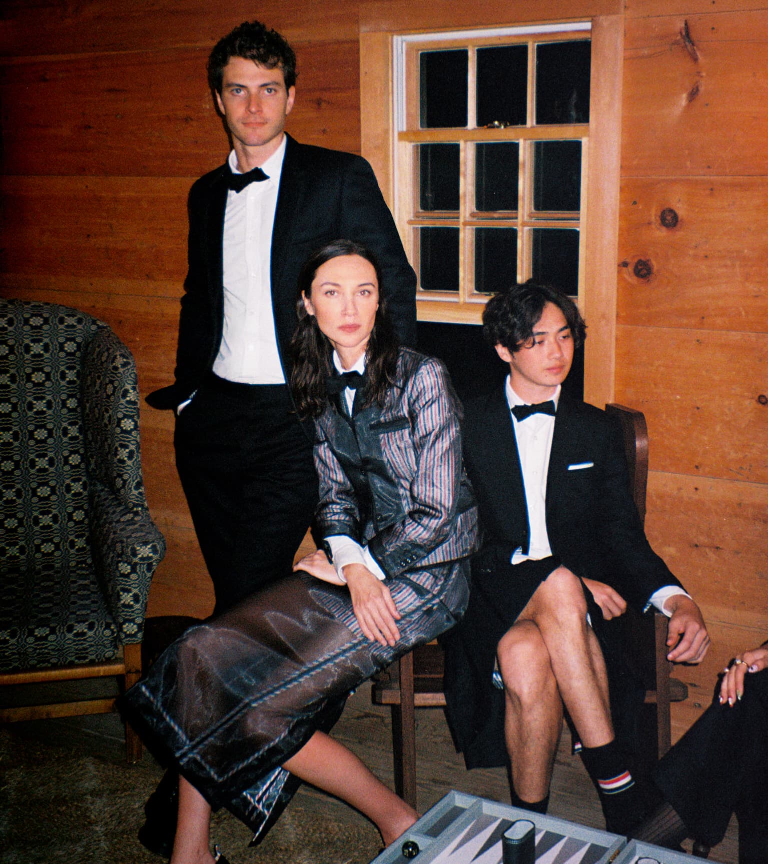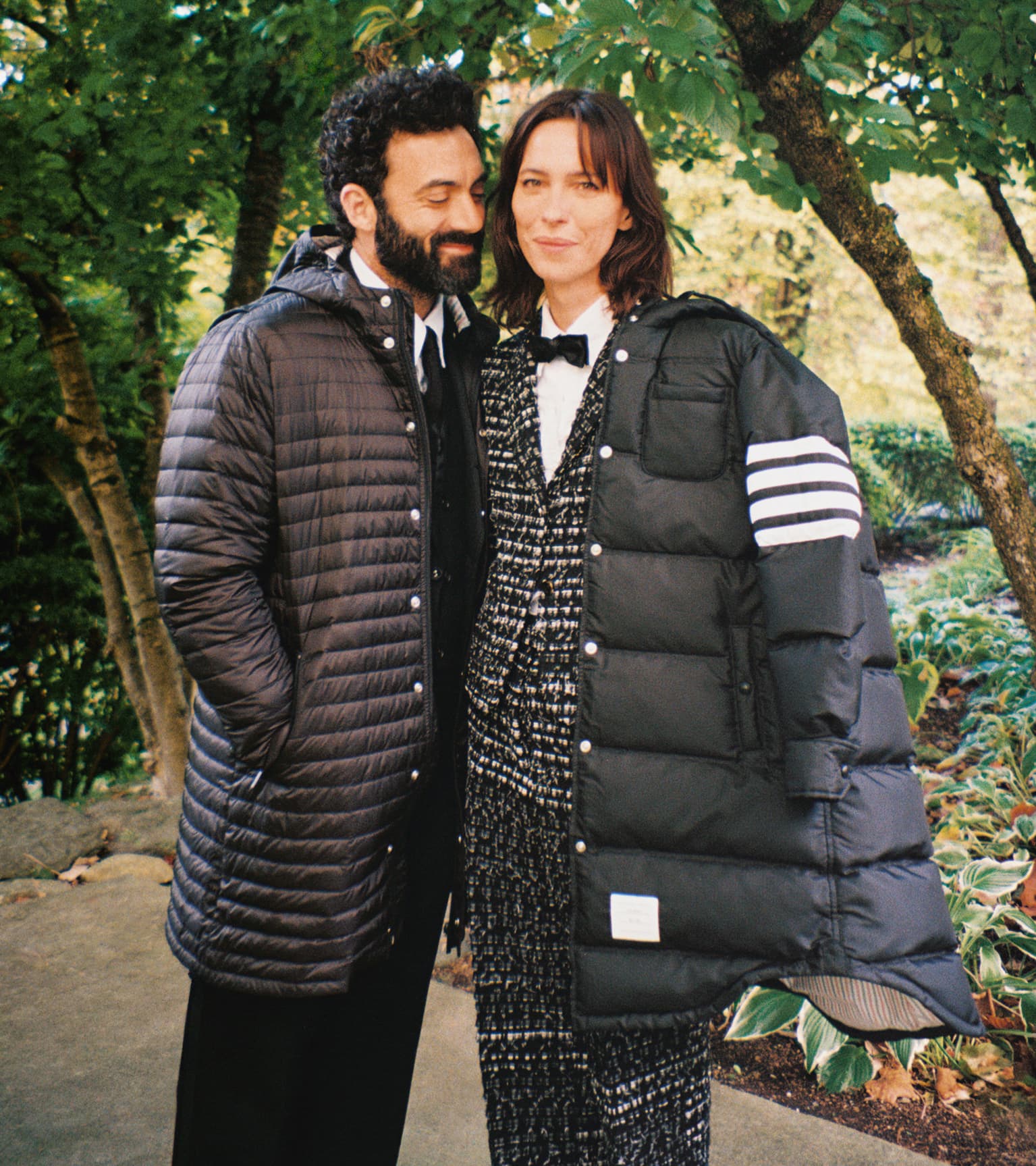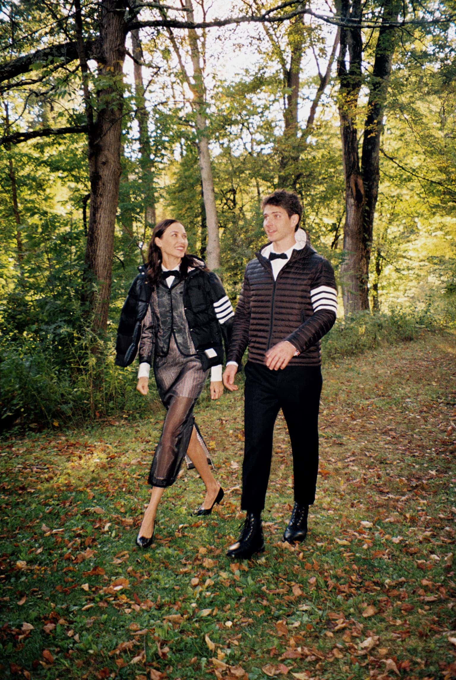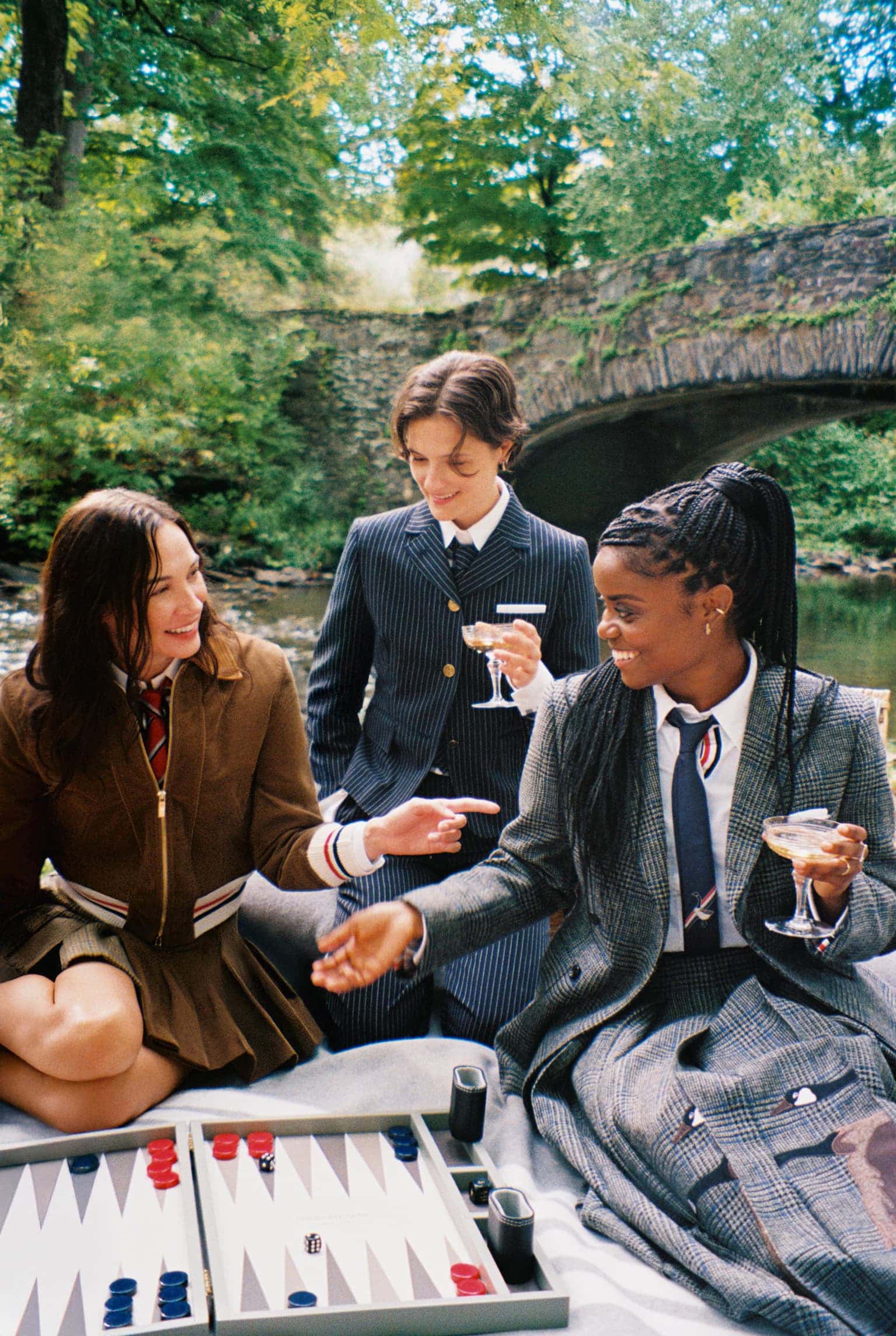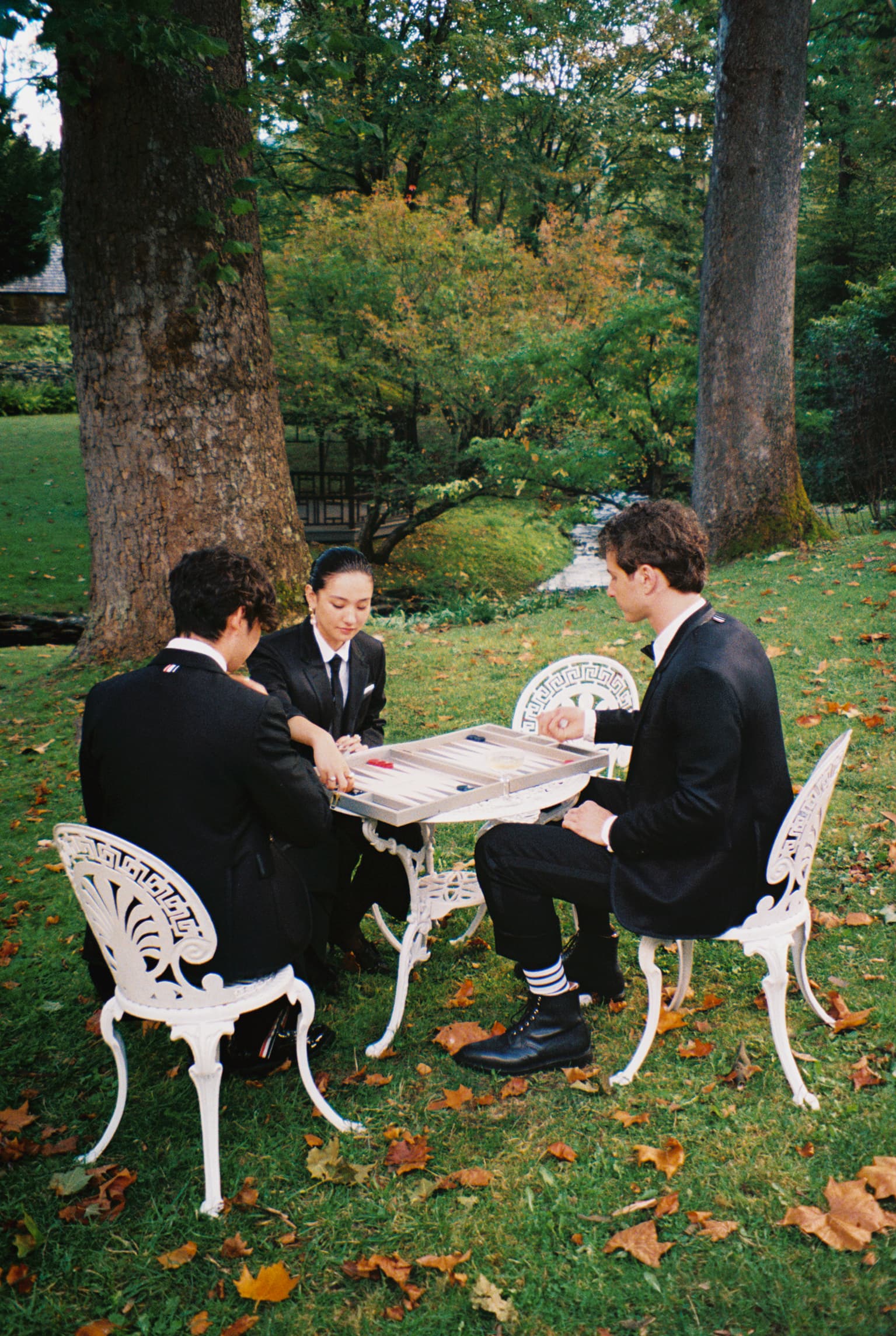 Photographed with quiet intimacy, the images recall a modern American tableau: friends gathered by a creek, backgammon boards on white iron tables, tuxedos softened by down-filled coats. Each frame is deliberate yet unforced, as though structure itself has learned to breathe. Browne’s signatures—4-bar stripes, collegiate plaids, shrunken tailoring—blend seamlessly into the autumnal terrain, transforming technical outerwear into symbols of belonging.