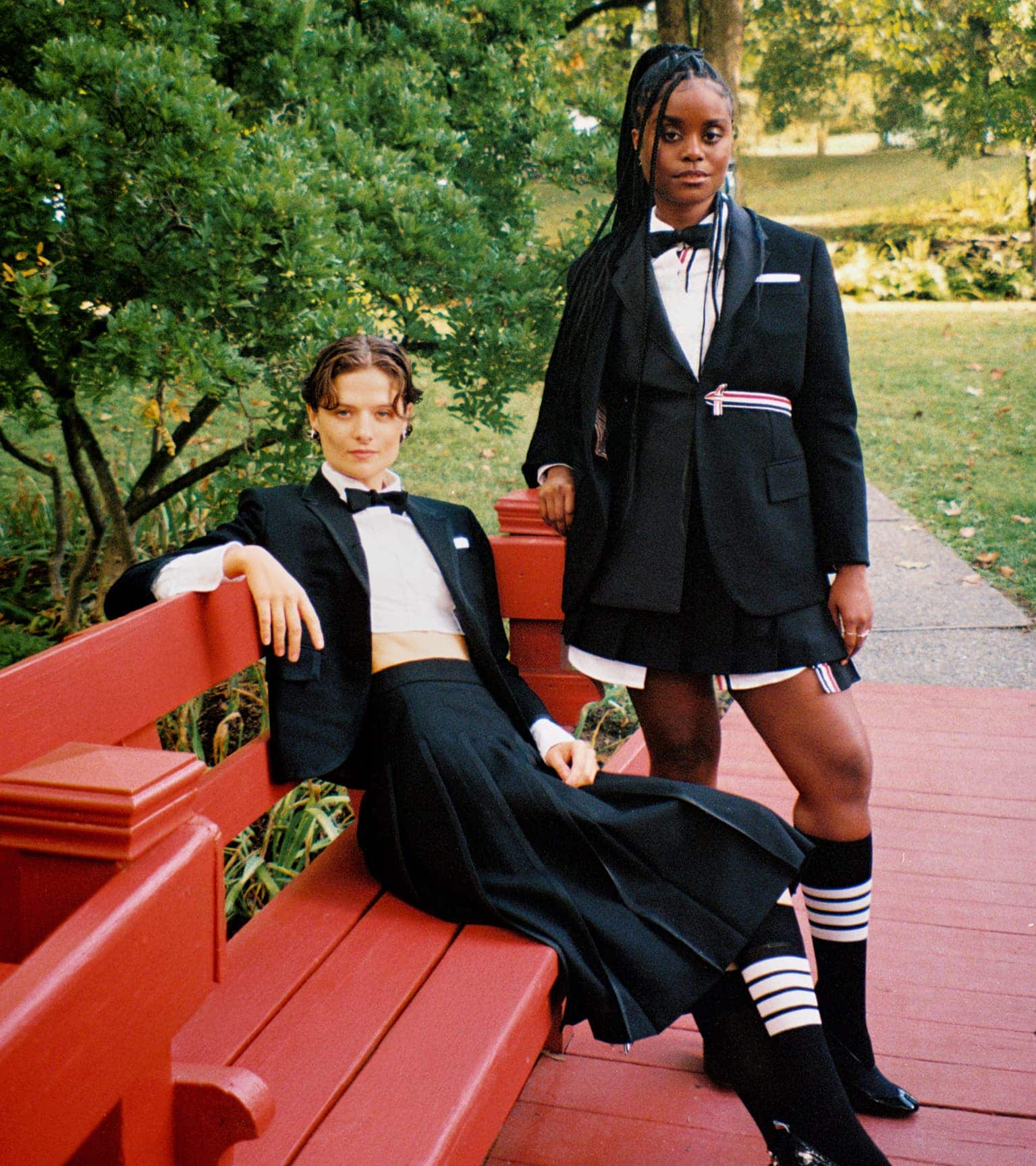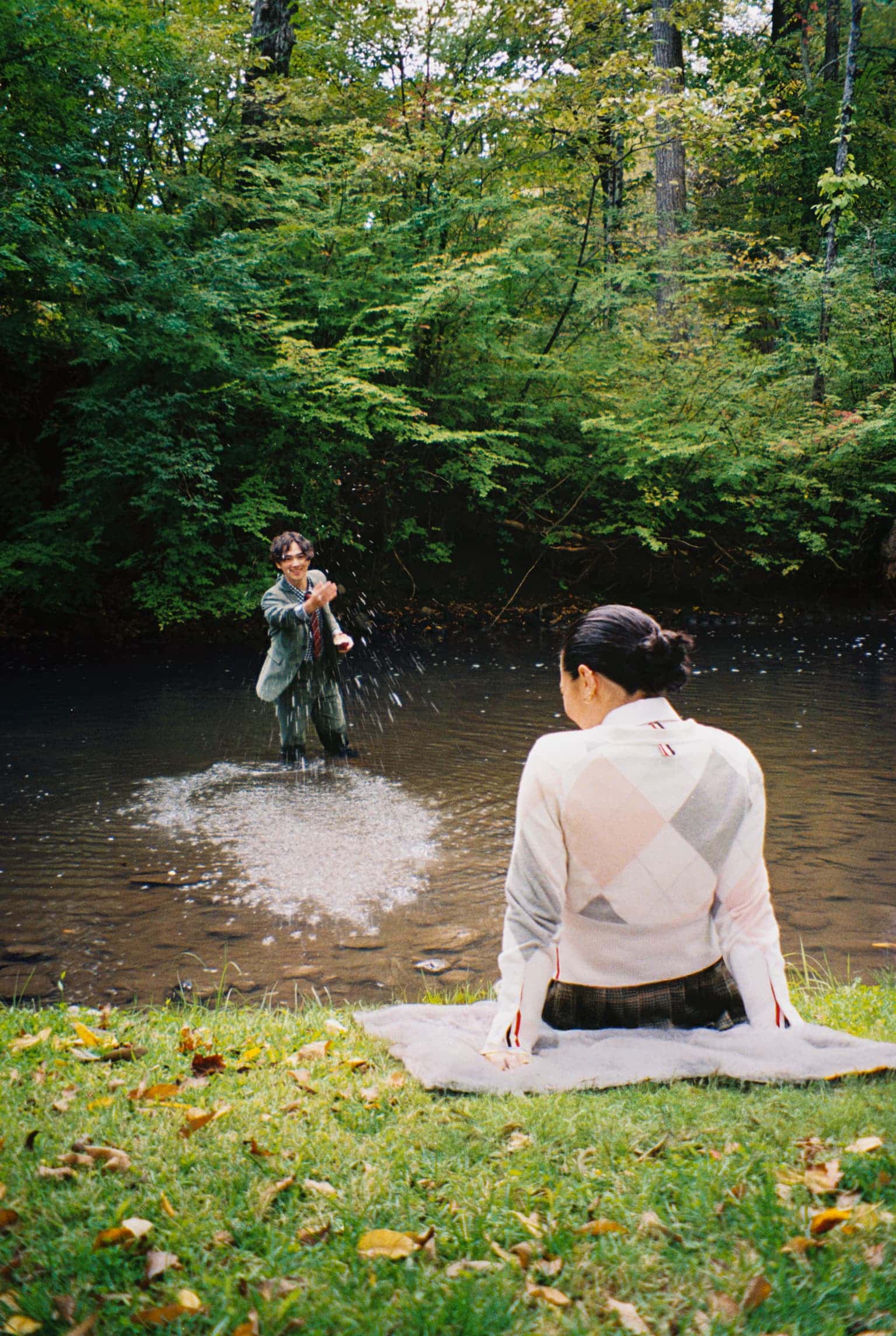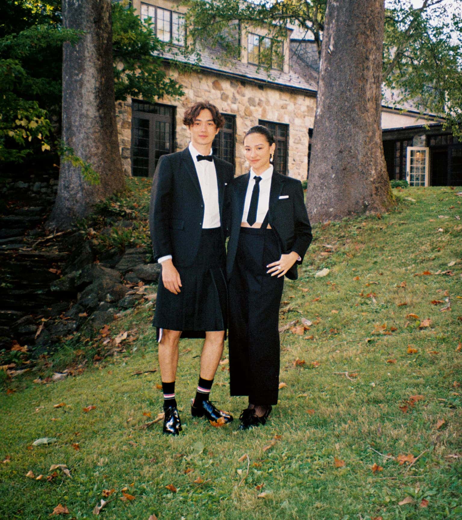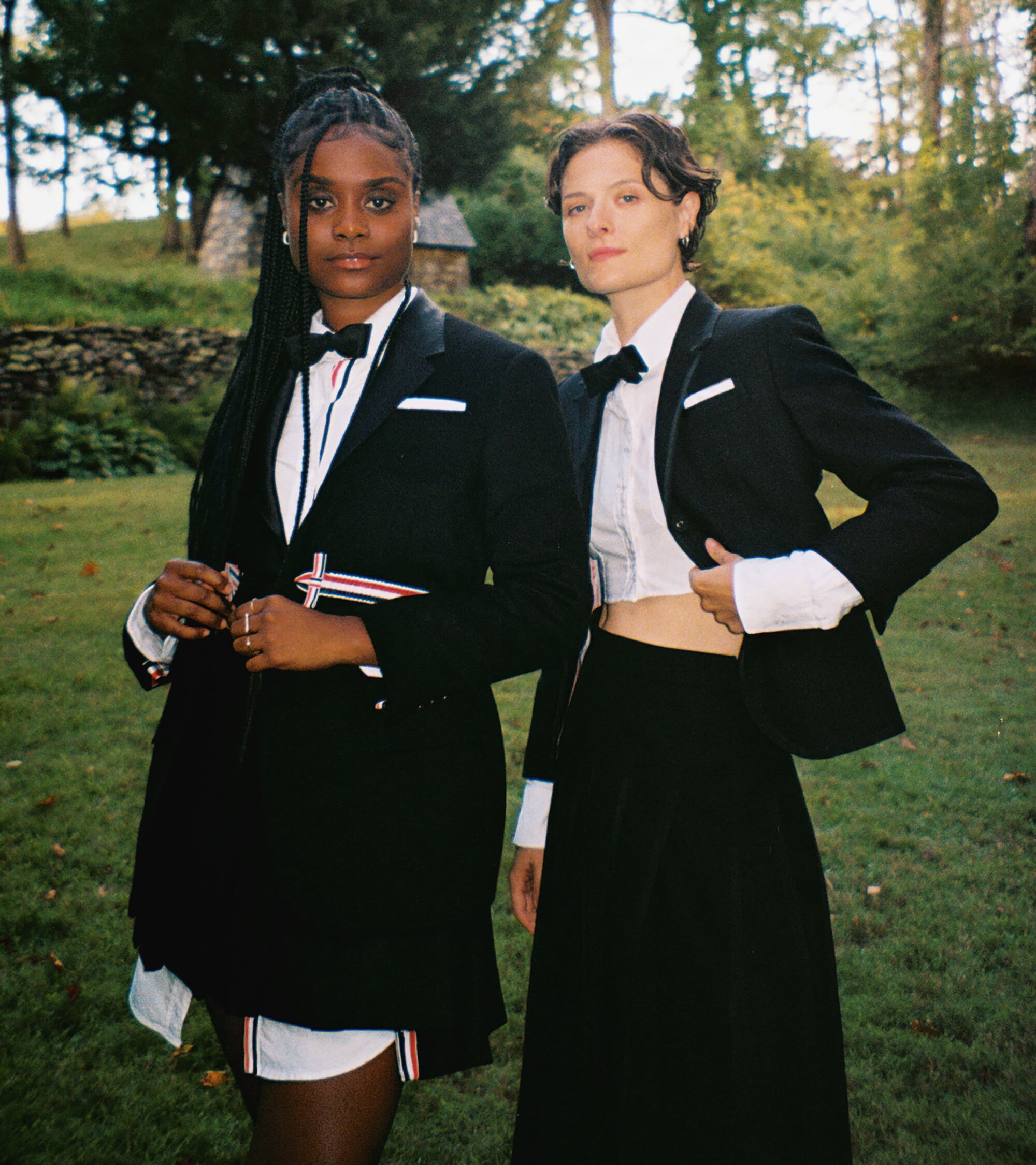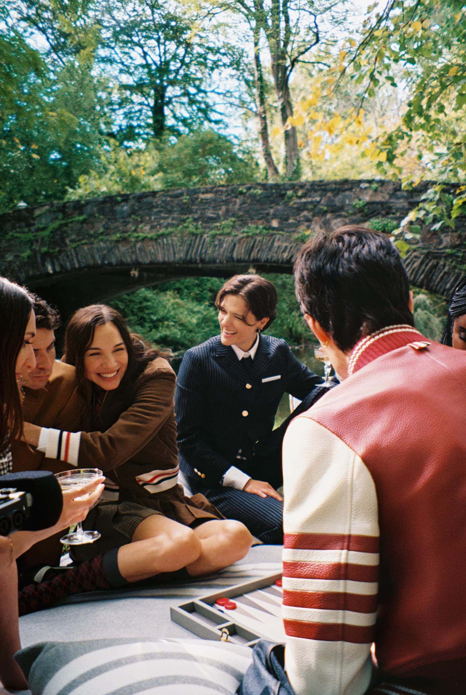 Photographed with quiet intimacy, the images recall a modern American tableau: friends gathered by a creek, backgammon boards on white iron tables, tuxedos softened by down-filled coats. Each frame is deliberate yet unforced, as though structure itself has learned to breathe. Browne’s signatures—4-bar stripes, collegiate plaids, shrunken tailoring—blend seamlessly into the autumnal terrain, transforming technical outerwear into symbols of belonging.