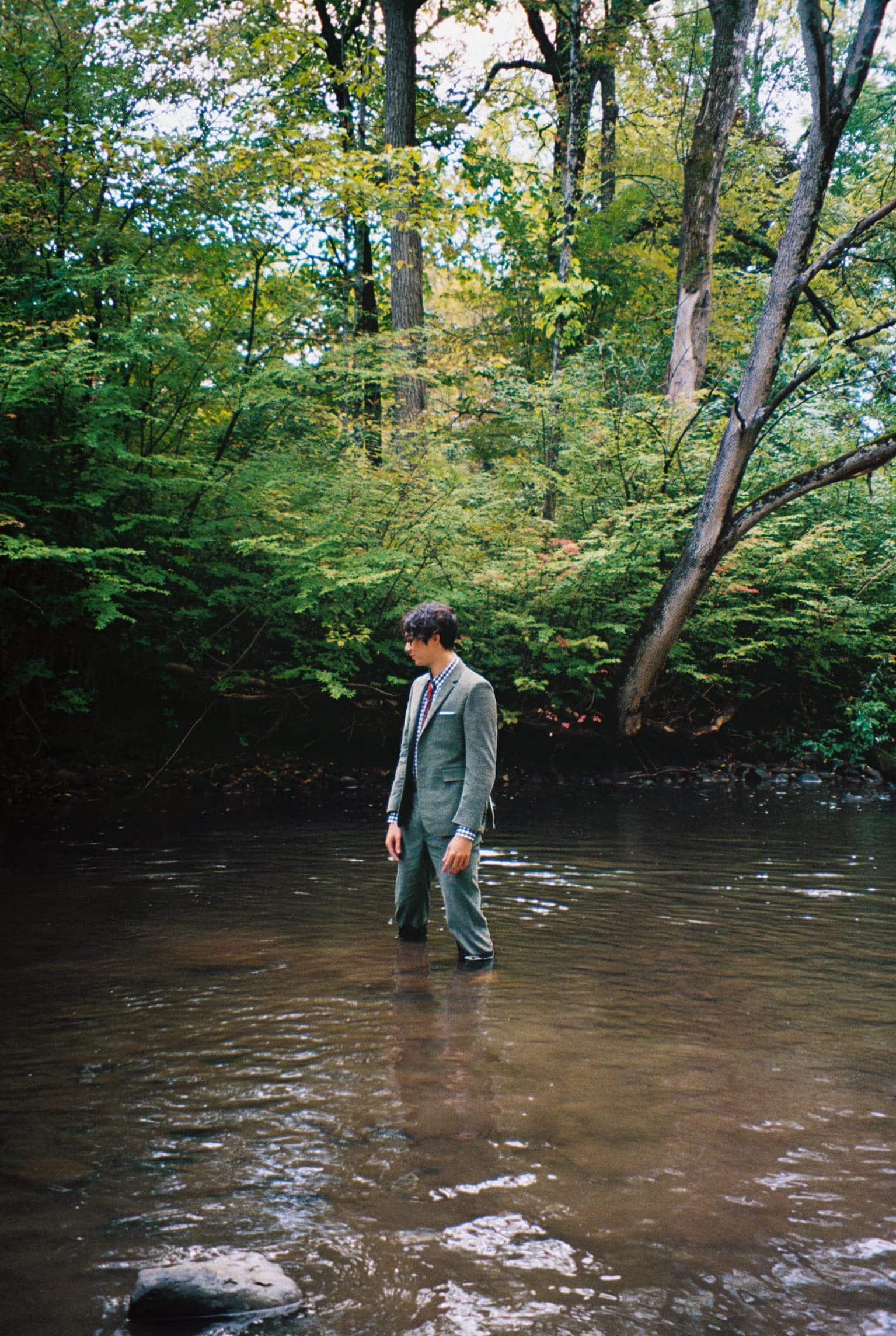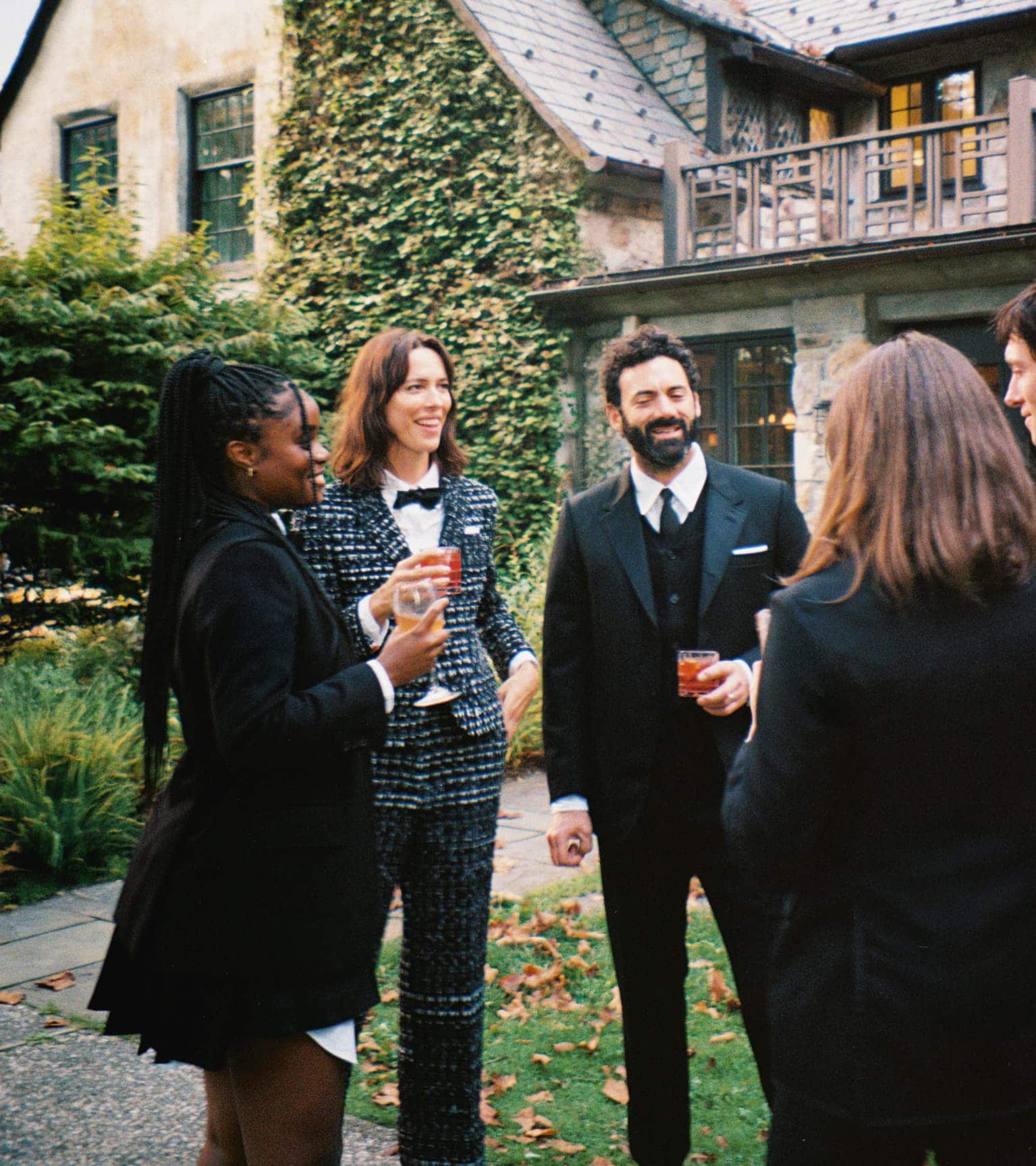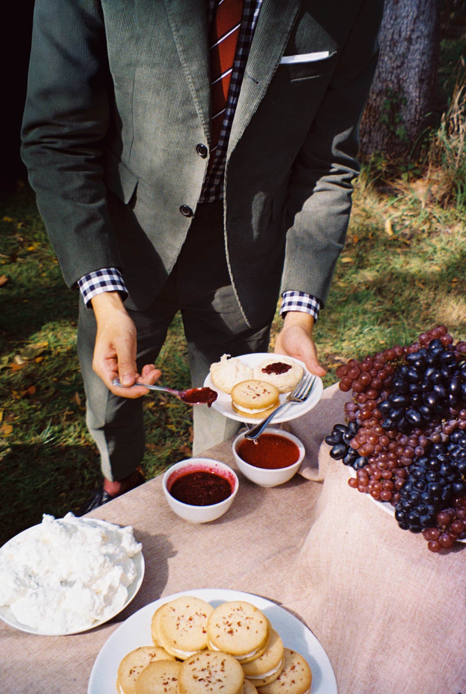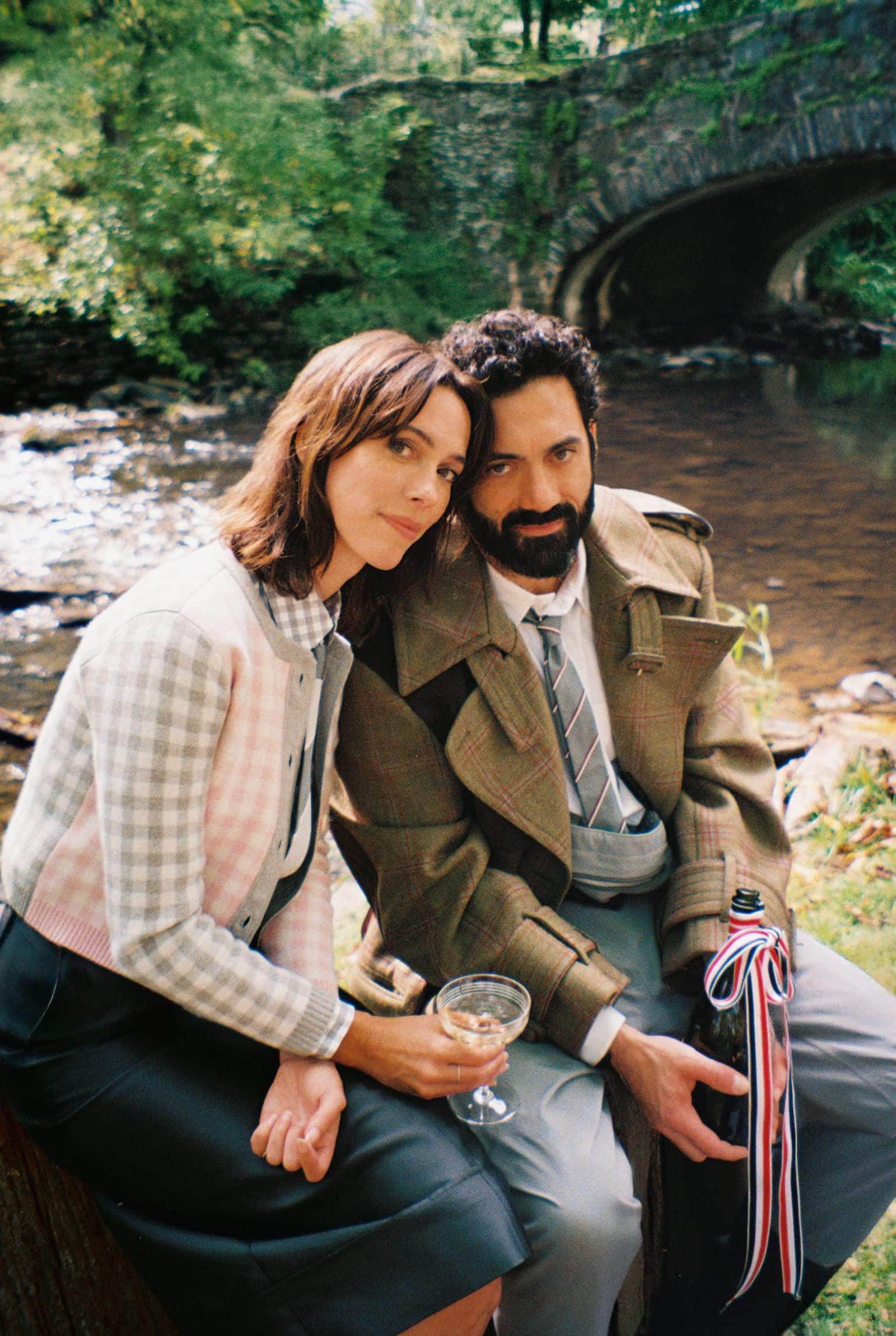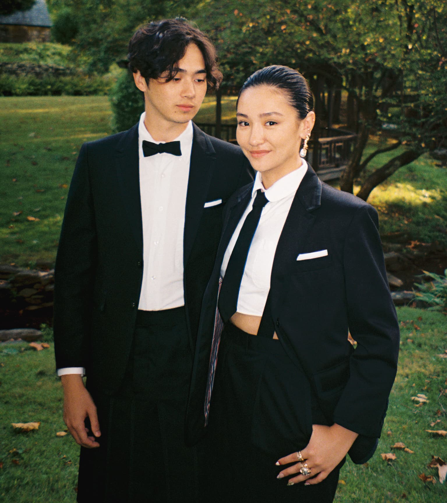 Photographed with quiet intimacy, the images recall a modern American tableau: friends gathered by a creek, backgammon boards on white iron tables, tuxedos softened by down-filled coats. Each frame is deliberate yet unforced, as though structure itself has learned to breathe. Browne’s signatures—4-bar stripes, collegiate plaids, shrunken tailoring—blend seamlessly into the autumnal terrain, transforming technical outerwear into symbols of belonging.