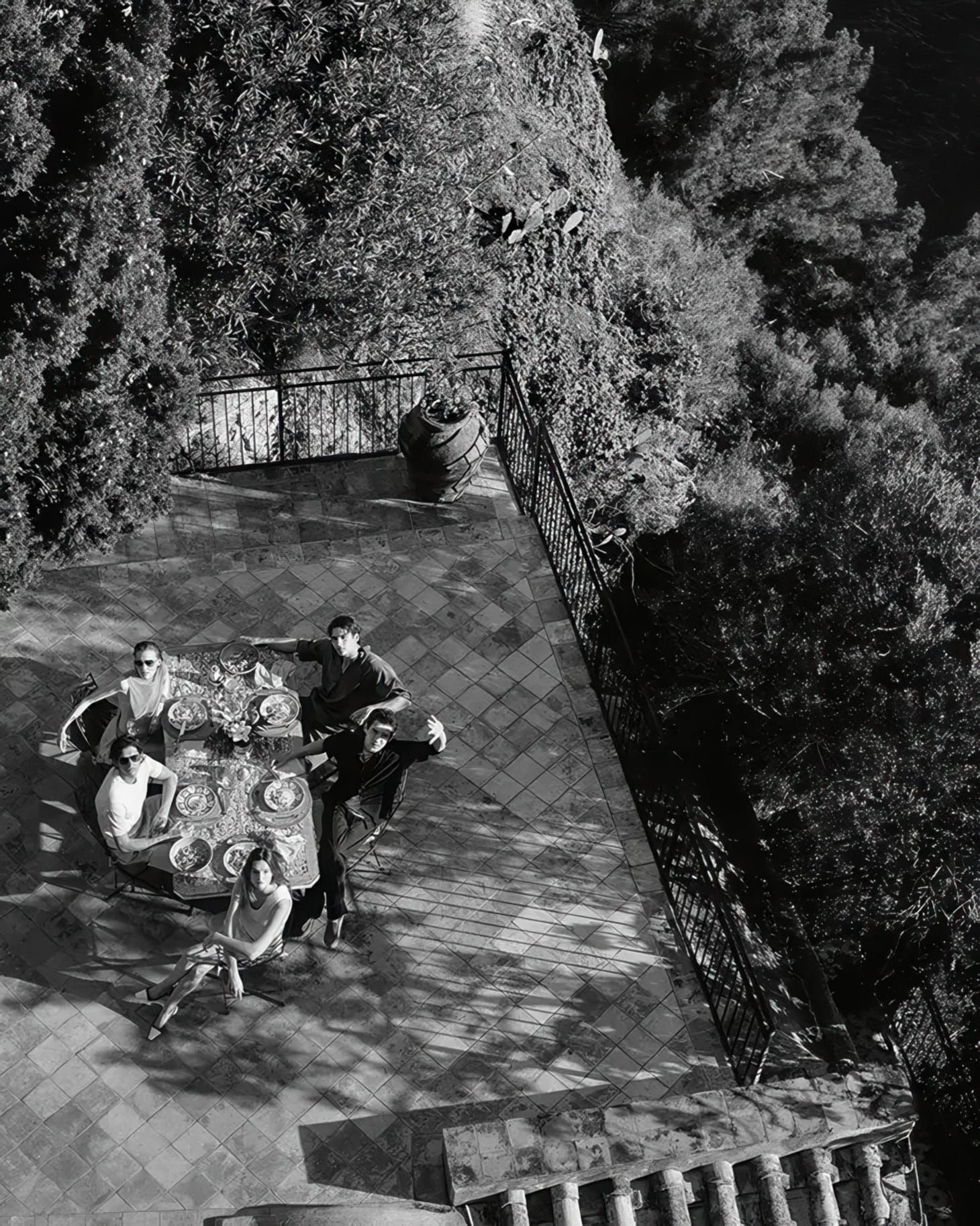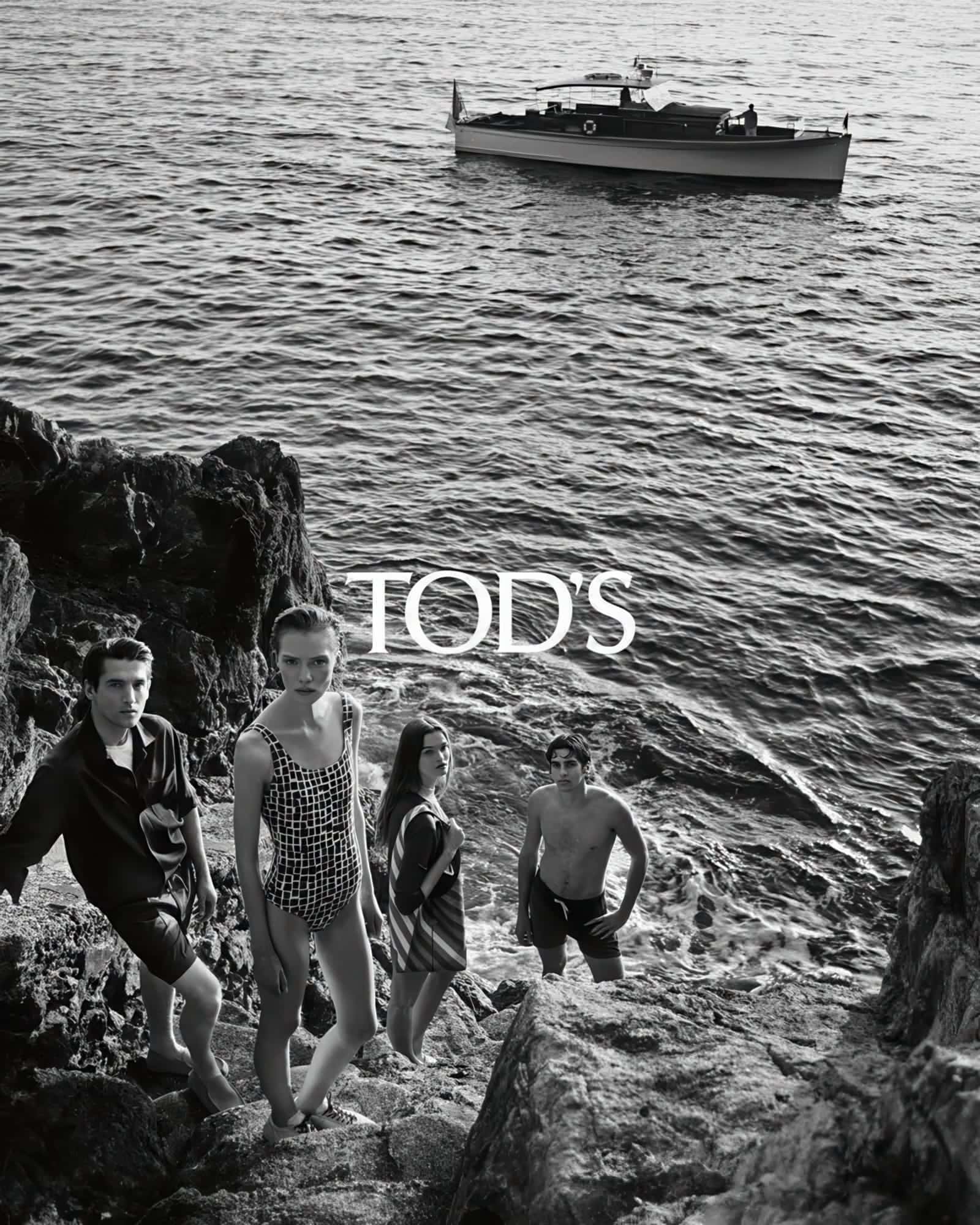 Visually, the campaign is defined by restraint. McLellan’s imagery alternates between crisp black-and-white compositions and warm, sunlit color scenes, creating a dialogue between timelessness and immediacy. The coastal setting—stone terraces, citrus groves, and open water—acts less as escapism and more as a controlled backdrop for subtle gestures. The group dynamics feel deliberately understated; models gather around tables, recline on loungers, or pause mid-conversation, suggesting ease without fully surrendering to spontaneity. This measured approach aligns with Tod’s broader visual language, where luxury is communicated through quiet continuity rather than overt spectacle.
