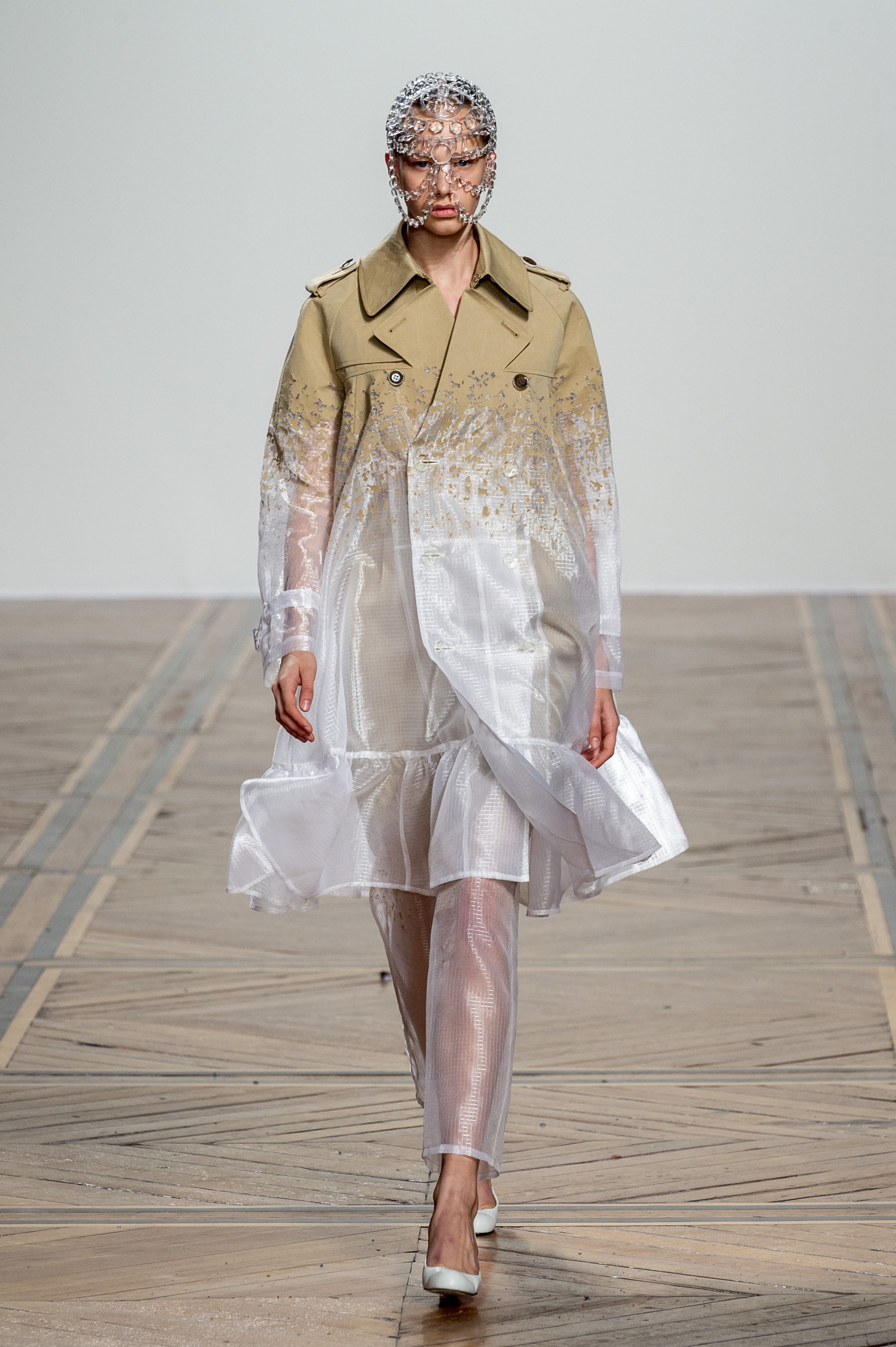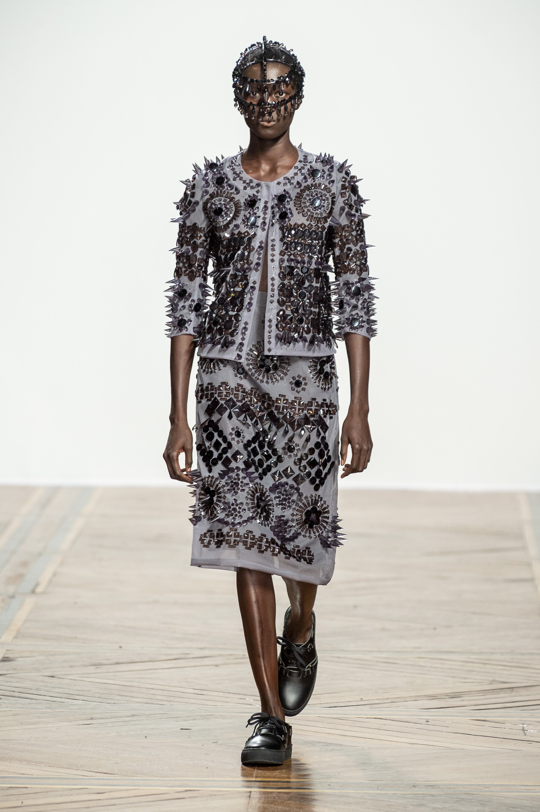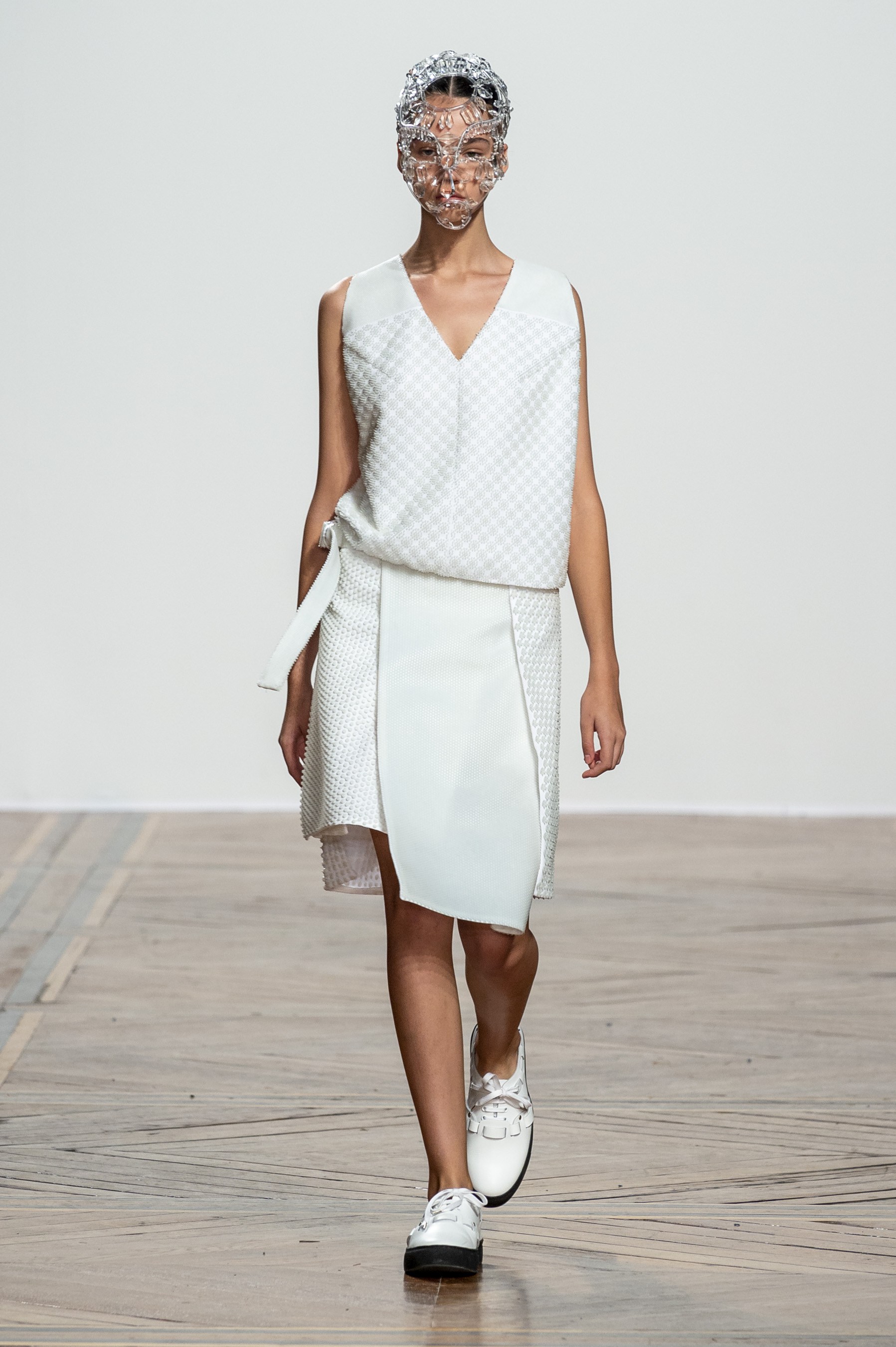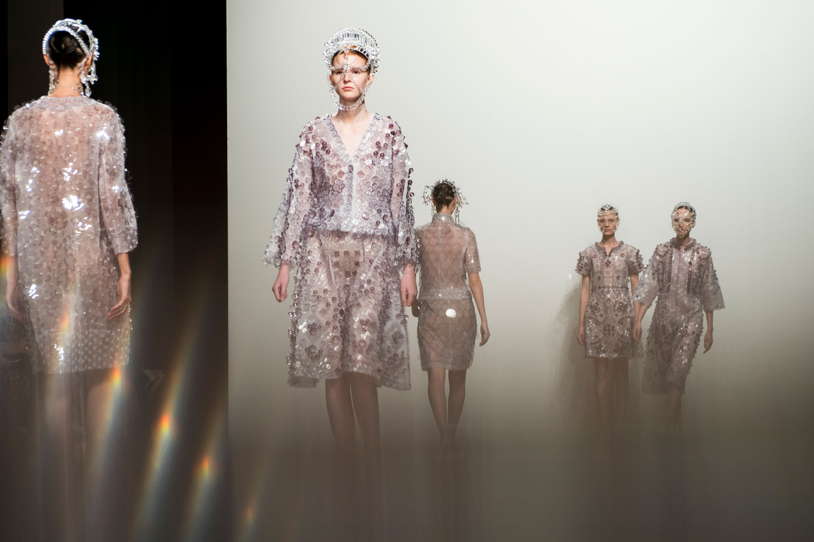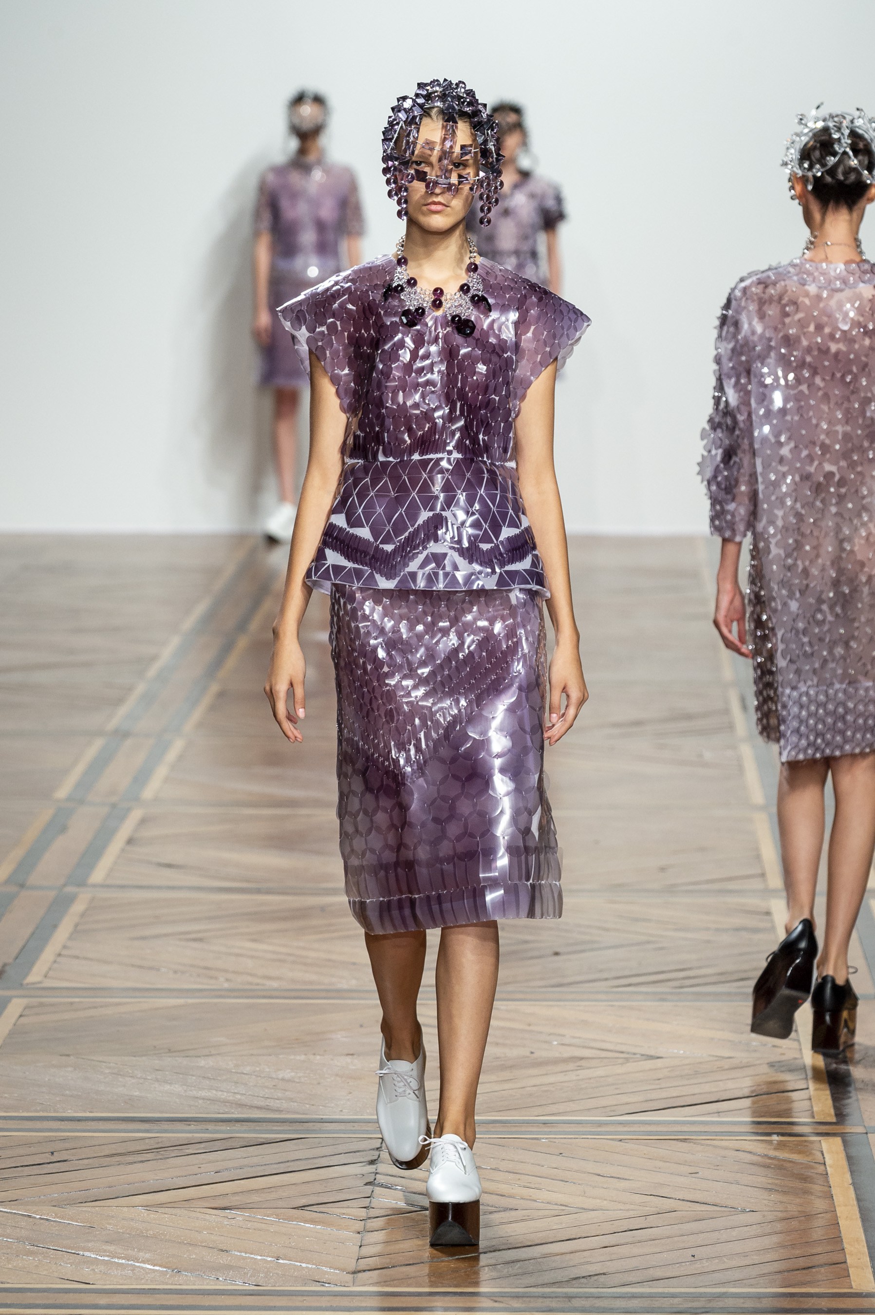 Designer Kunihiko Morinaga of Anrealage isn’t one to walk the same path season after season, however this season Morinaga sent the same outfit down the runway several times, though the coloring was different. Reason being was the clothes were made of a photochromic material that darkens when exposed to UV light. So the first looks in white, later showed up in purple. We give credit to the technical who is inventive enough to give a two for one outfit that changes with the light of the day.