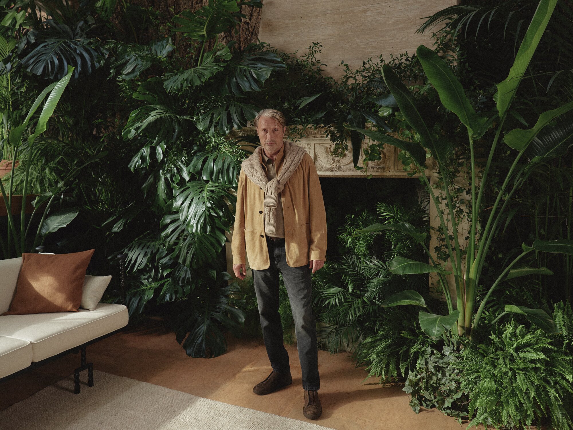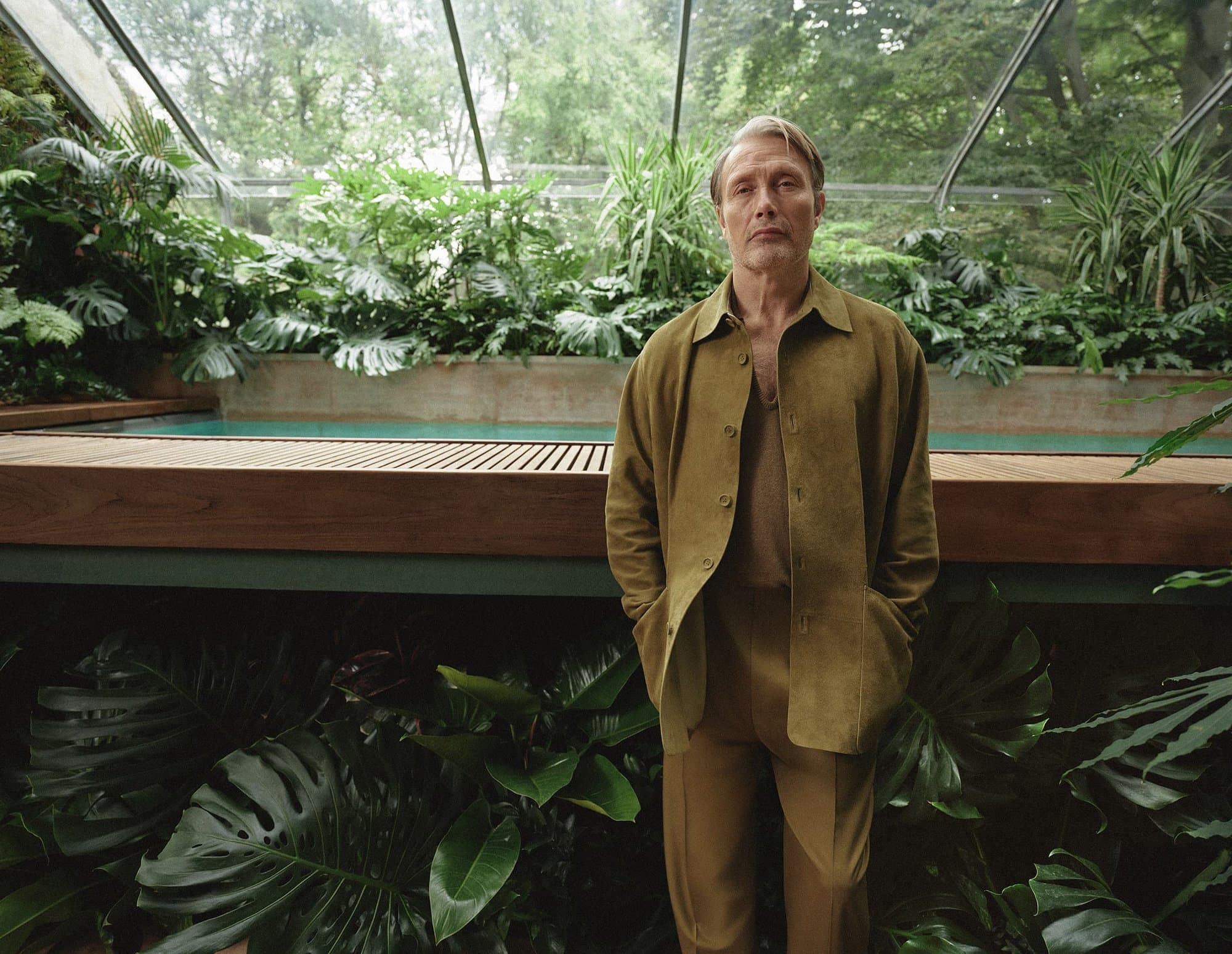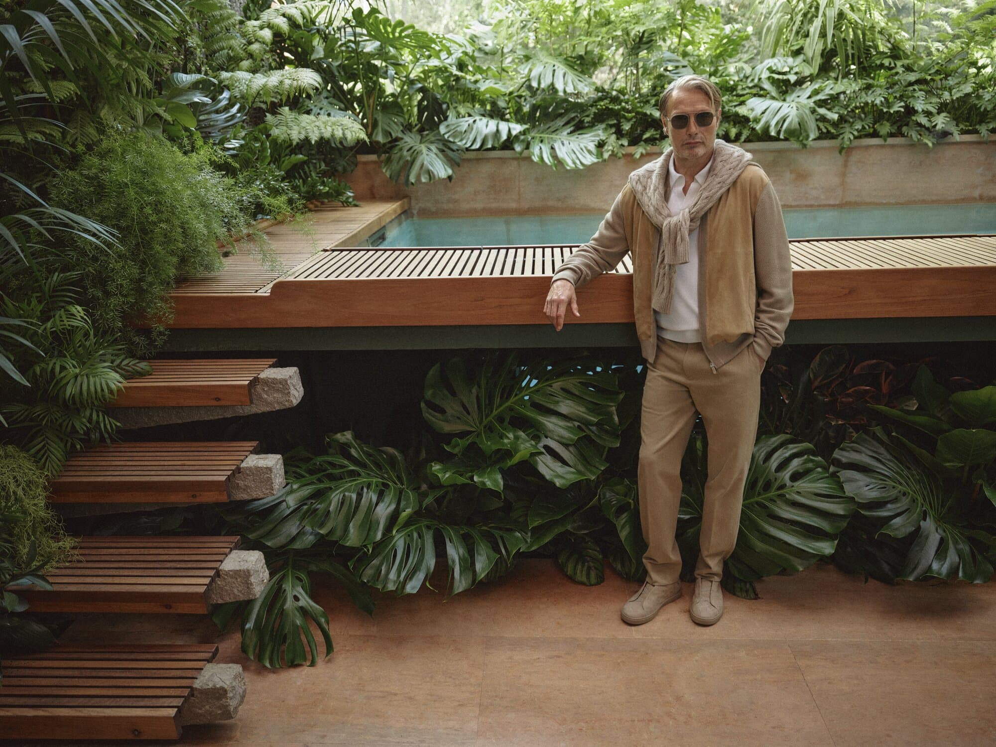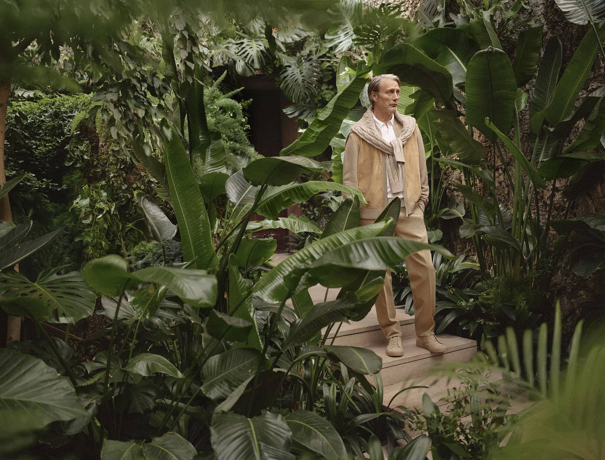 The imagery situates Mikkelsen within a world shaped by glass, water, light, and foliage—spaces originally conceived by legendary landscape architect Pietro Porcinai. These are not decorative gardens but lived-in environments, conceived as extensions of domestic and creative life. The mood is calm, architectural, and deeply human. Fabrics appear to move with the terrain rather than against it, blurring distinctions between inside and outside, dressed and lived. It’s a vision of elegance that doesn’t demand attention, but rewards it.