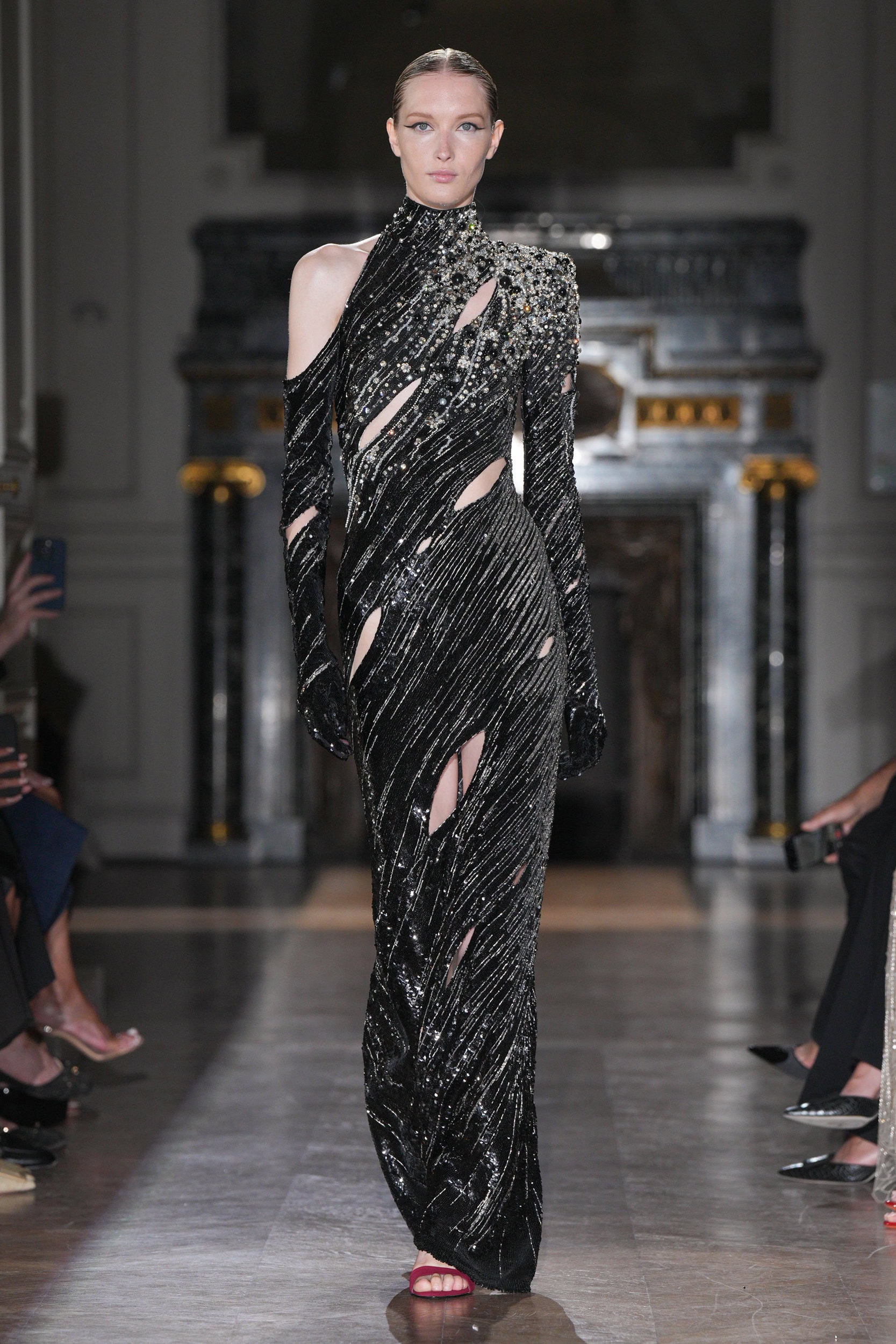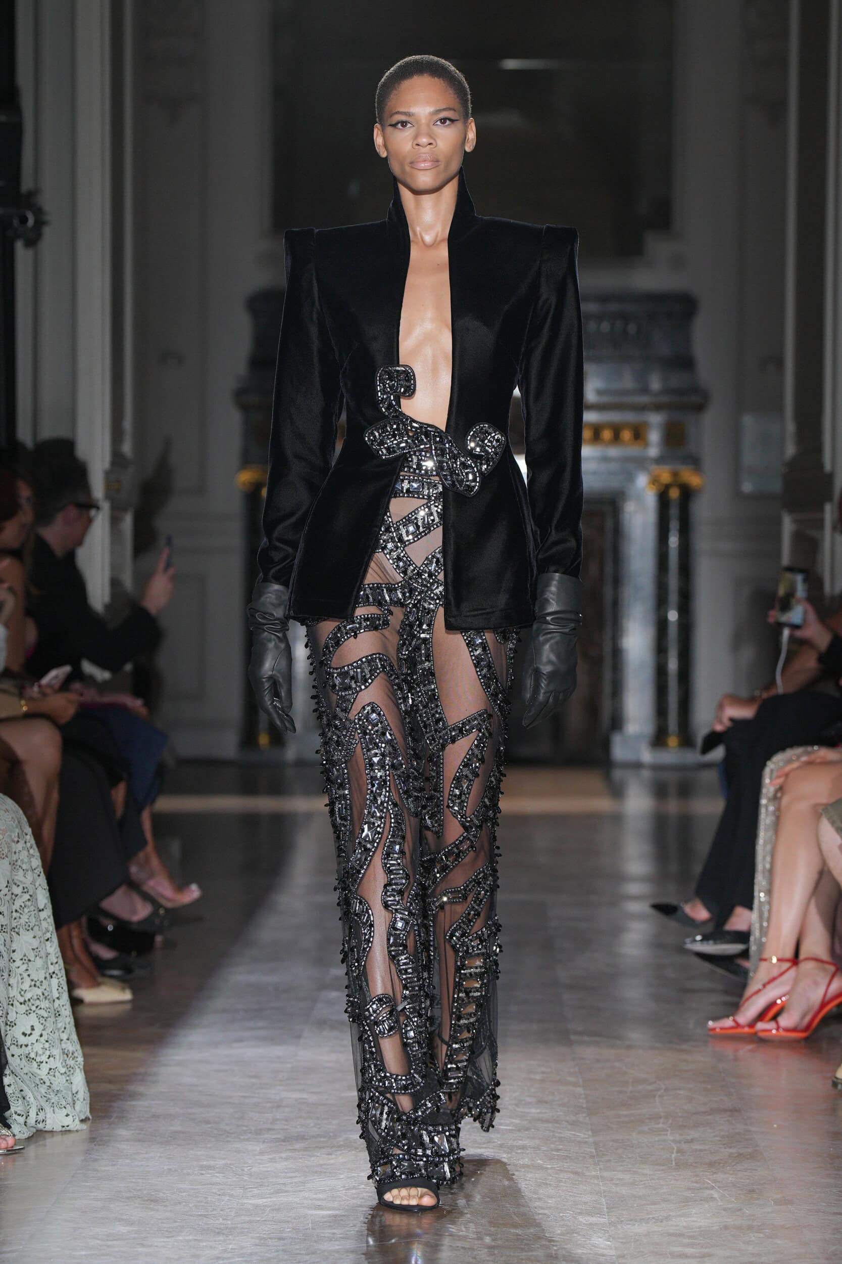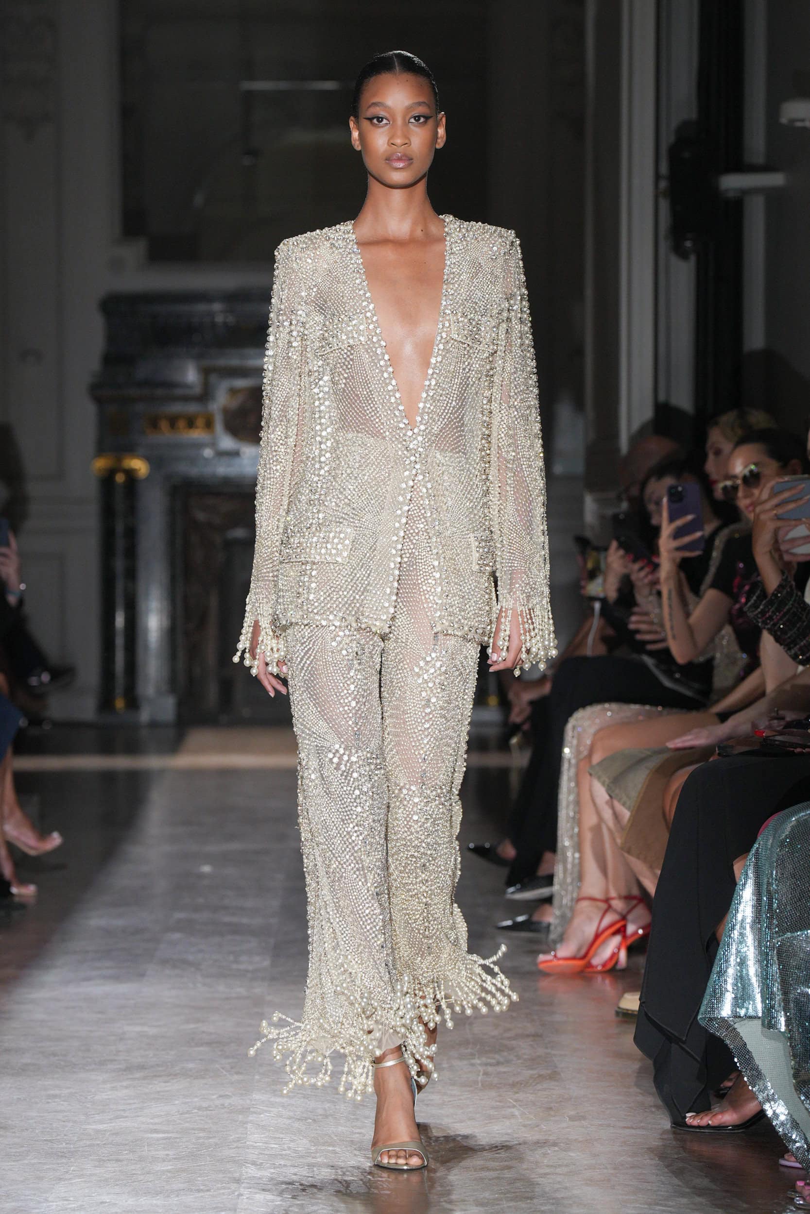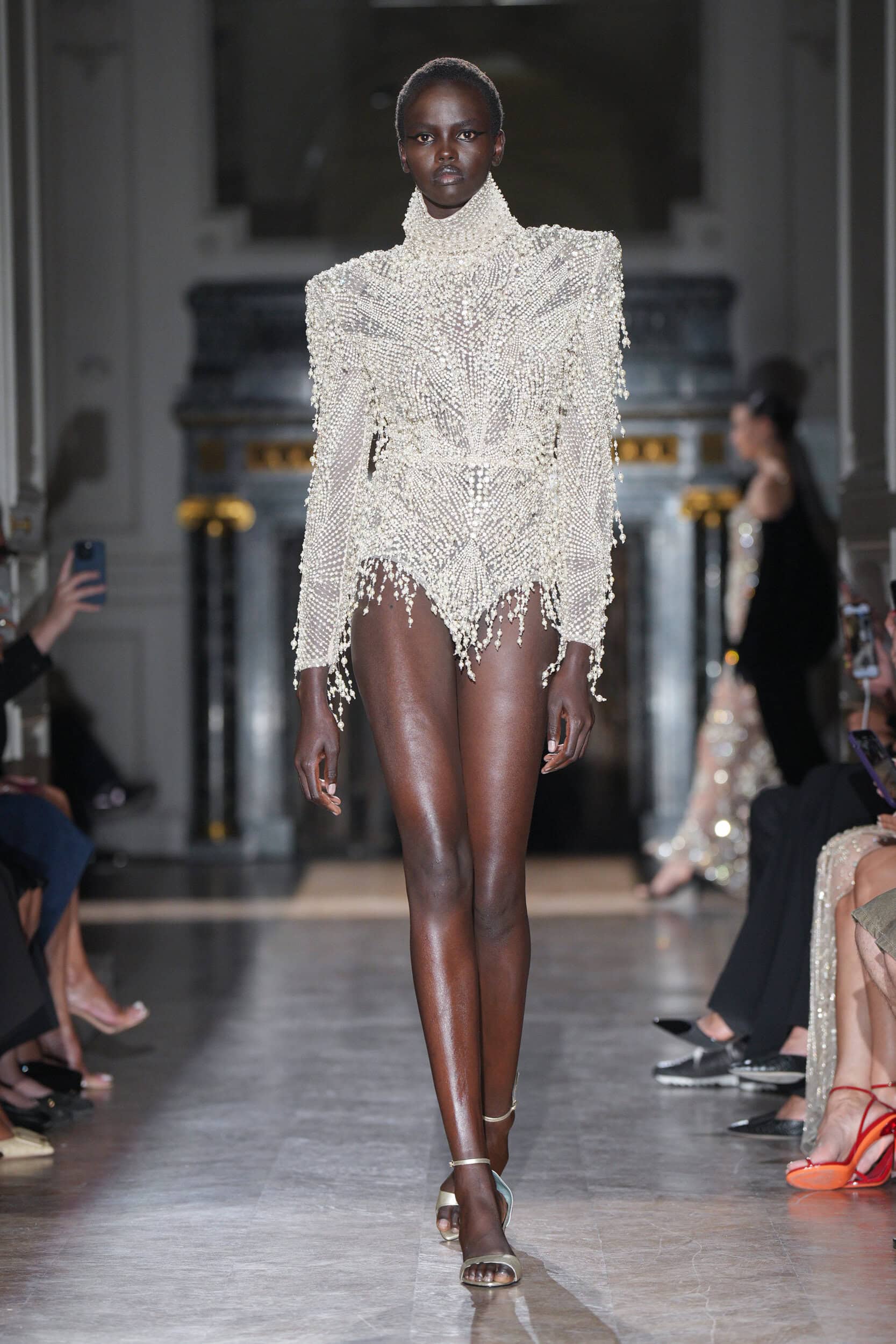 The collection featured jagged shards on minidresses, tailored leather jackets, and diagonal draping, symbolizing psychological wounds on display for all to see. Explosive embroideries and pearl-bedecked bodysuits added to the dramatic narrative, evoking Champagne bubbles and tears.