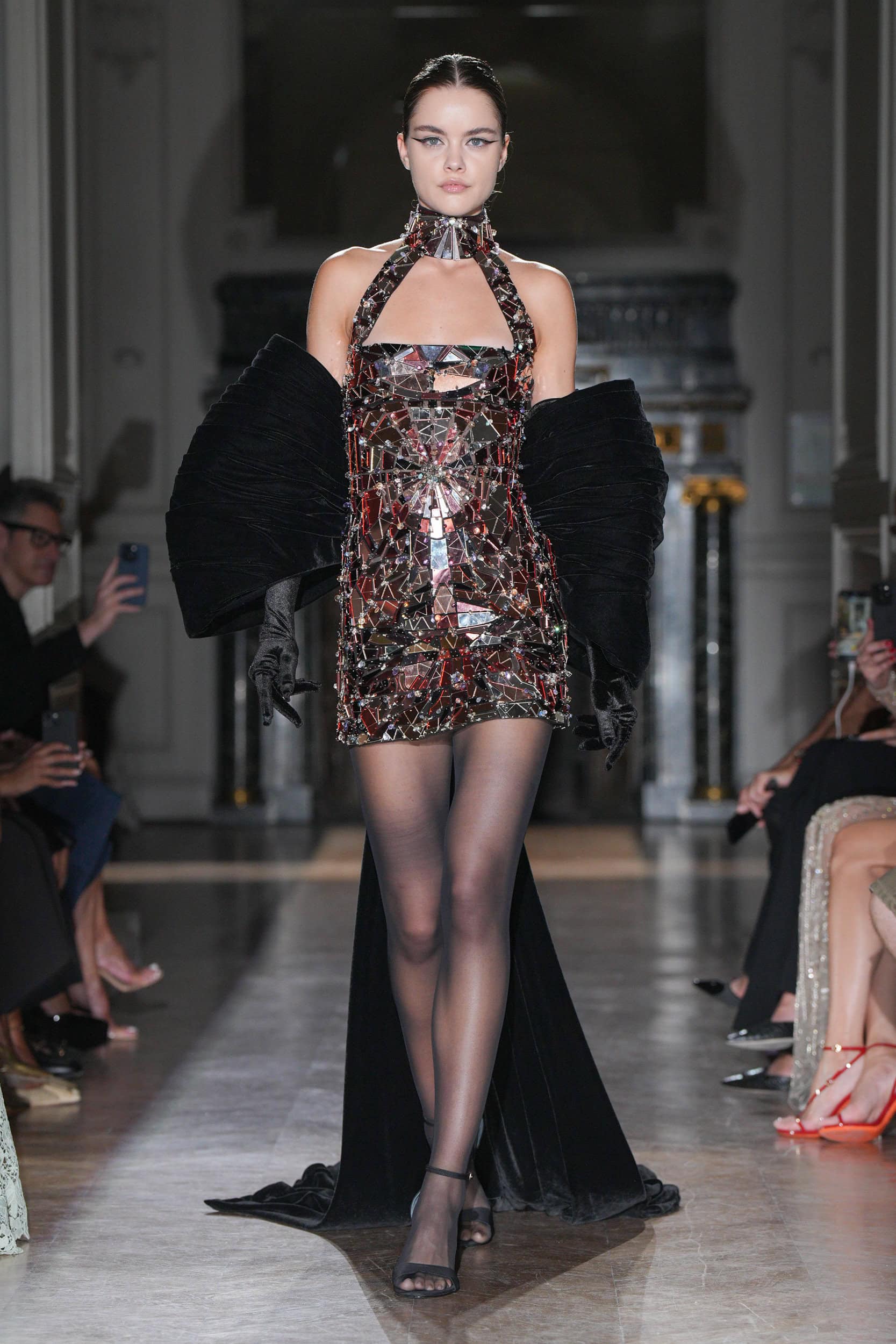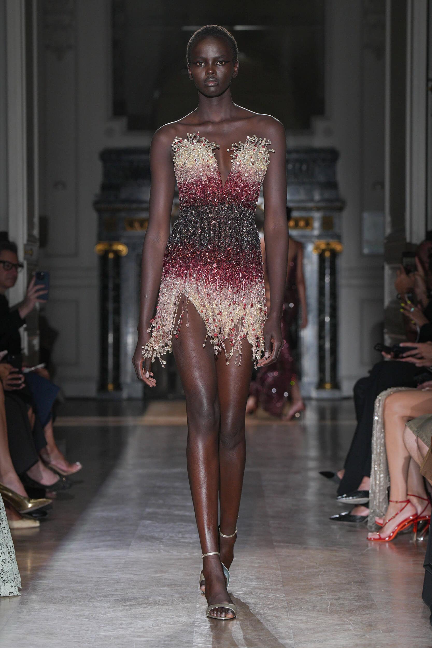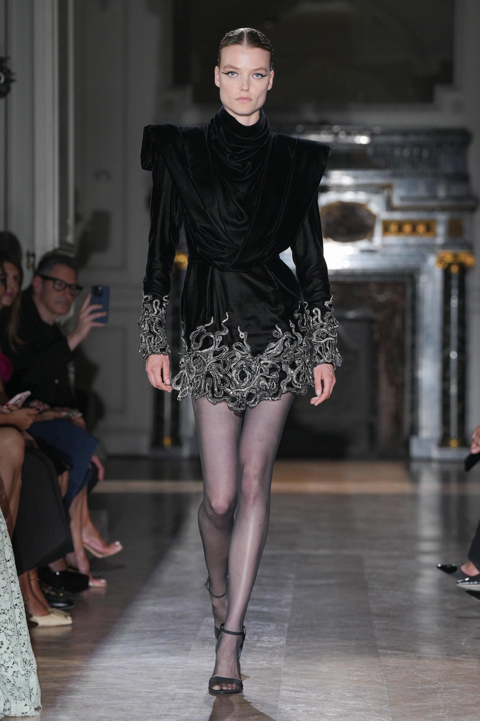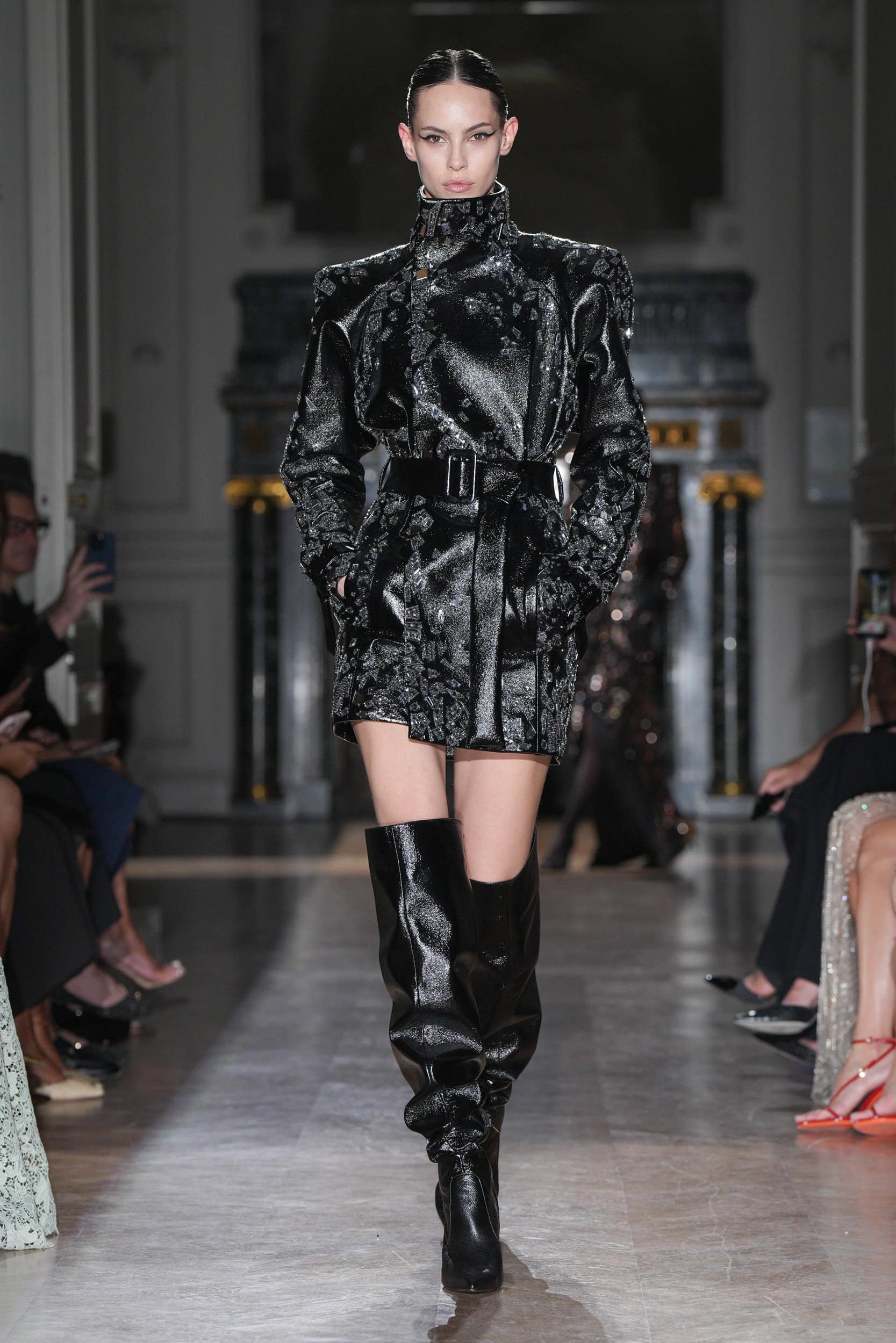 The collection featured jagged shards on minidresses, tailored leather jackets, and diagonal draping, symbolizing psychological wounds on display for all to see. Explosive embroideries and pearl-bedecked bodysuits added to the dramatic narrative, evoking Champagne bubbles and tears.