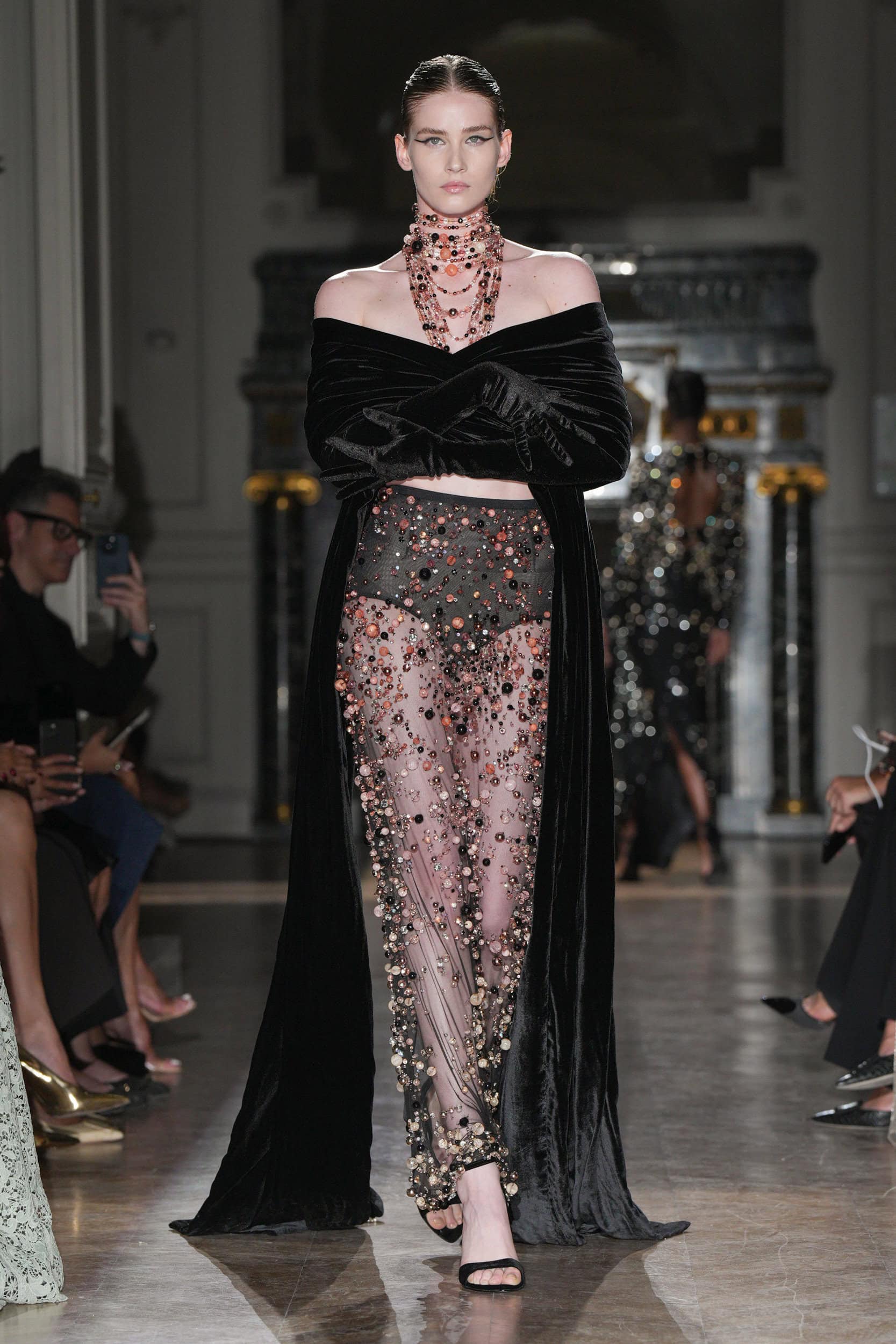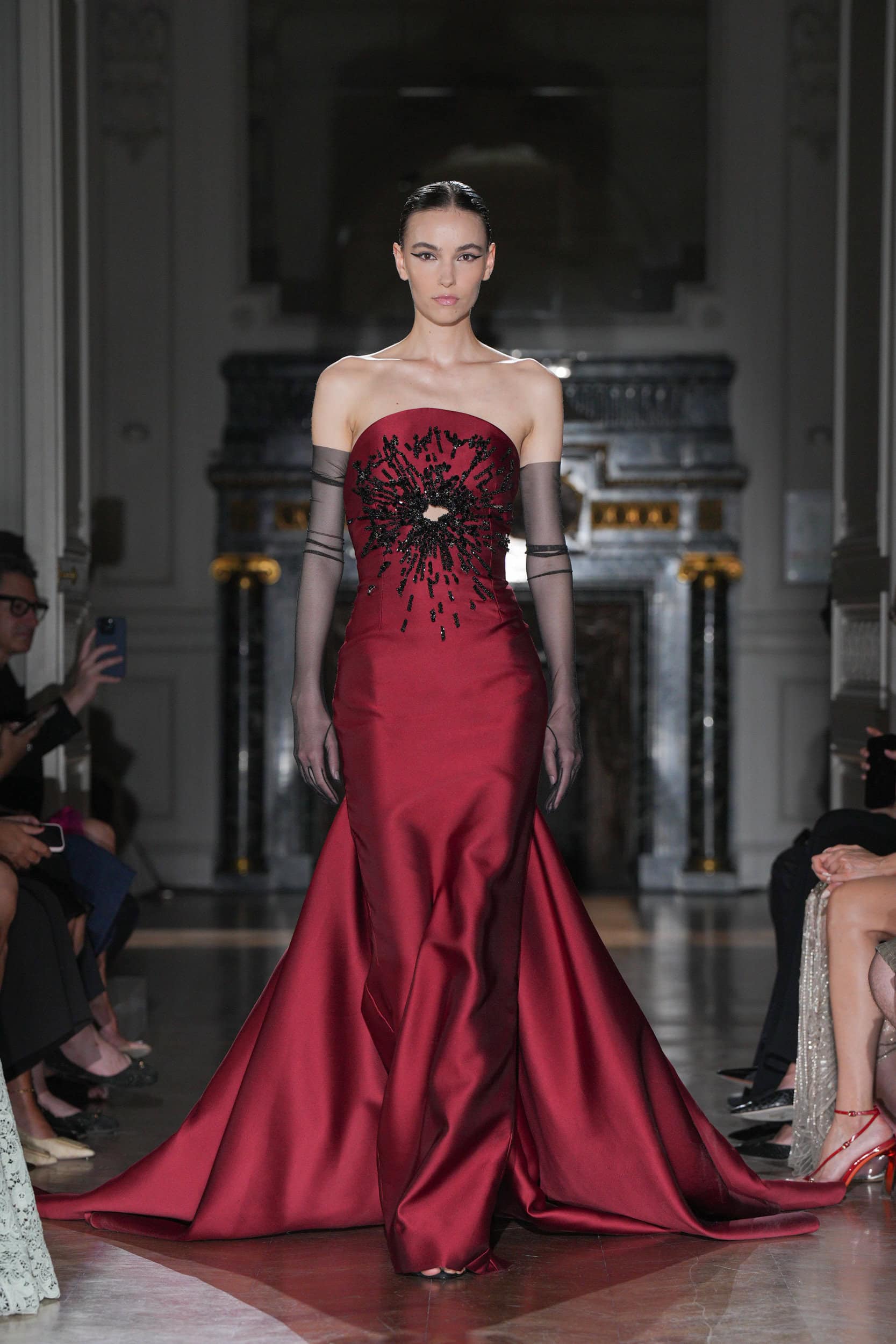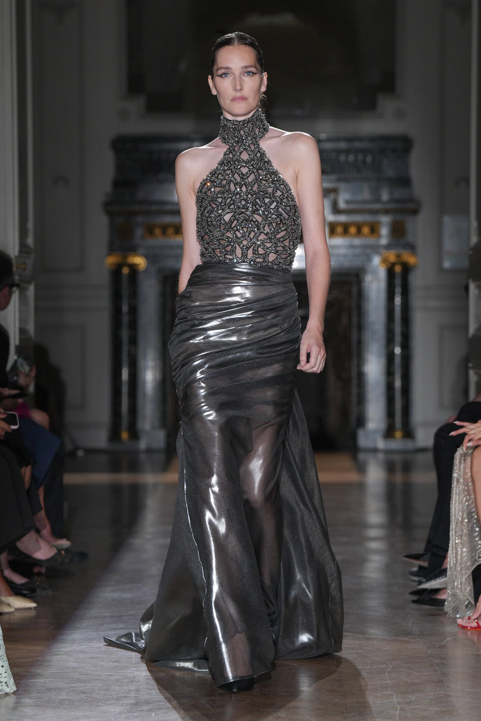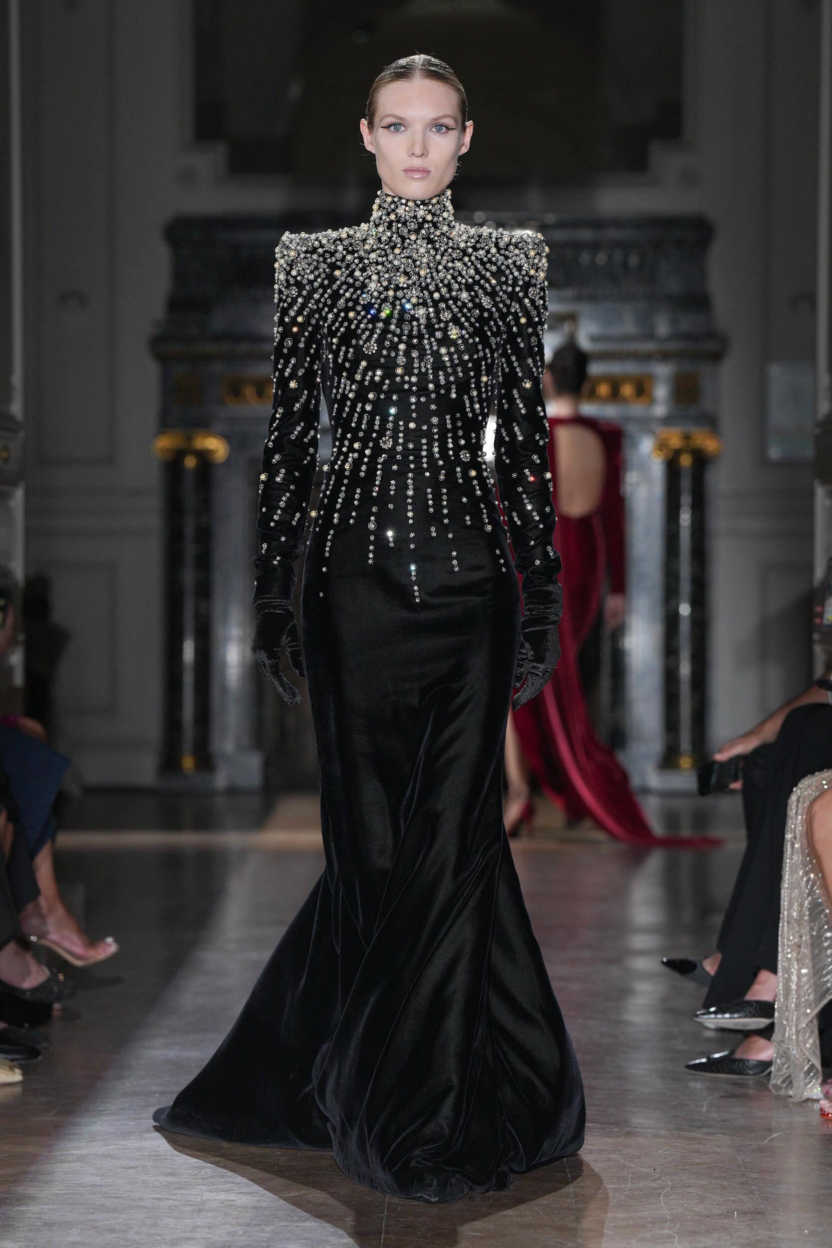 One satin number with a hole surrounded by black embroideries suggested a bullet wound, with show notes stating, “She had no weapons.” Murad’s silhouettes emphasized elongated figures, high necklines, square shoulders, and velvet or chiffon stoles trailing behind the models on the runway.