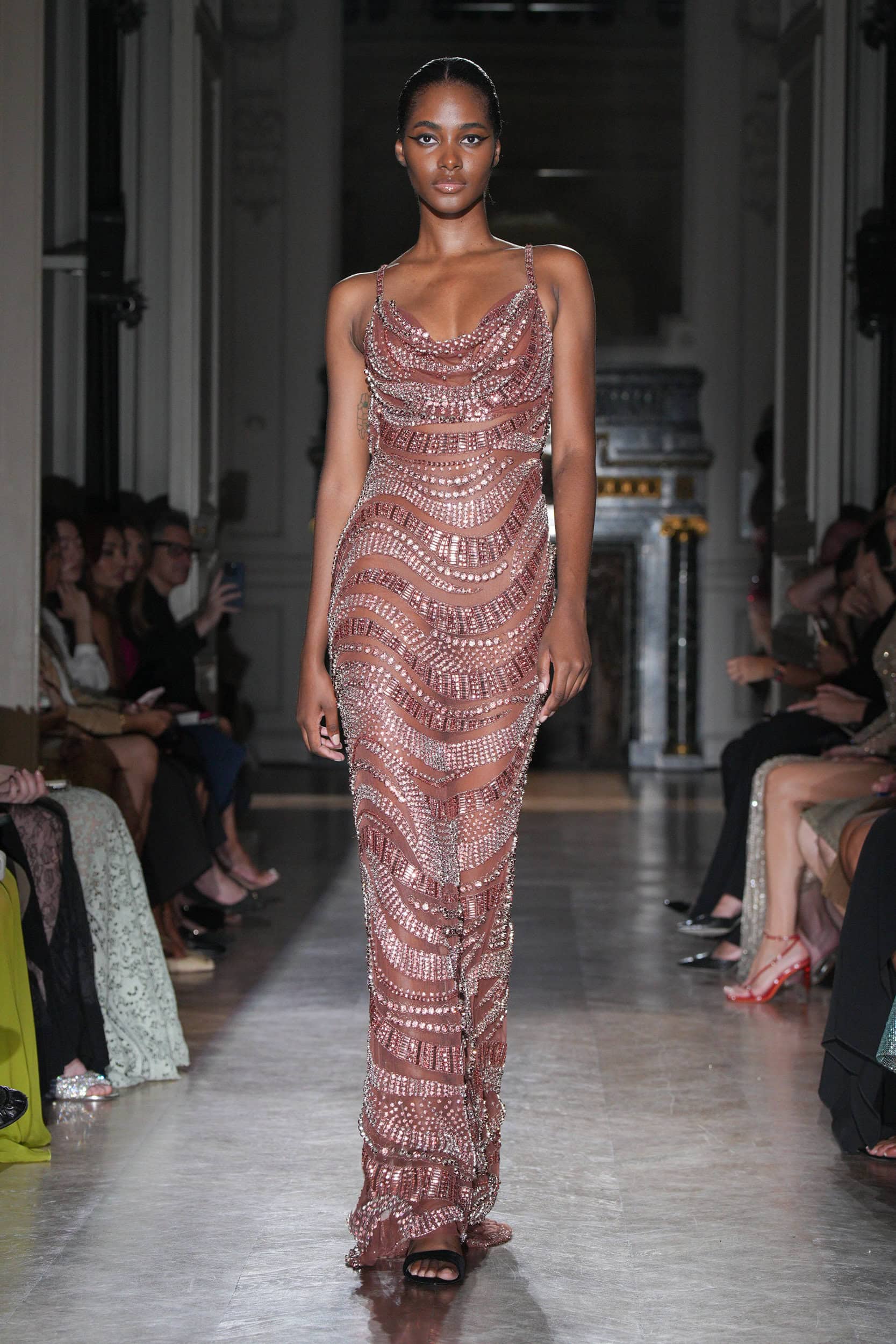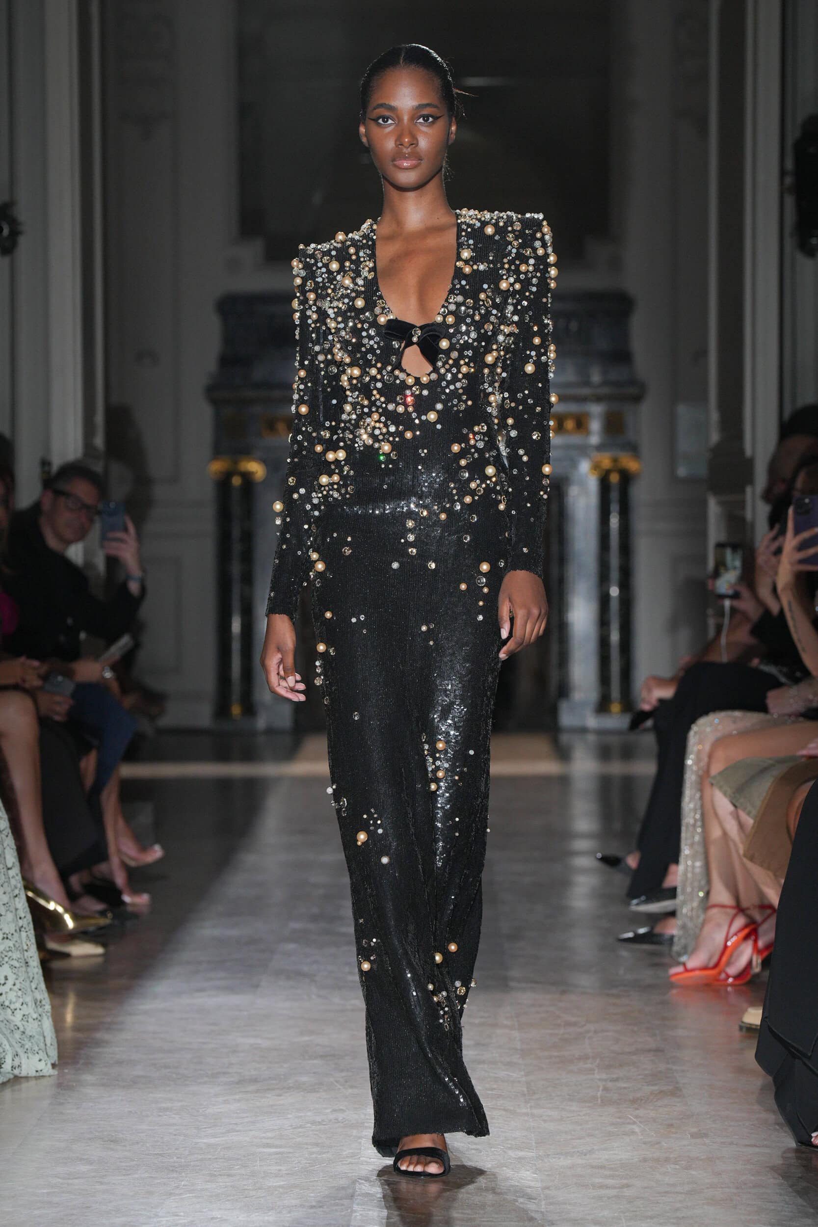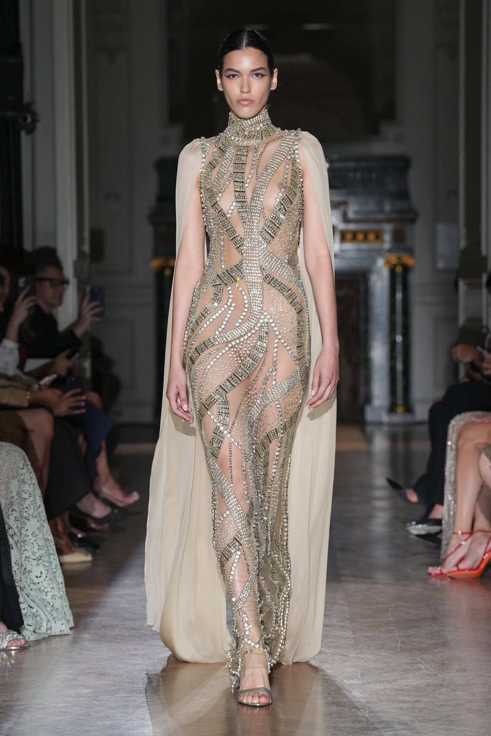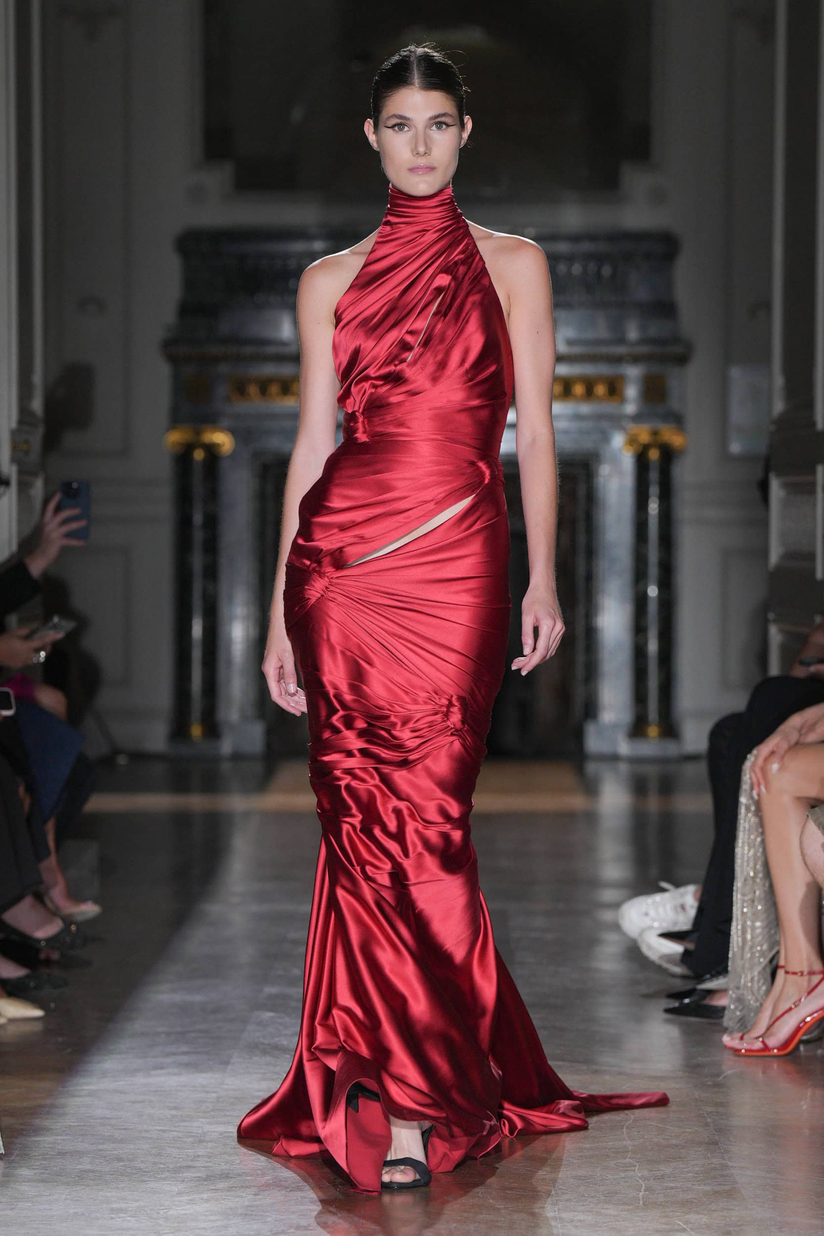 One satin number with a hole surrounded by black embroideries suggested a bullet wound, with show notes stating, “She had no weapons.” Murad’s silhouettes emphasized elongated figures, high necklines, square shoulders, and velvet or chiffon stoles trailing behind the models on the runway.